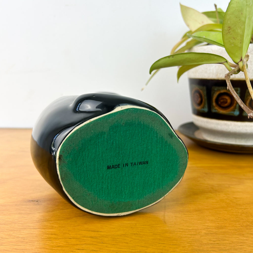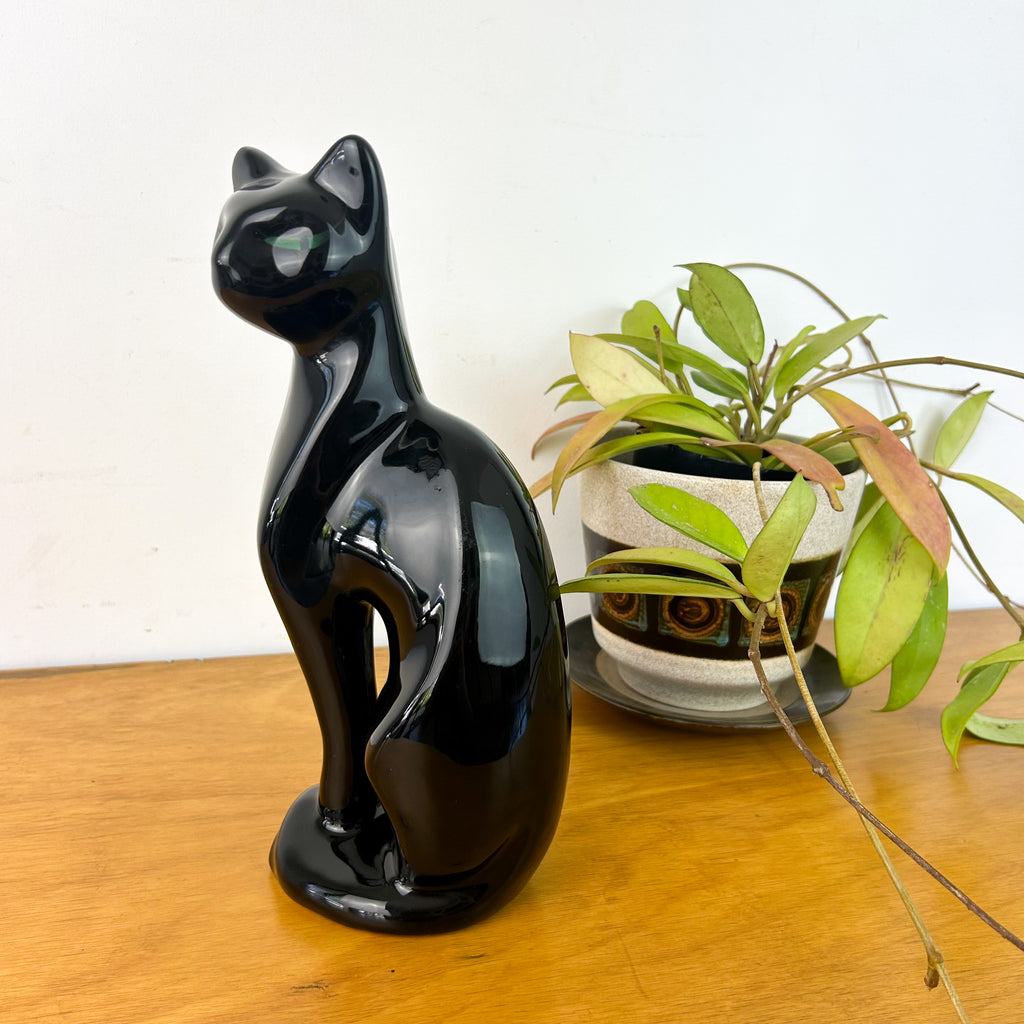 Vintage black ceramic cat statue, circa 60s/70s. Beautiful deep green hand painted eyes.