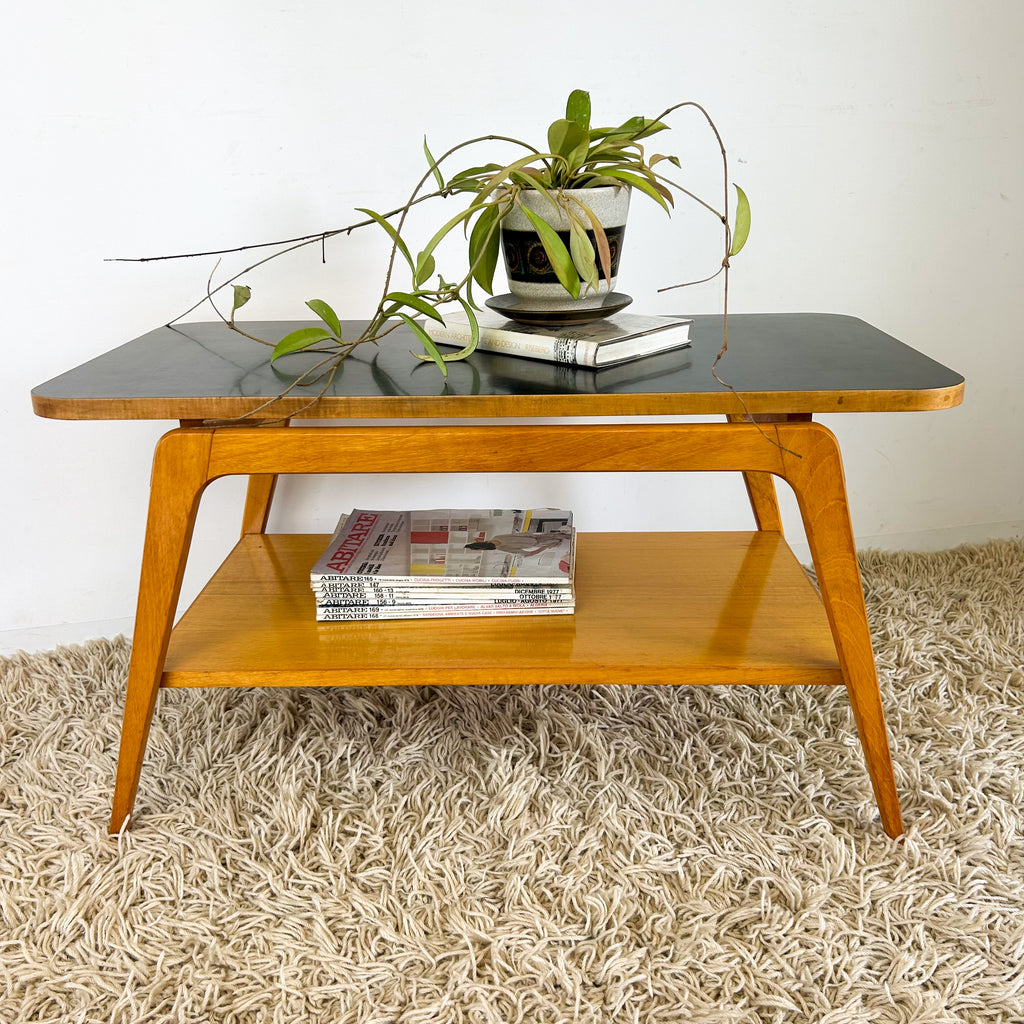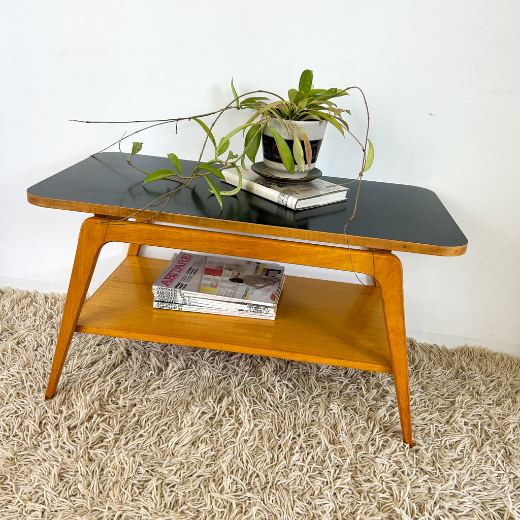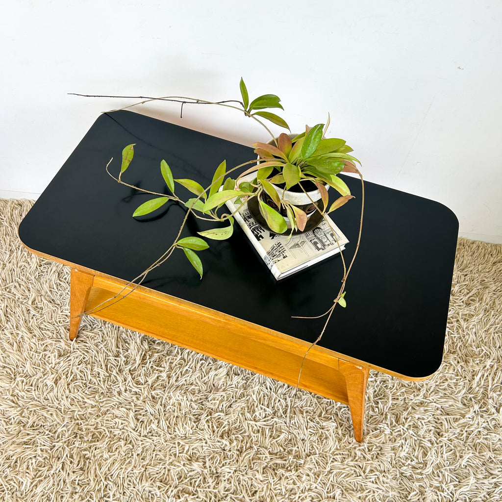 Beautiful mid century coffee table. Black laminate top with solid timber legs and magazine rack below. Super atomic, super cute, quite heavy.