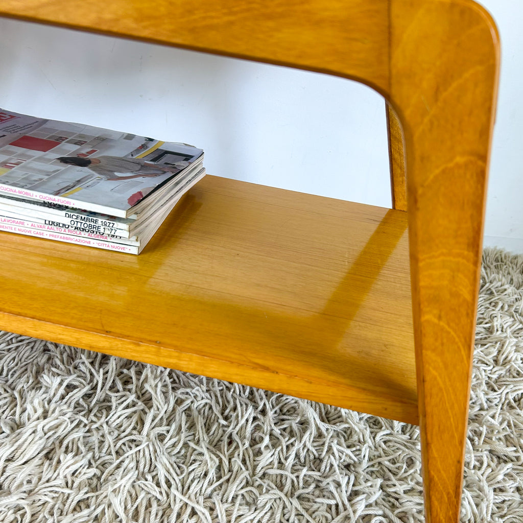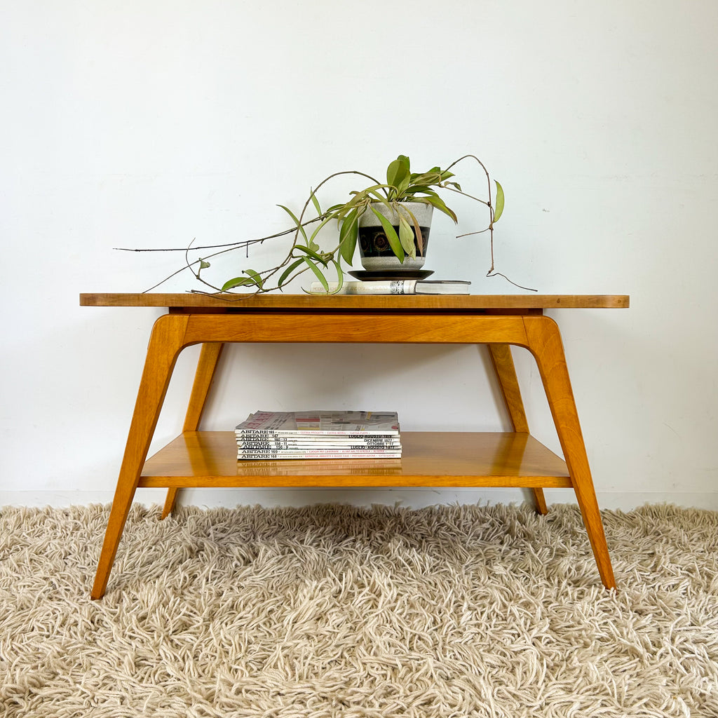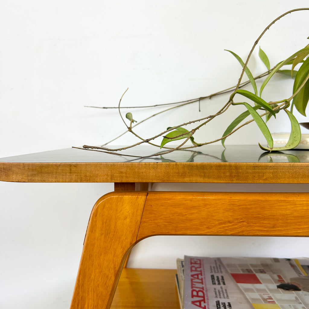 Beautiful mid century coffee table. Black laminate top with solid timber legs and magazine rack below. Super atomic, super cute, quite heavy.