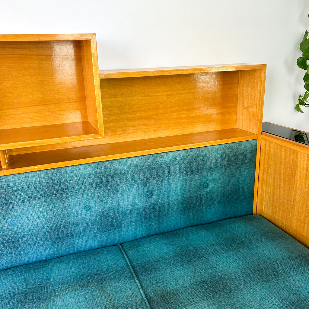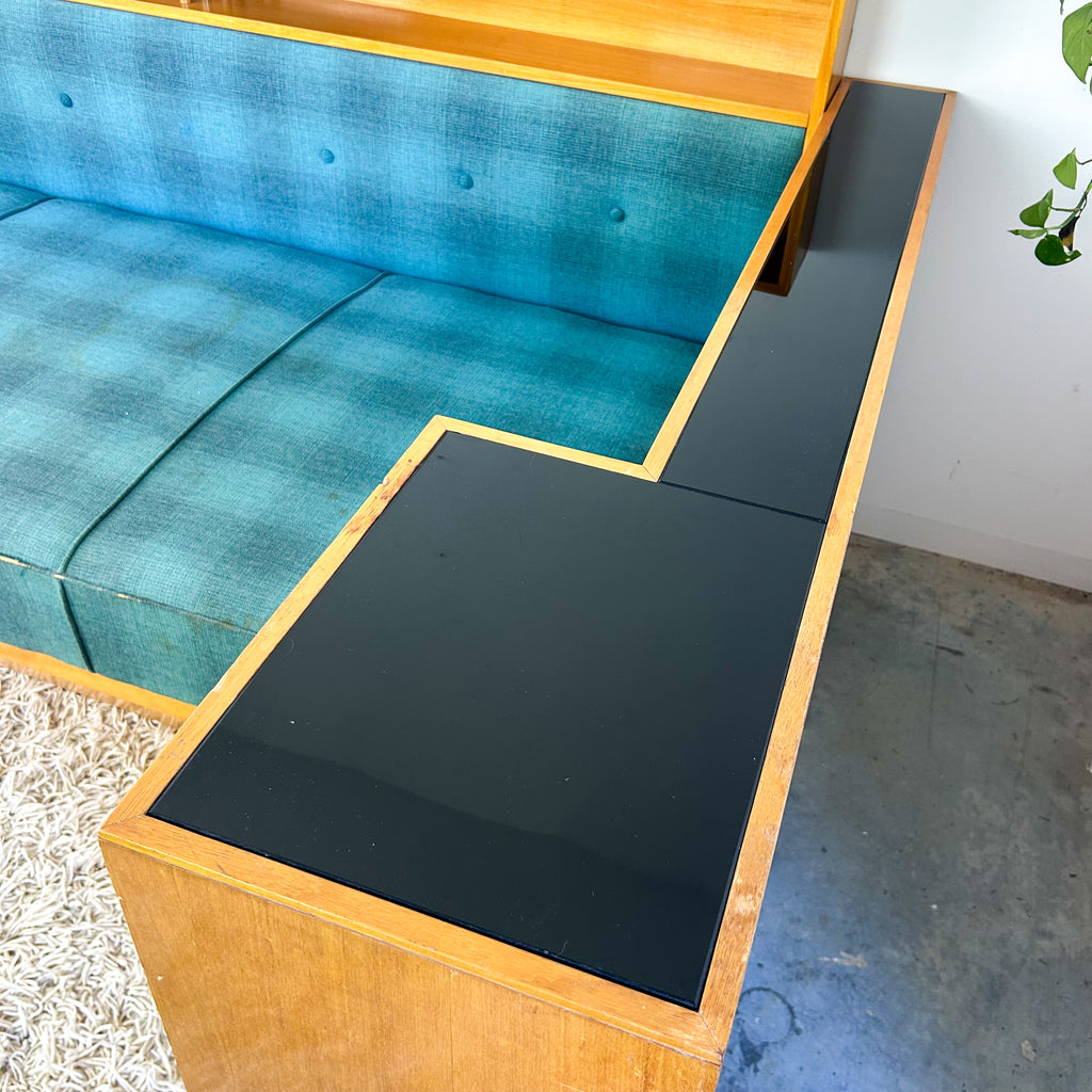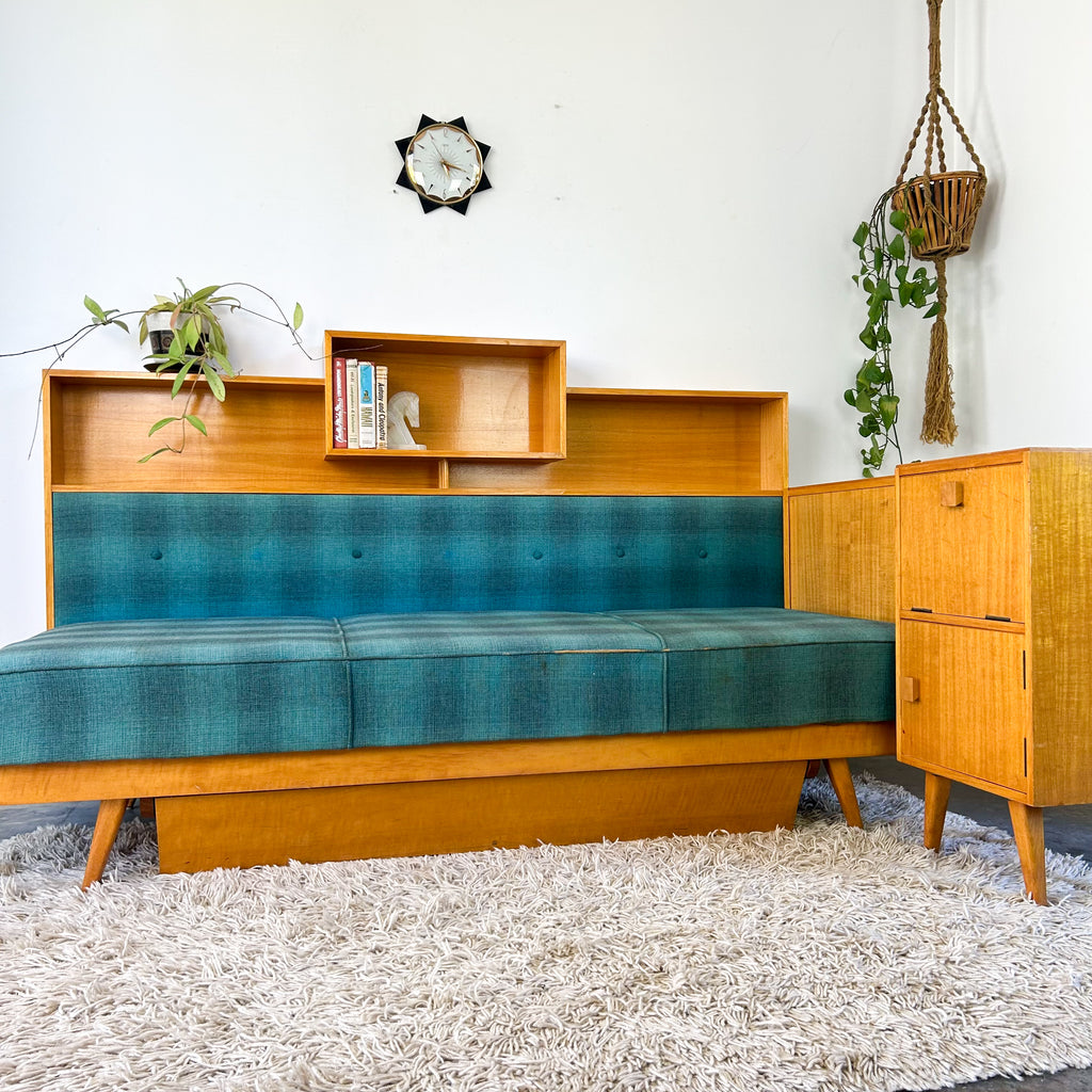 Absolutely sensational vintage day bed with a little bit extra! Lovely deep seat cushion with original blue check wool upholstery, cool shelving above, large drawer below and attached cabinet at one end. Sits on angled tapered legs. It's an awesome piece! And there's loads of storage! The end panel has a black glass inset top.