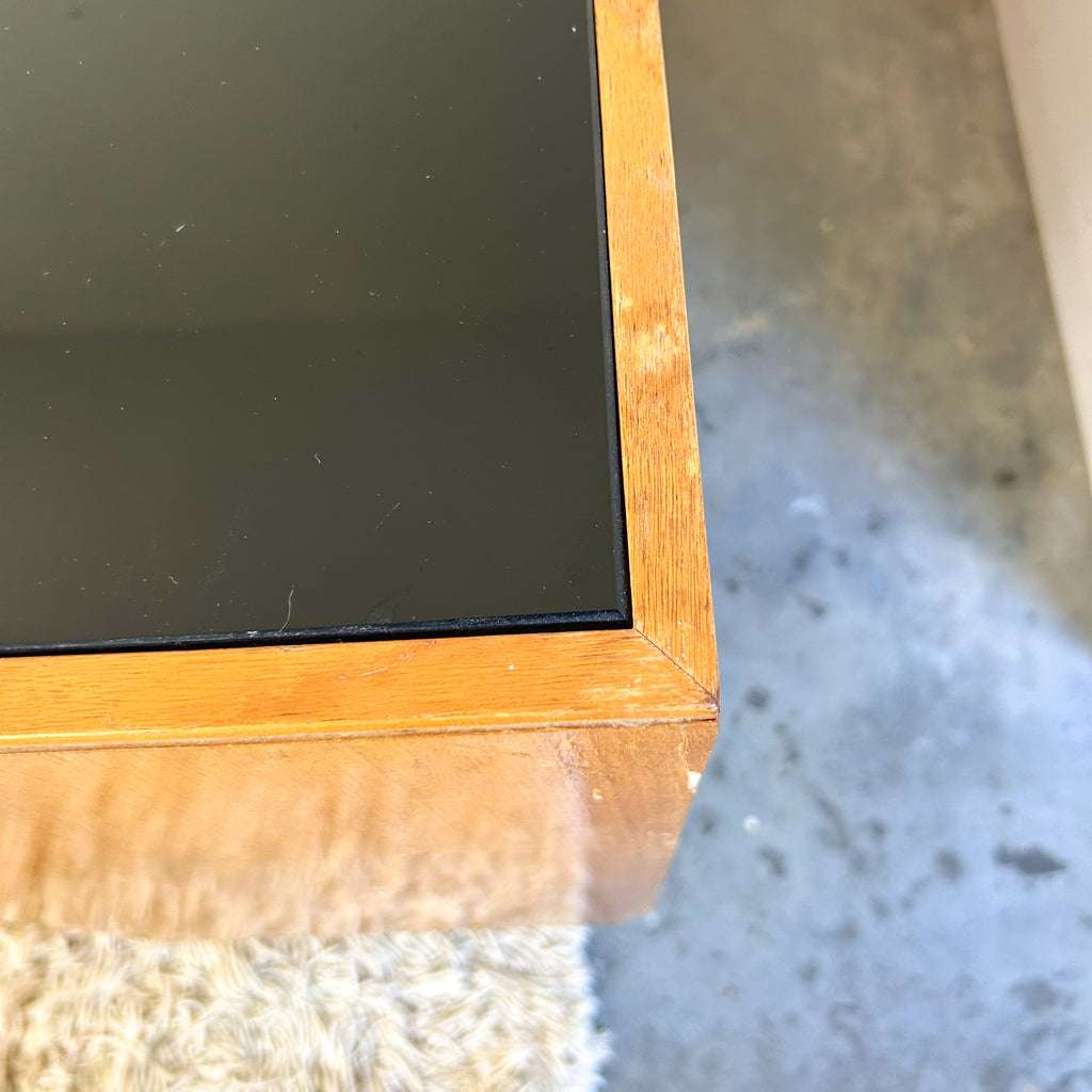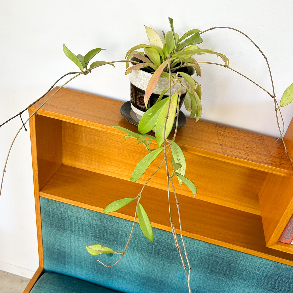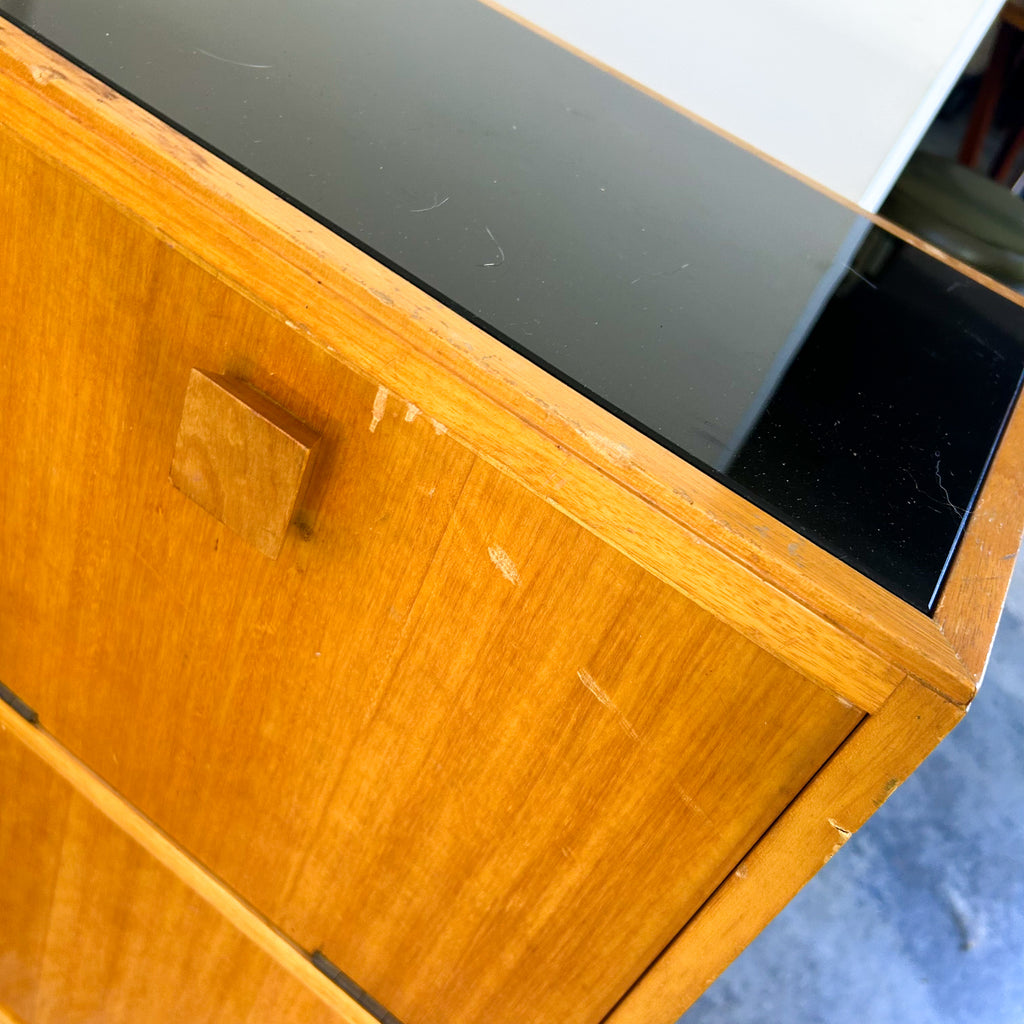 Absolutely sensational vintage day bed with a little bit extra! Lovely deep seat cushion with original blue check wool upholstery, cool shelving above, large drawer below and attached cabinet at one end. Sits on angled tapered legs. It's an awesome piece! And there's loads of storage! The end panel has a black glass inset top.