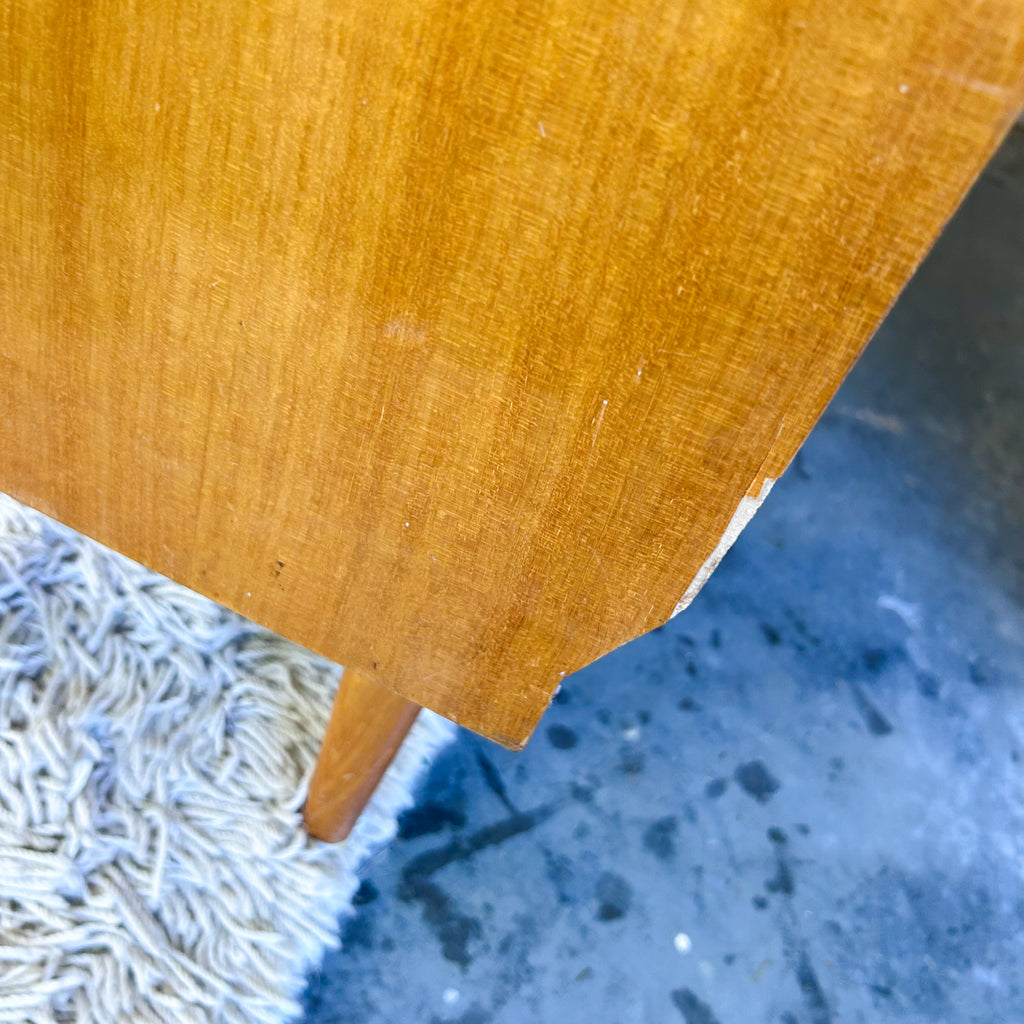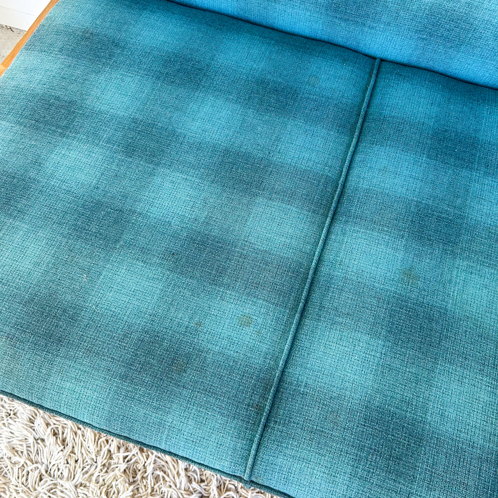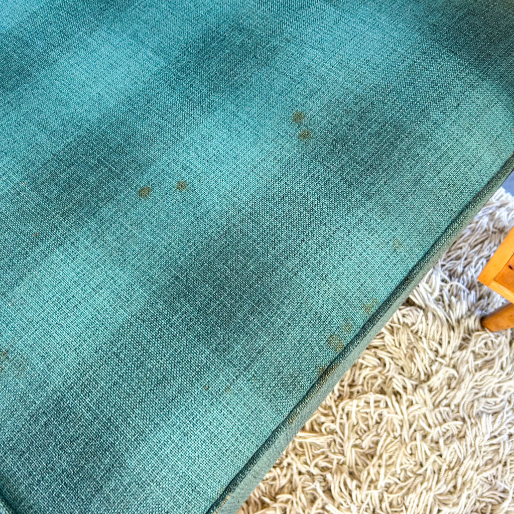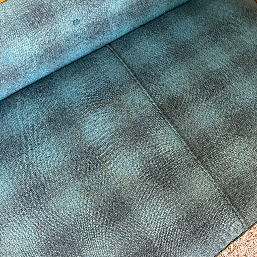 It's in very good original condition. There's a few dings and marks to the timber and a couple of small chips to the veneer. The upholstery has some wear on the piping around the front and a small patch of damage on the front left. Two of the buttons on the backrest are missing. And there's some stains, a couple large and various small stains, the upholstery has been cleaned however. Important to note, the back of the bed & the side piece aren't finished, so it does need to sit in the corner. See pictures for more details.