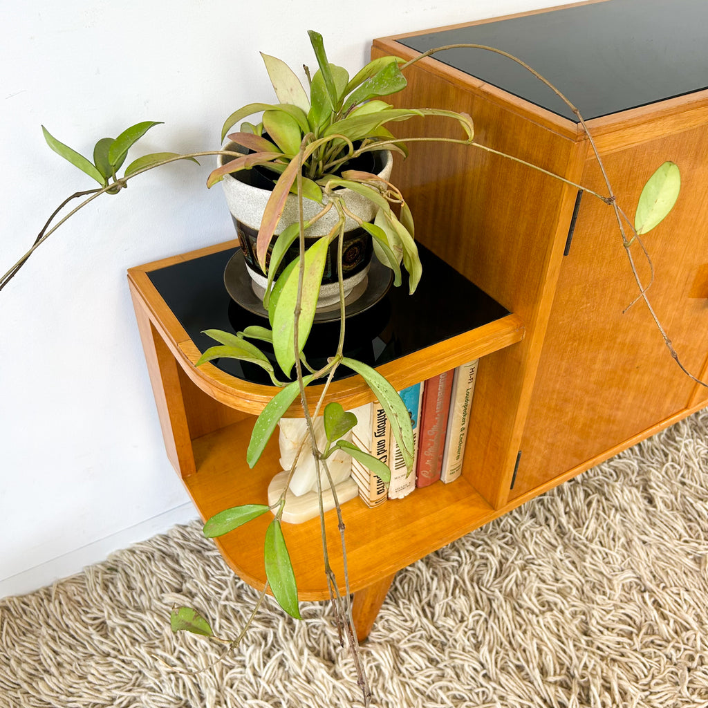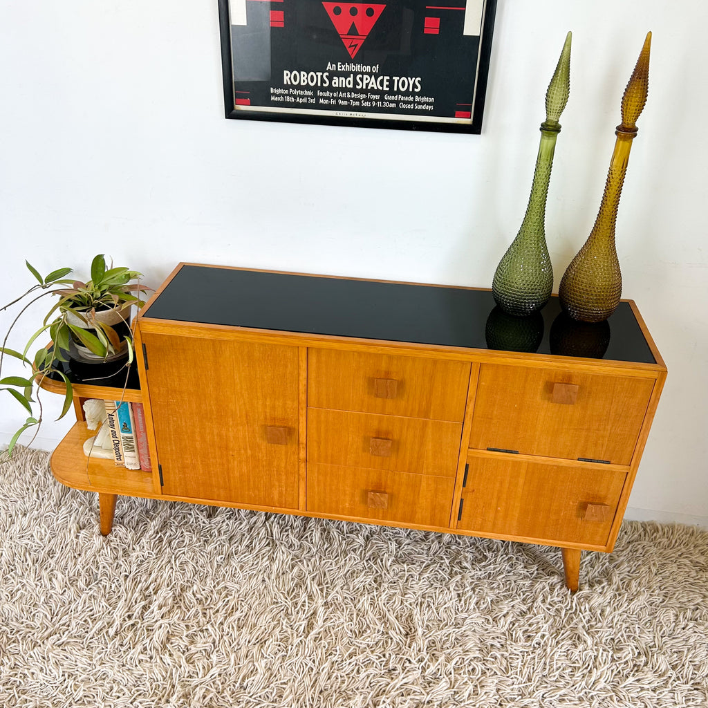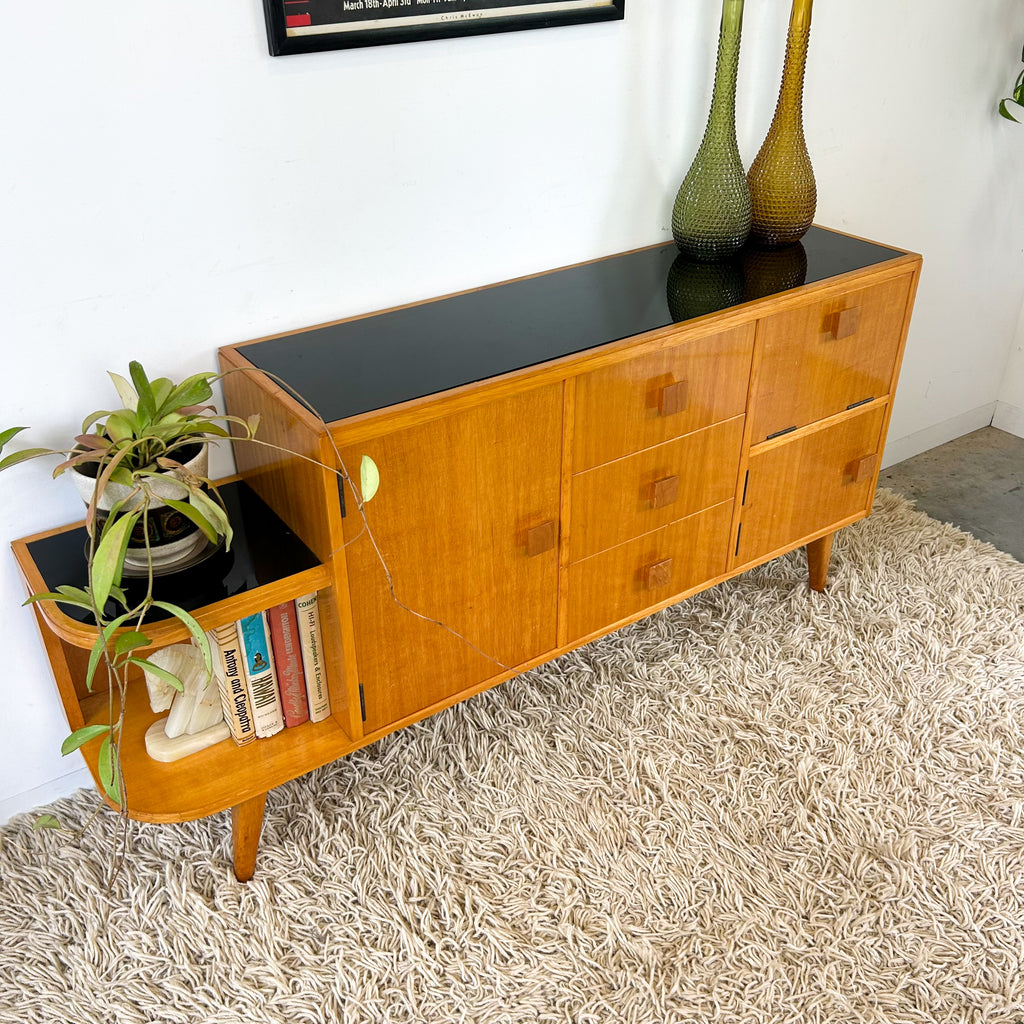 Beautiful mid century cabinet, made from solid timber. Curved open shelves at one end, three cabinet spaces (one with fold-down door) and three solid timber drawers with dovetail joinery. Sits on angled, tapered legs with square timber handles. The top surfaces are black inset glass. It's a truly spectacular piece and the quality is lovely. A nice petite one, great for a hall or smaller spaces.