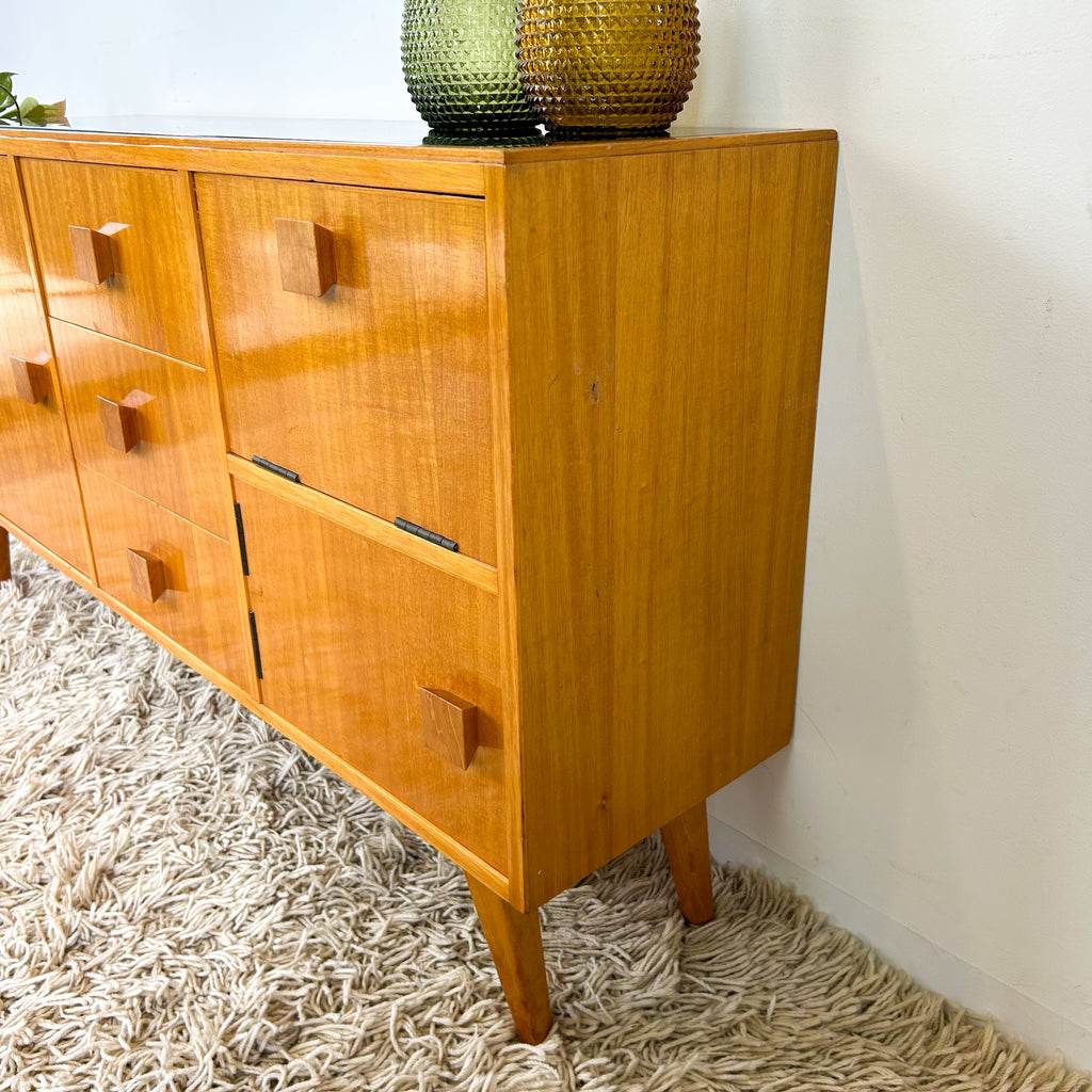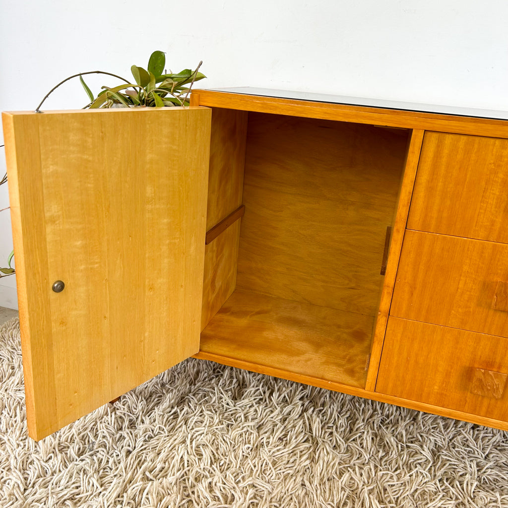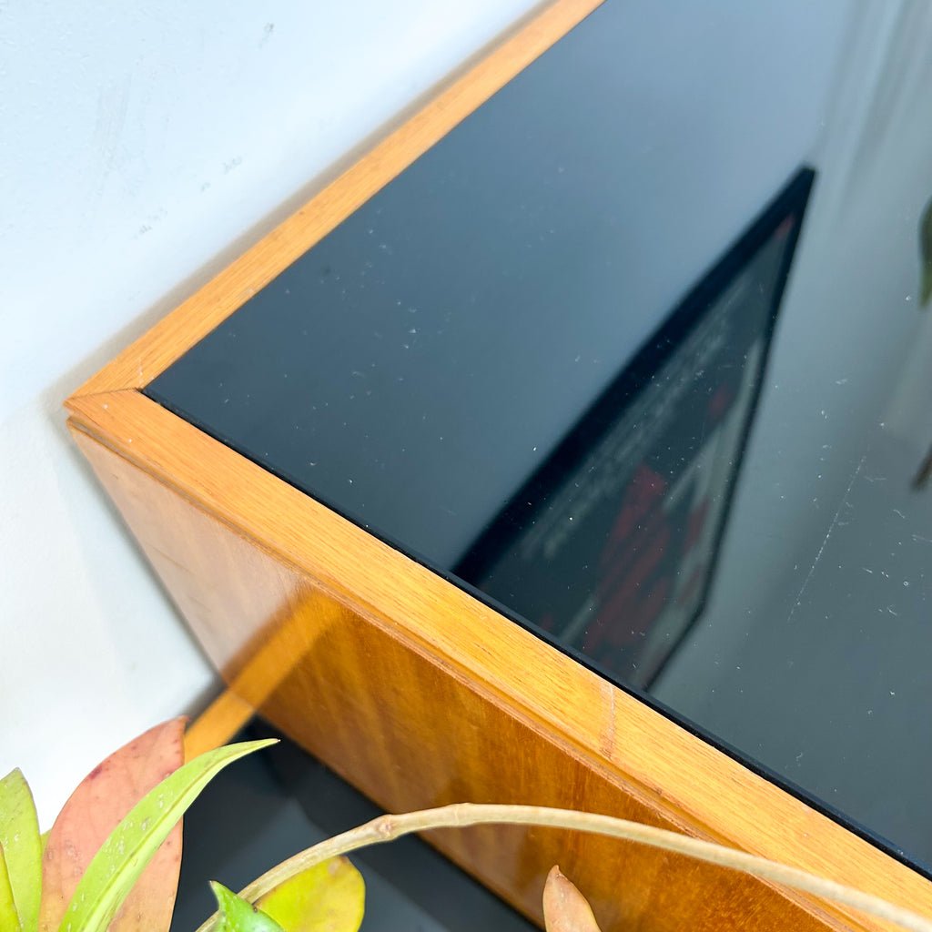 Beautiful mid century cabinet, made from solid timber. Curved open shelves at one end, three cabinet spaces (one with fold-down door) and three solid timber drawers with dovetail joinery. Sits on angled, tapered legs with square timber handles. The top surfaces are black inset glass. It's a truly spectacular piece and the quality is lovely. A nice petite one, great for a hall or smaller spaces.