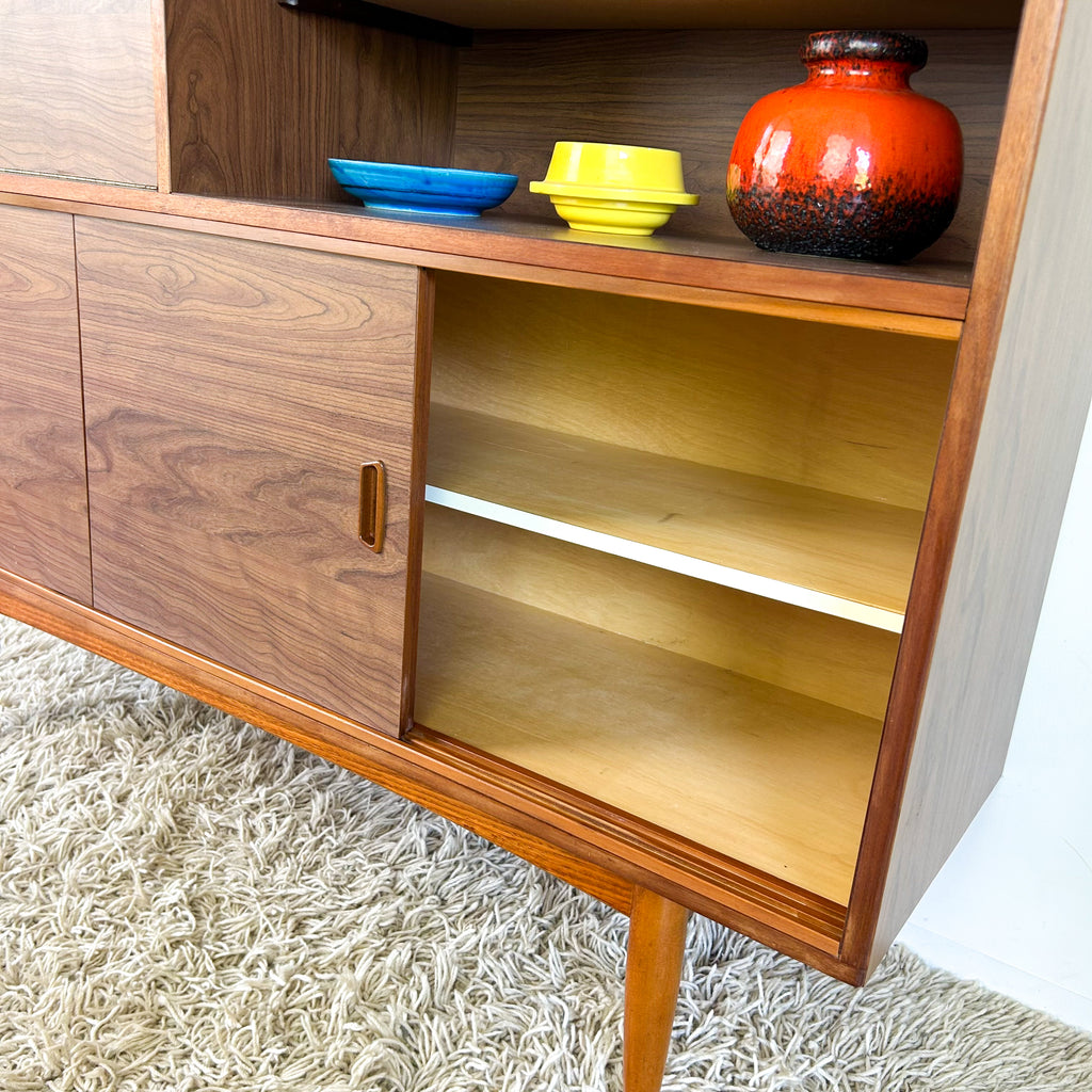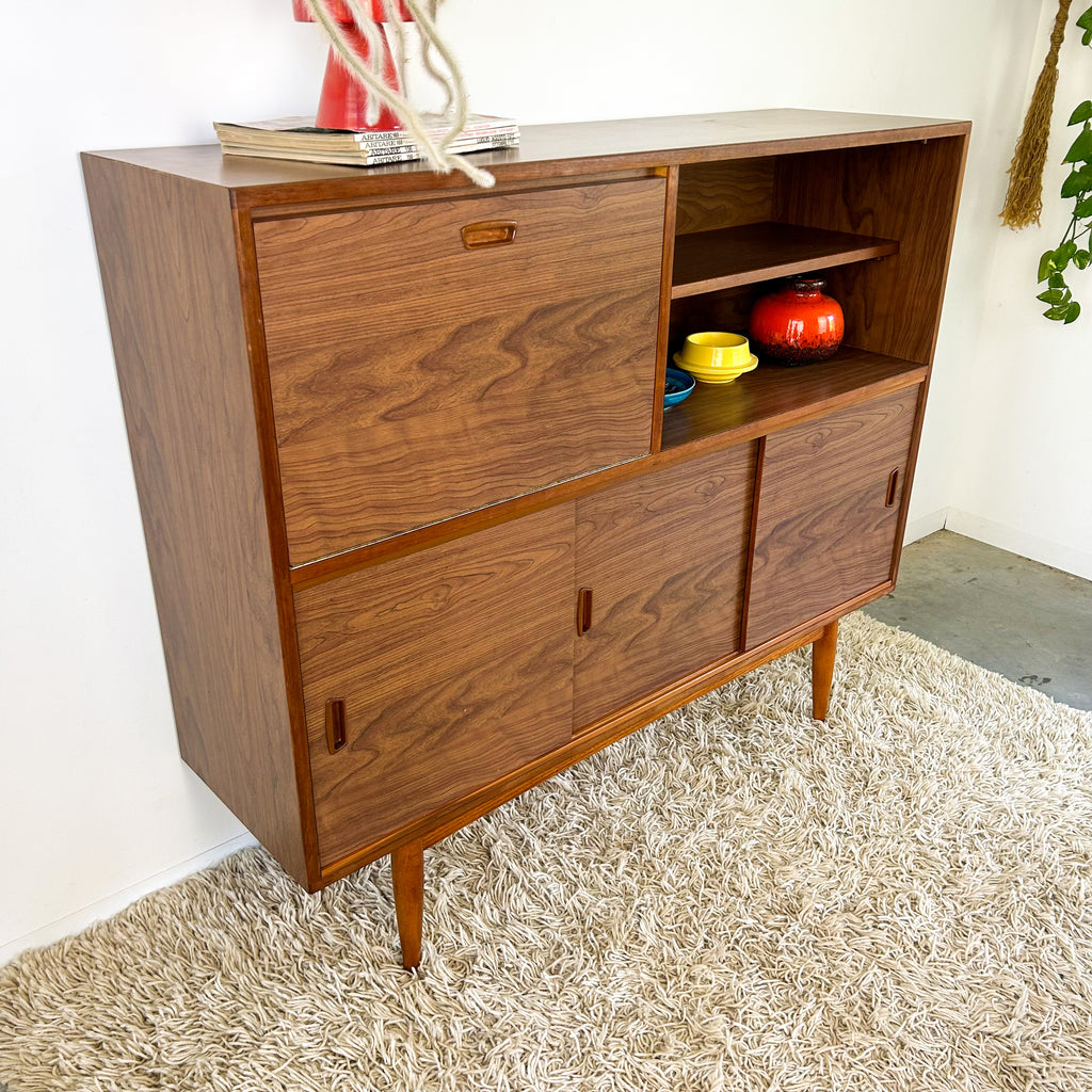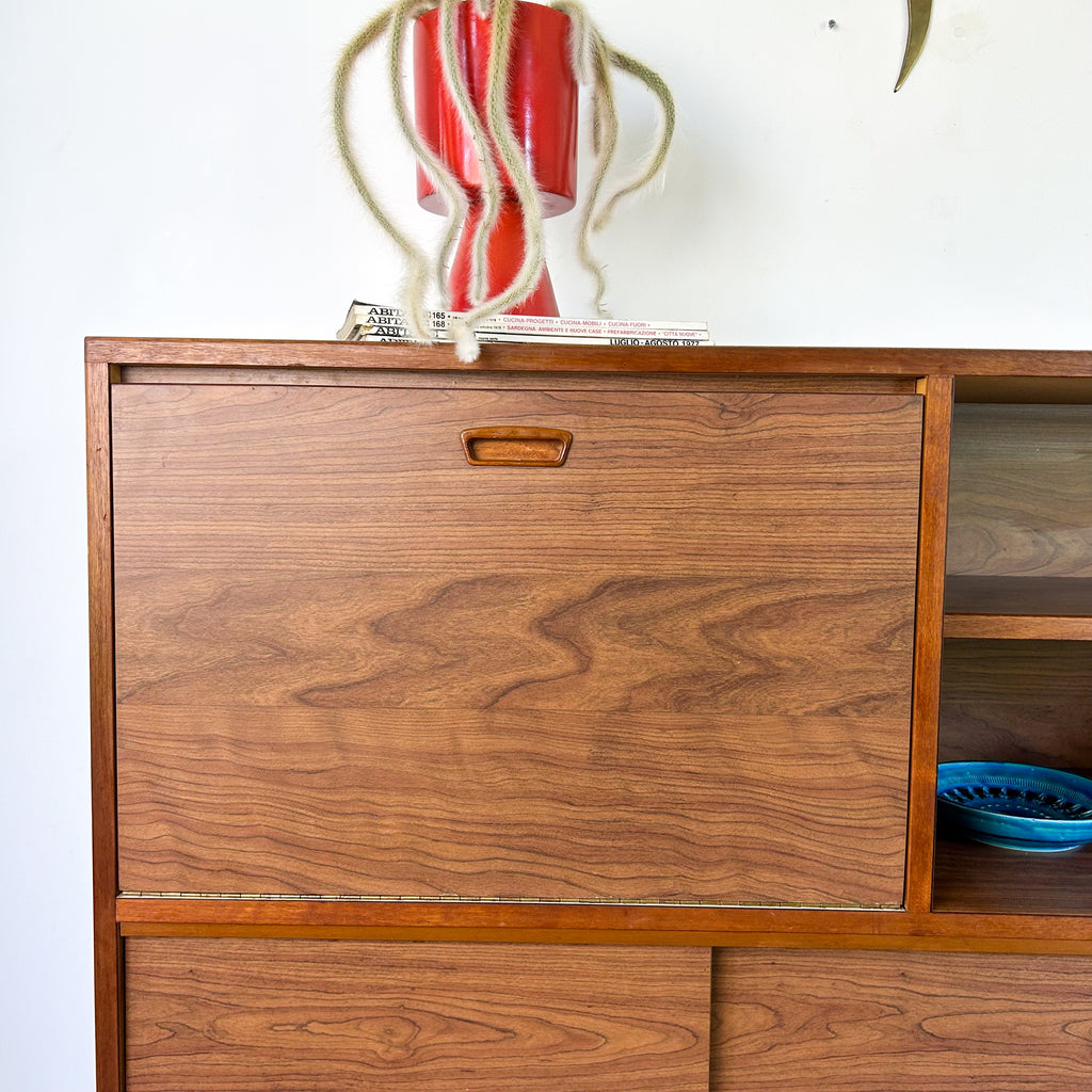 Fold down bar cabinet on the top left with slim glass shelf and mirrored back. Open shelves on the top right, with double sliding door cabinet below with removable shelf. Separate cabinet on the bottom left has a green felted cutlery drawer inside.