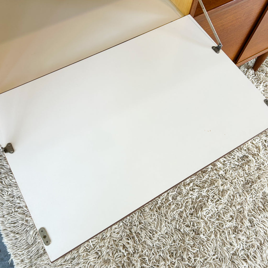 Vintage cocktail cabinet made in Preston, Melbourne by Chatley Productions. Teak veneer with beautiful wooden recessed handles and tapered legs. Fold down bar cabinet on the top left with slim glass shelf and mirrored back. With three drawers below; the top one being a green felted cutlery drawer. Open shelves on the top right, with cabinet below. Removable shelf inside the cabinet.