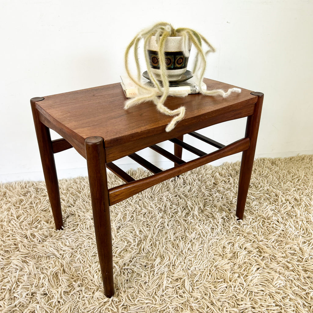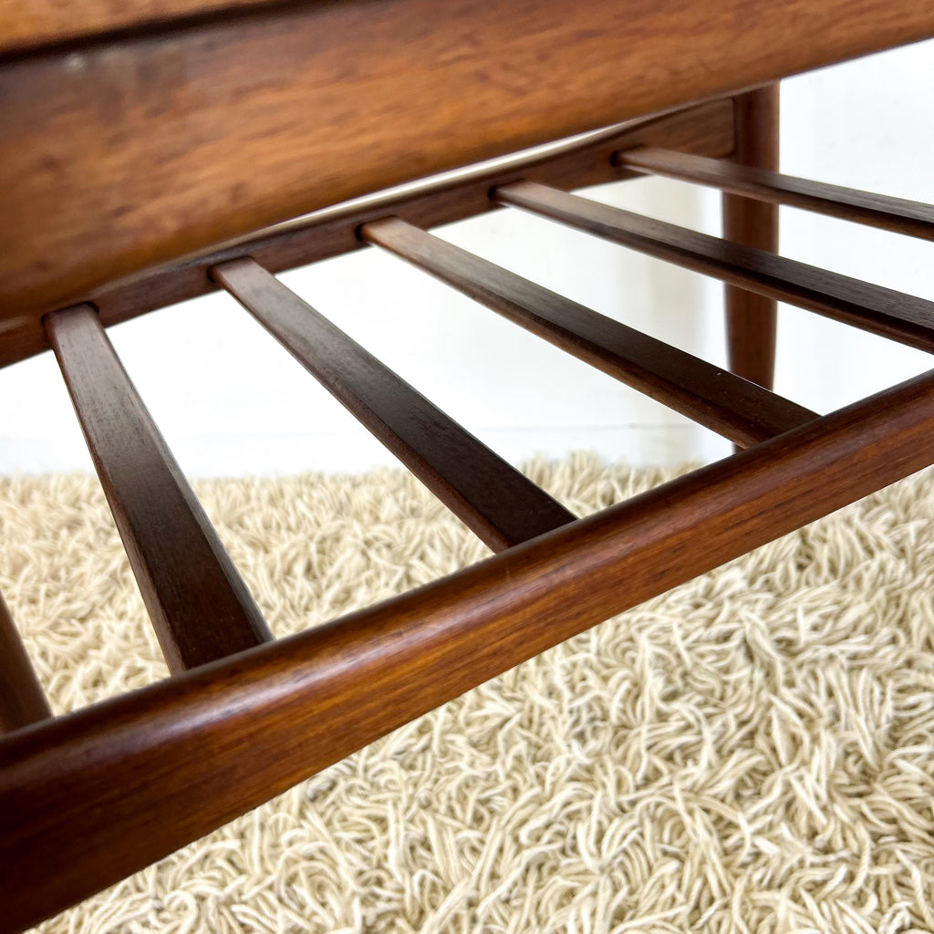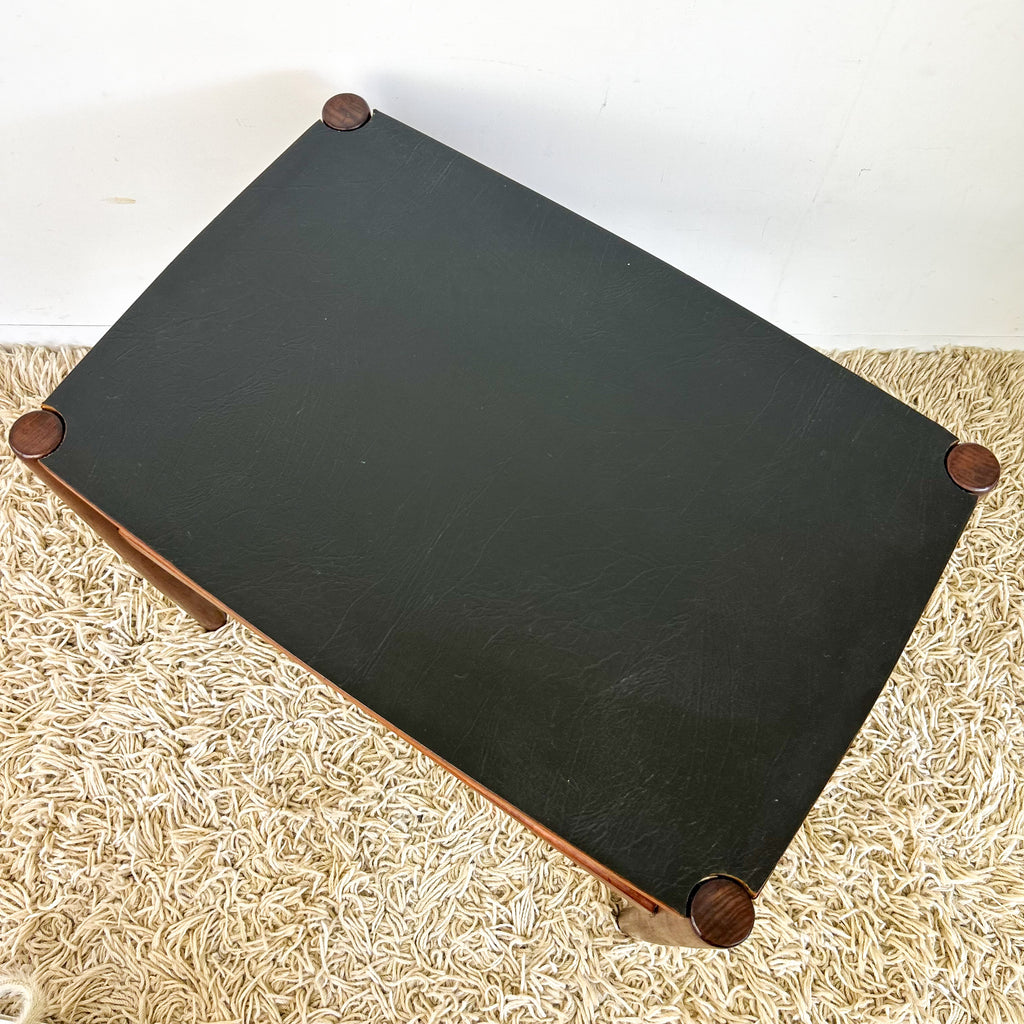 Mid Century Danish Deluxe flip top coffee table. The table top lifts off and can be used on either side; one is teak veneer, the other is black vinyl. Beautiful Blackwood frame; tapered legs and slatted magazine rack, very Scandinavian-inspired. A great design!