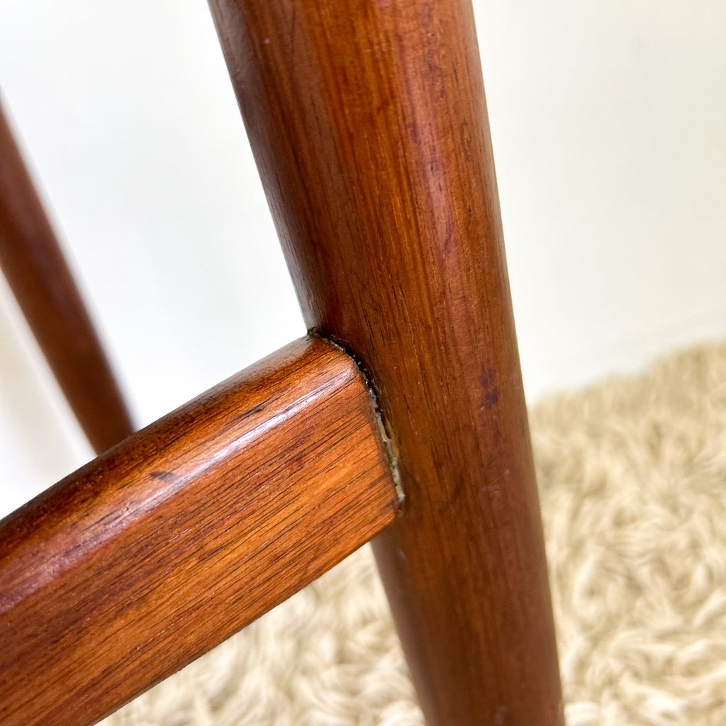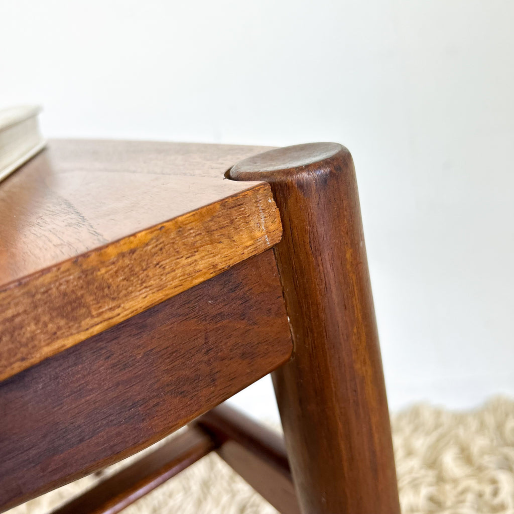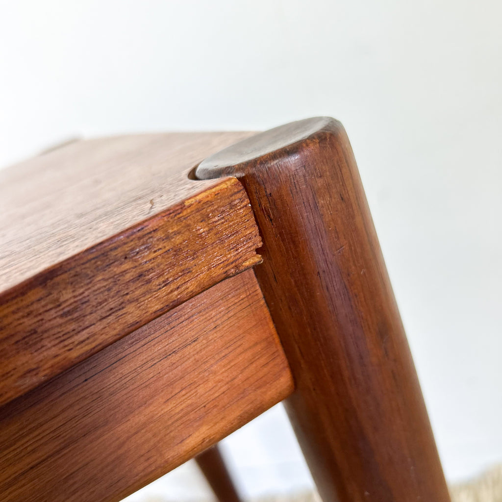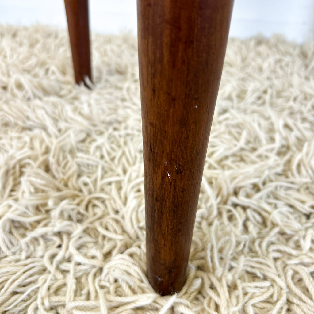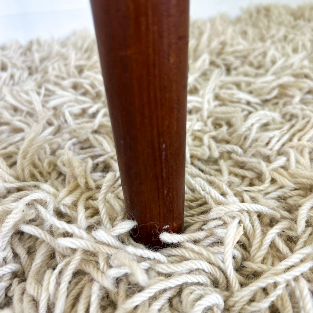 Great condition, nice & solid. A few minor scuffs on the legs. And some very tiny chips/damage to the veneer around the edges, particularly where the tabletop sits over the legs. See pics.