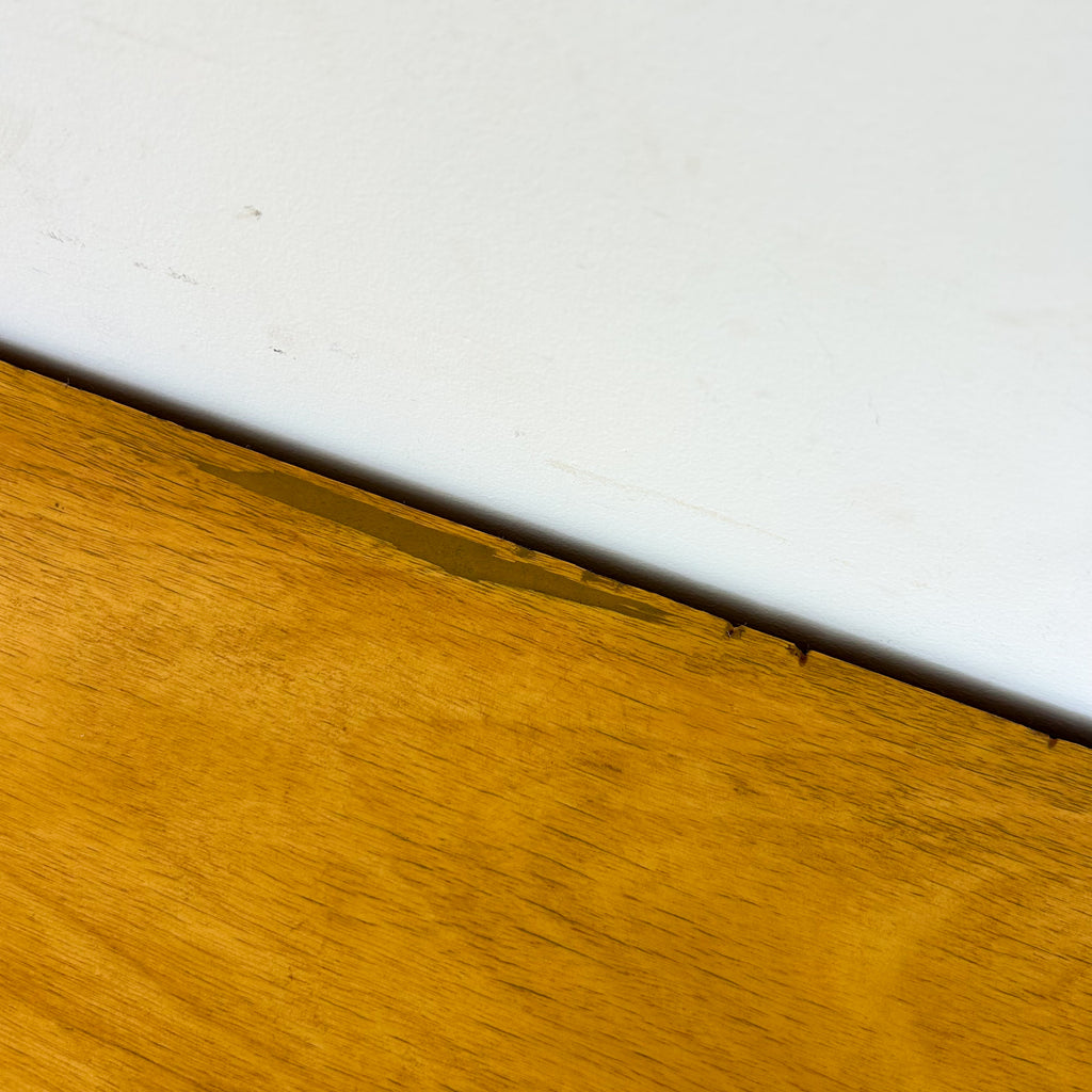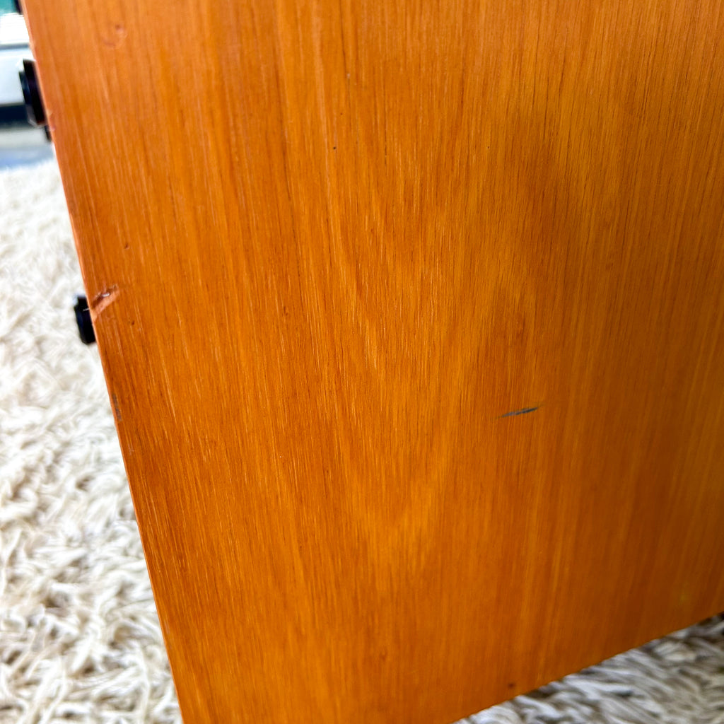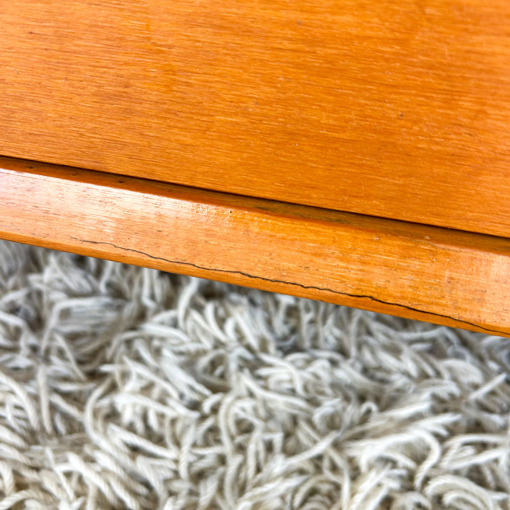 Good condition, but some wear. Some scuffs/marks to the legs and throughout. A few small chips to the veneer. There's a pen (?) mark drawn along the front at the bottom. The top surface has a repair at the back which is visible. Some minor marks inside the drawers. Great, functional furniture regardless.