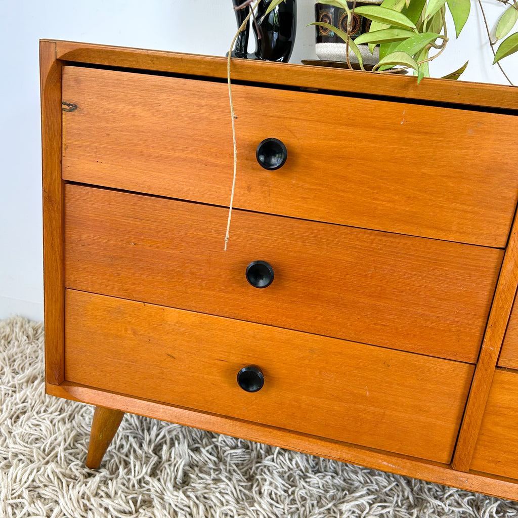 Vintage dresser drawers made in Melbourne by Kerby furniture. Stamped 22 Dec 1964. Great storage, six drawers with black plastic handles and short tapered, angled legs. Perfect for a bedroom.