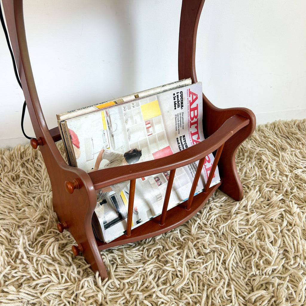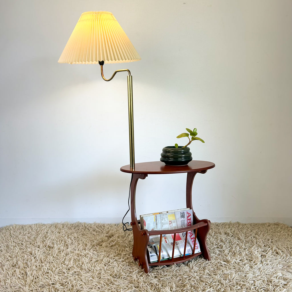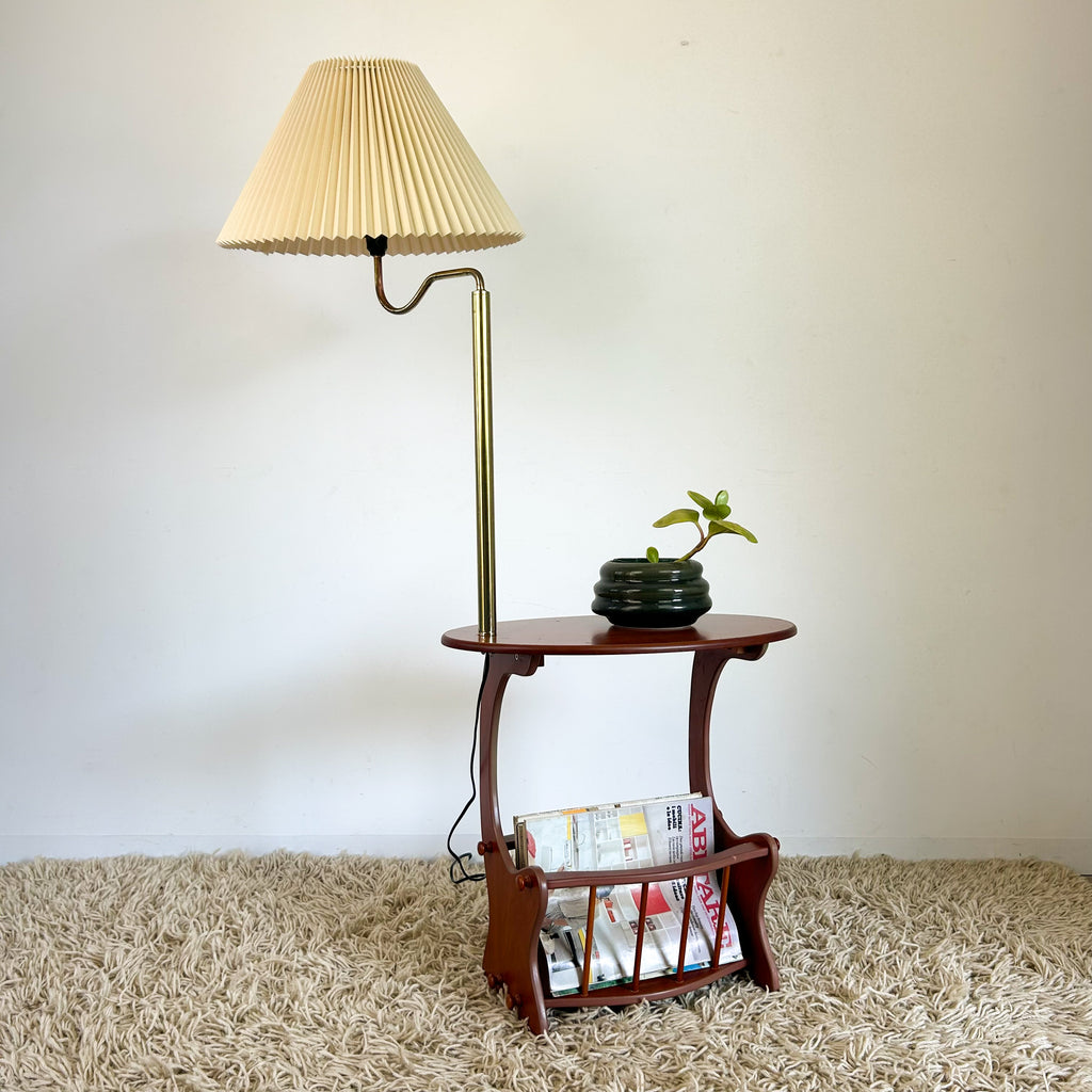 Vintage lamp table; features side table with magazine rack below and lamp above. The lamp swivels as required.