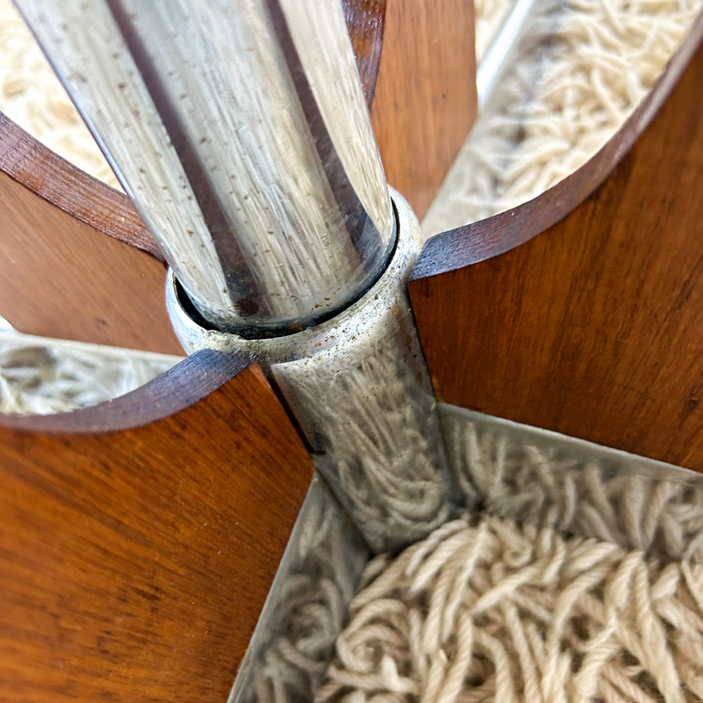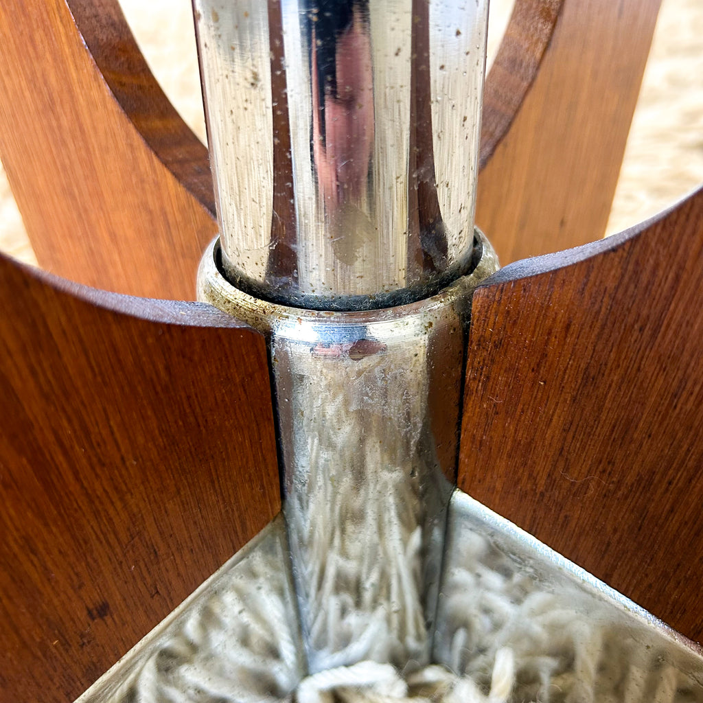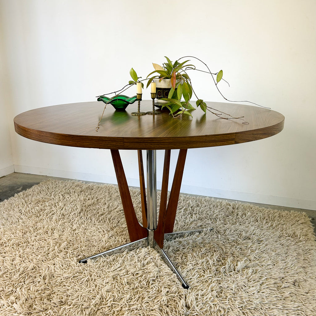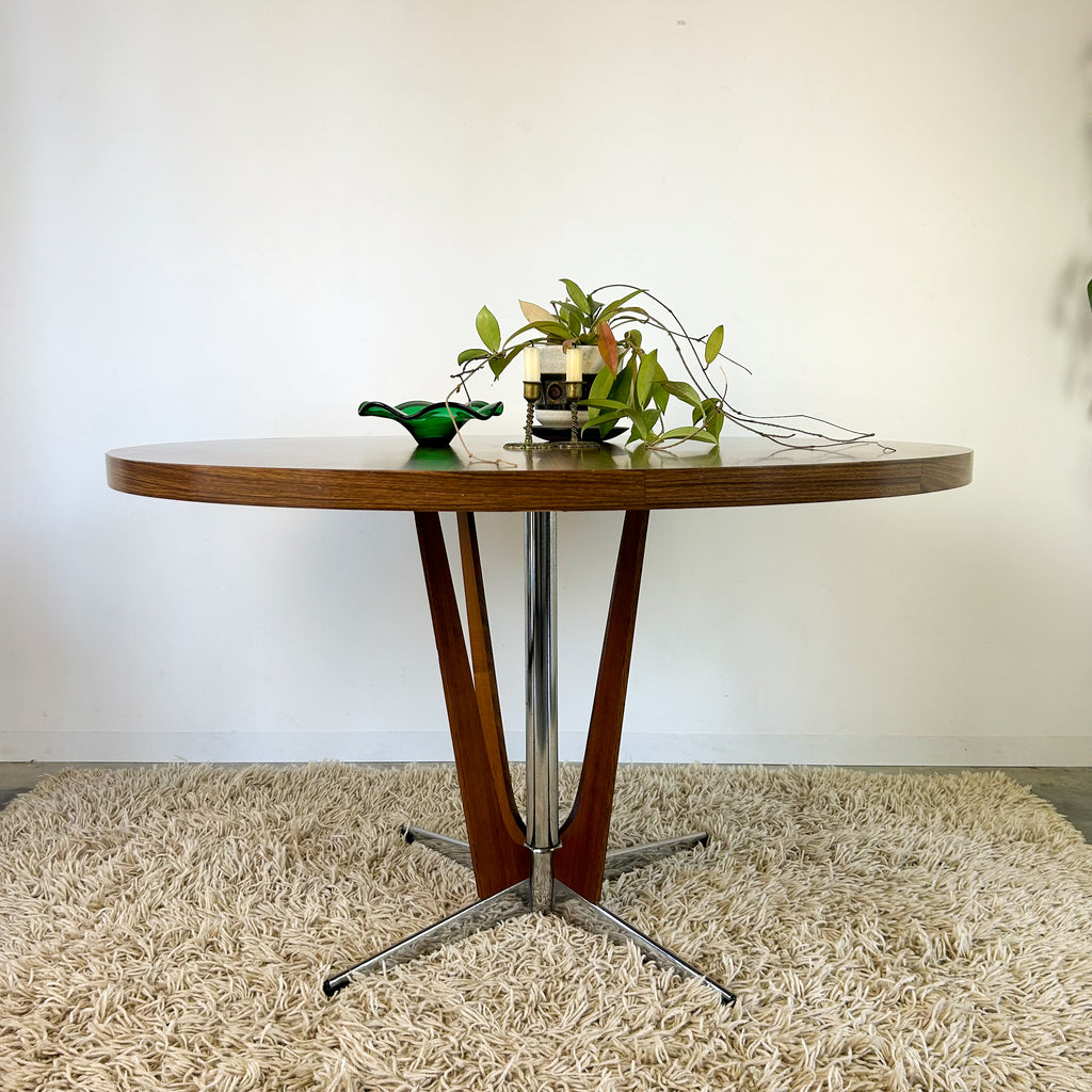 Vintage Namco starburst dining table. Fabulous mid century chrome/timber base with round laminate tabletop.