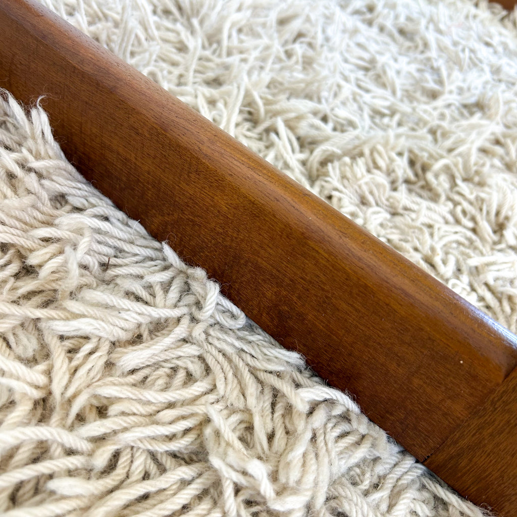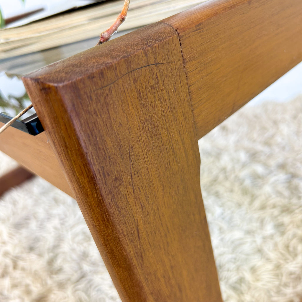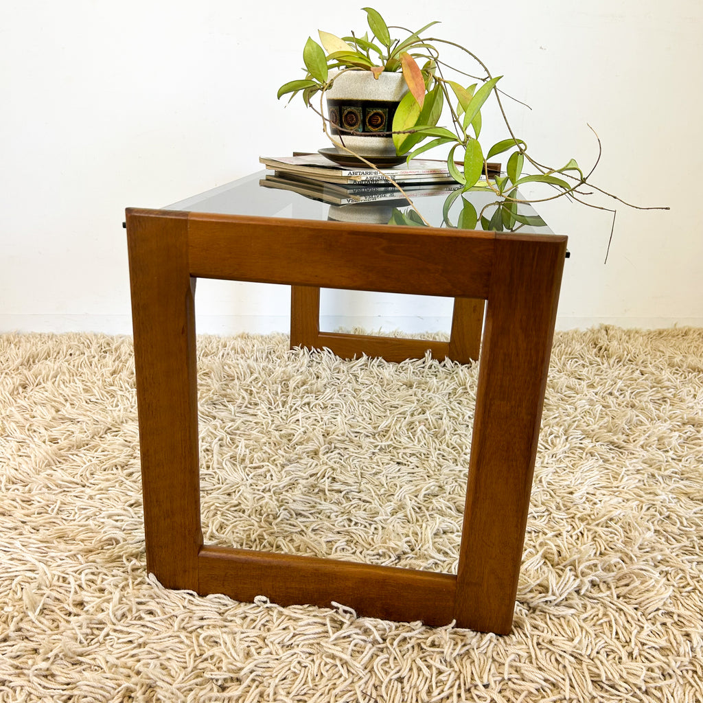 Vintage mid century coffee table. Timber sleigh base frame and smoky glass top.
