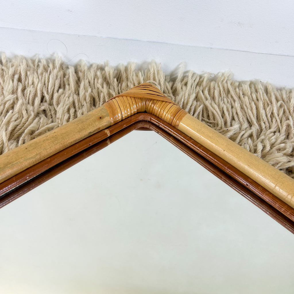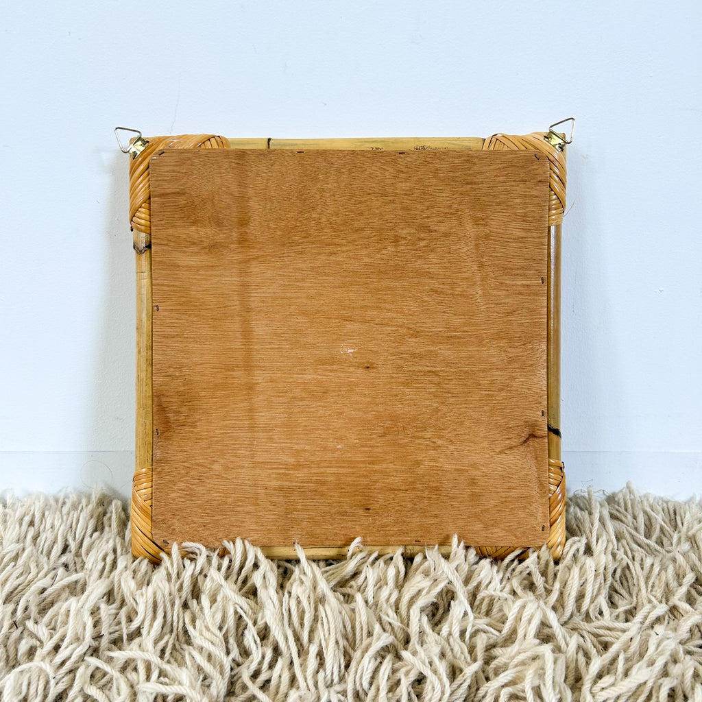 Small vintage cane framed mirror. Hooks on the back to hang as a diamond or square.