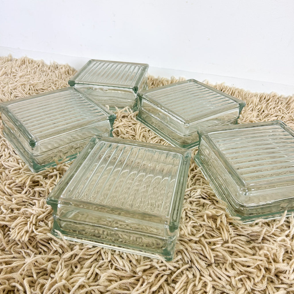 Vintage glass bricks for sale. Vertical stripes on one side, horizontal on the other. Aside from their intended use, they look cute on a display shelf or as bookends.