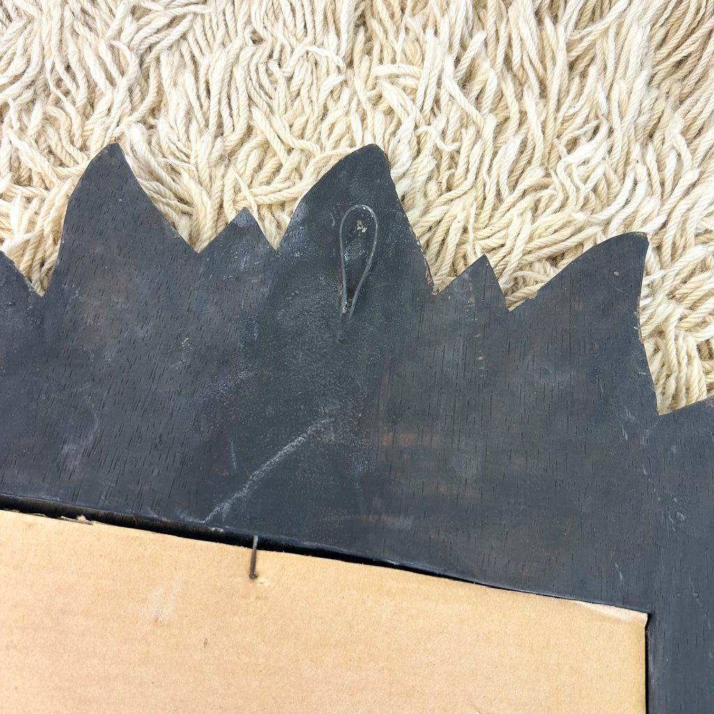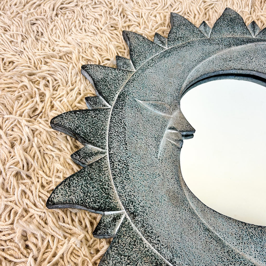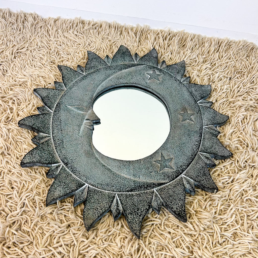 Rad 90s wooden sun & moon mirror. Loop on the back for hanging.