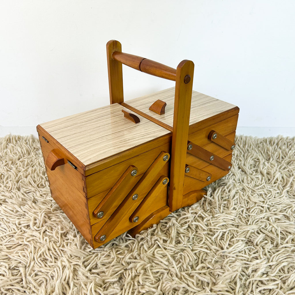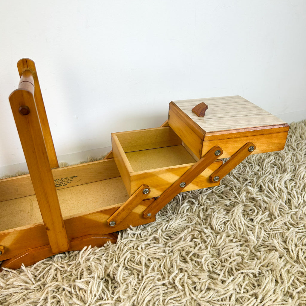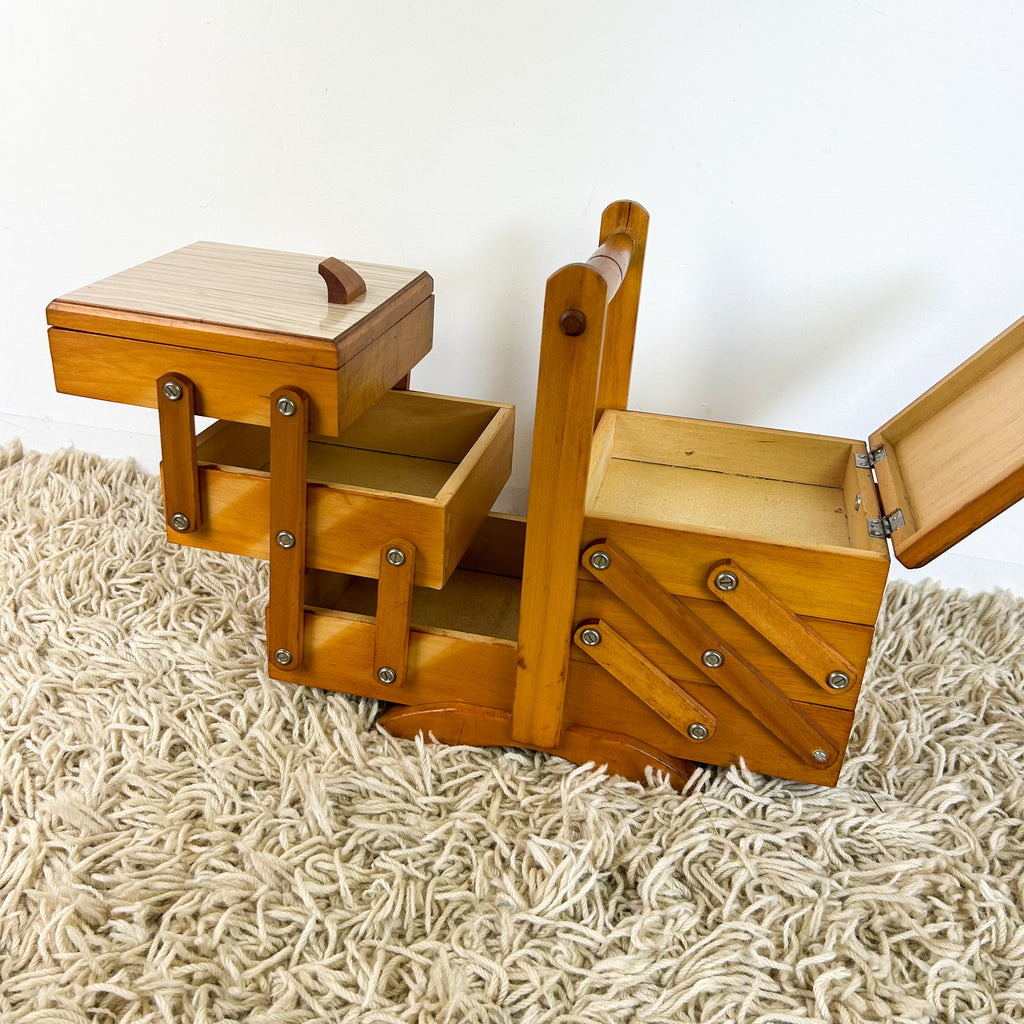 Vintage wooden sewing box made by Healesville Furniture. Three tier storage with cantilever opening, little feet and handle. Tops of the lids are laminate. Also great for storing little odds and ends, tools or collections of small items.