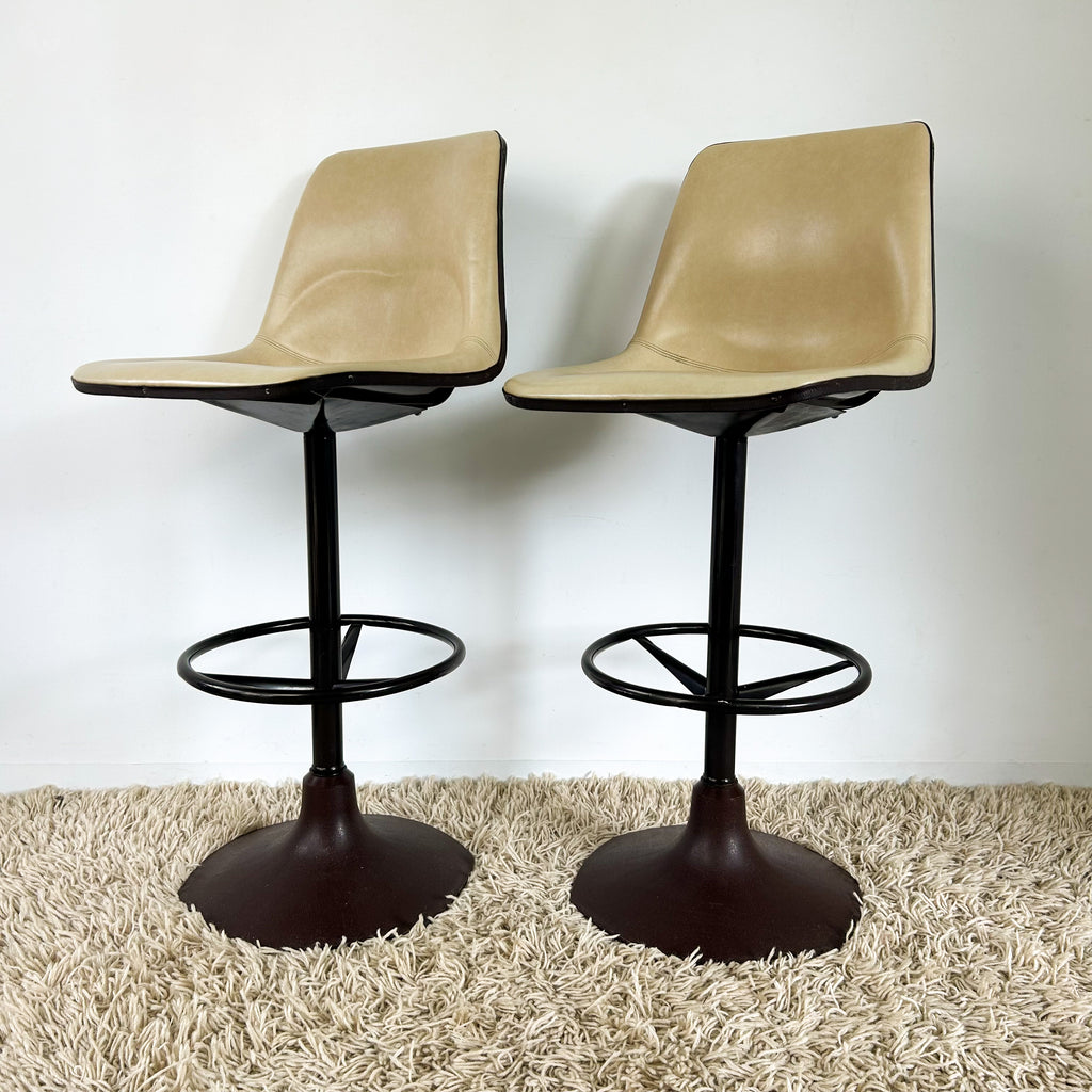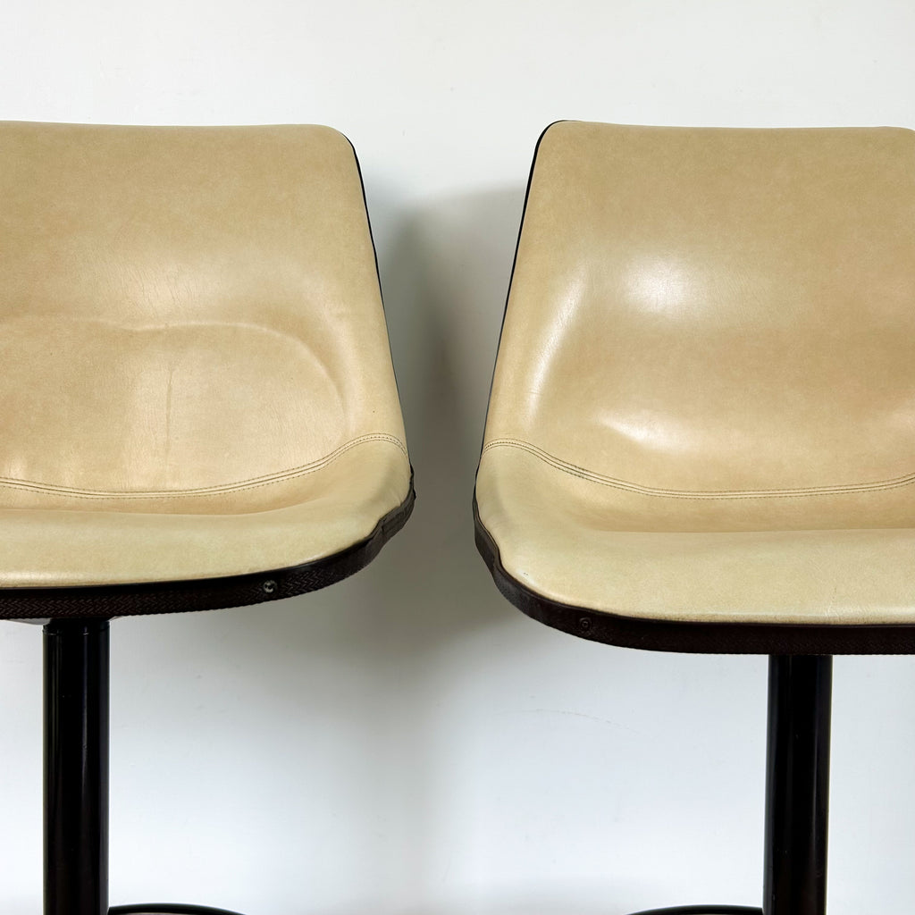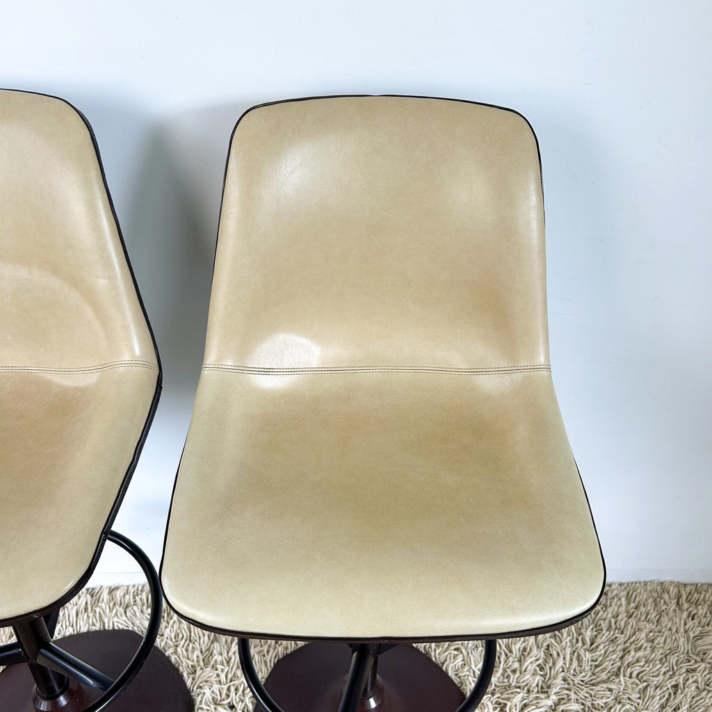 Vintage Hobnob swivel bar stools made in Australia by Sebel. Vinyl seats with plastic bases and metal footrests.