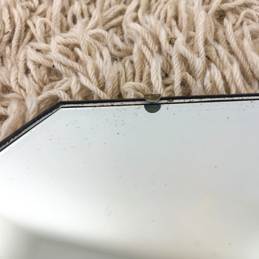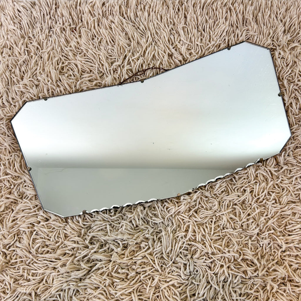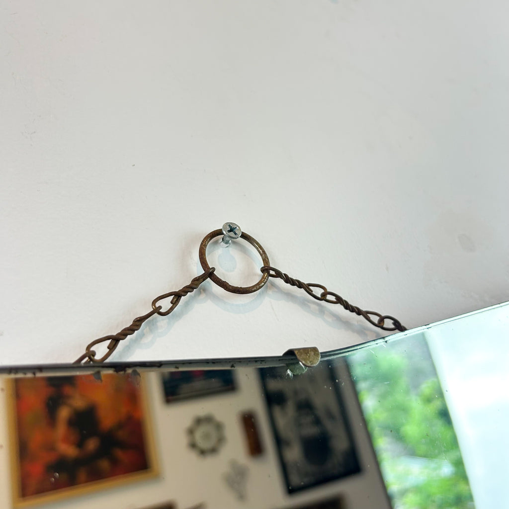 Vintage V shaped mirror with pie crust detail at the bottom. Chain on the back for hanging.