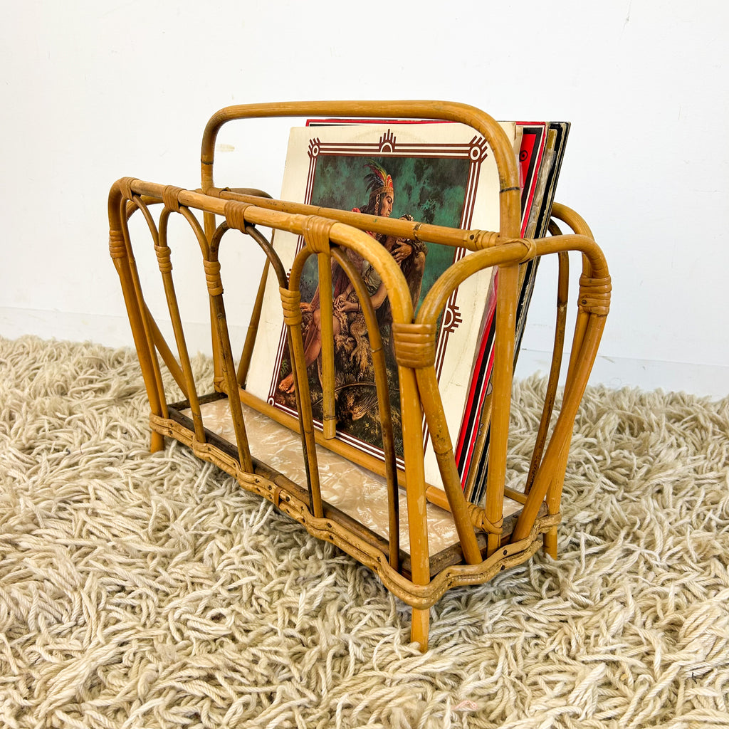 Vintage cane magazine rack with laminate base. Large enough to fit vinyl too. Great for storing books in a kids room.