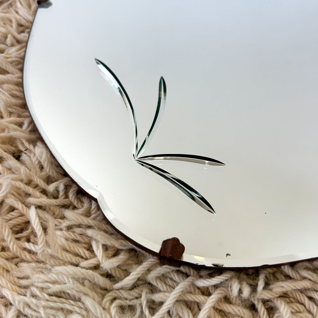 Vintage cloud shaped beveled edge mirror with pretty details. Chain on the back for hanging.