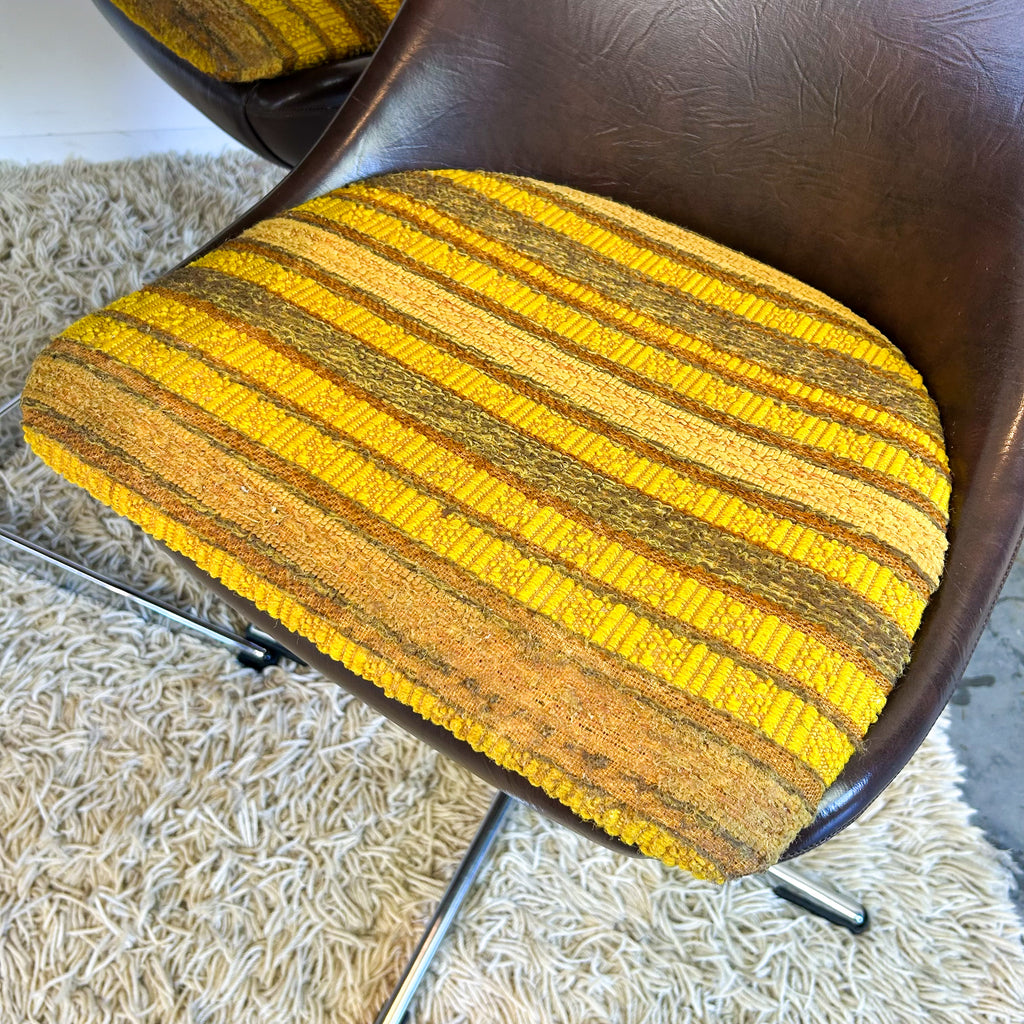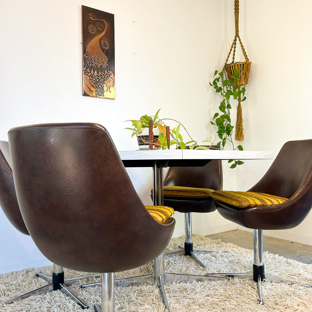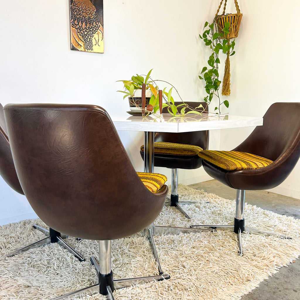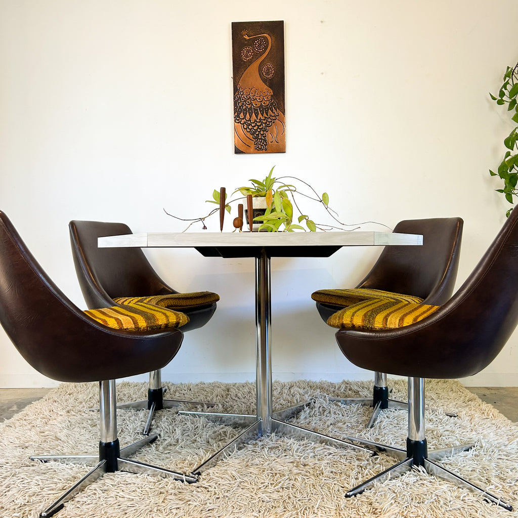 White/grey laminate hexagonal dining table and four brown vinyl dining chairs with retro striped seat pads. All on chrome pedestal bases.