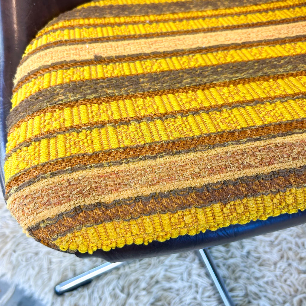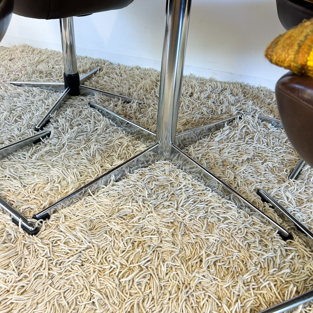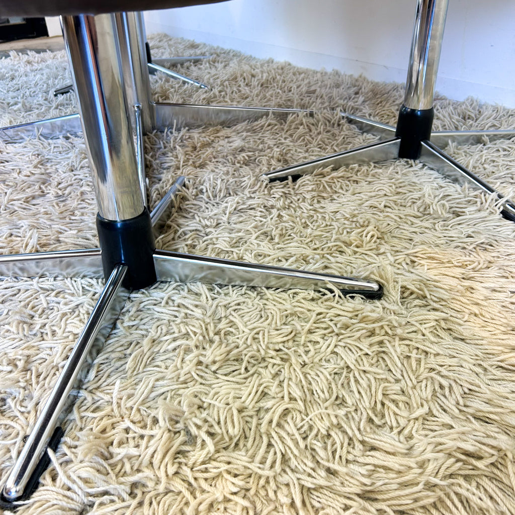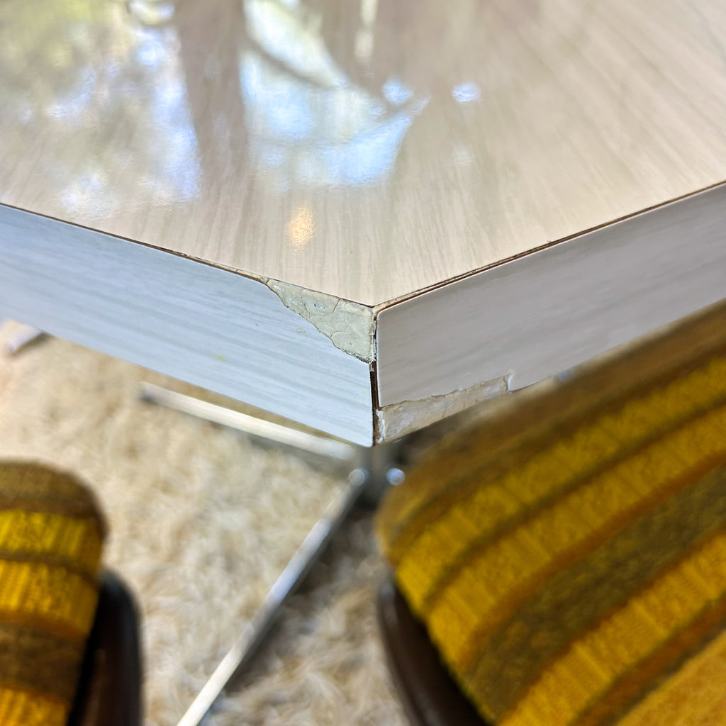 The table is in great condition, except for one corner where there are two (repaired) chips to the laminate veneer. The brown vinyl is excellent, however the fabric of the seat pads has perished a little, particularly at the front, where it's a little hard. All the chrome is in excellent condition. See pics for details.