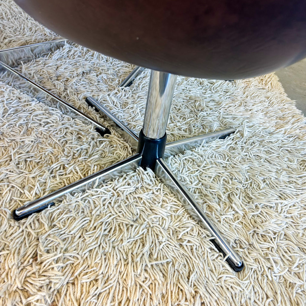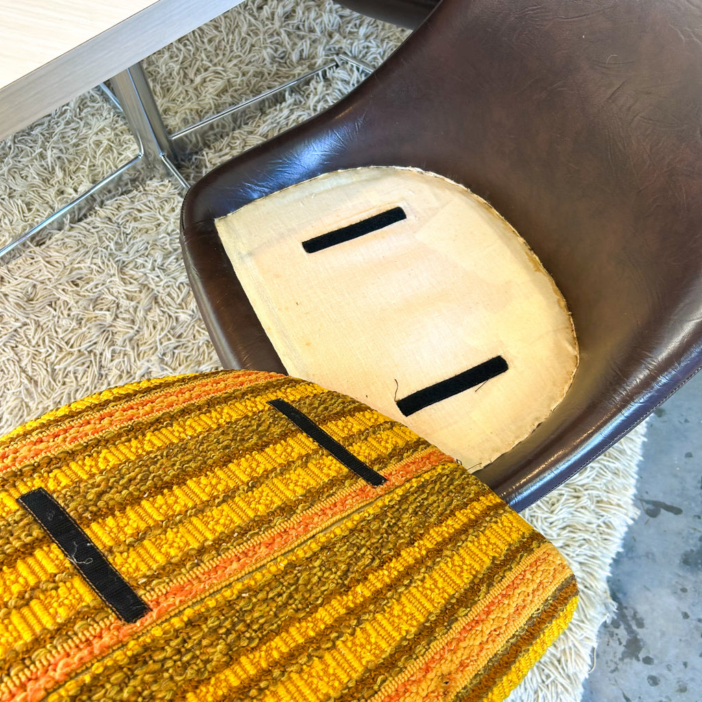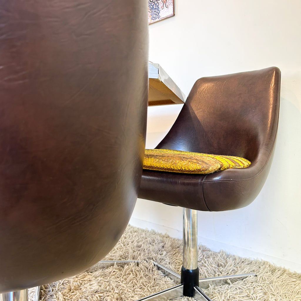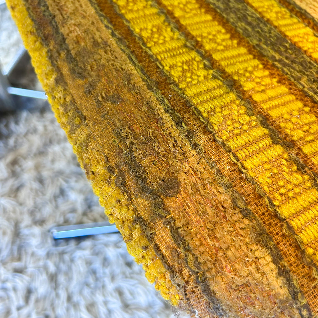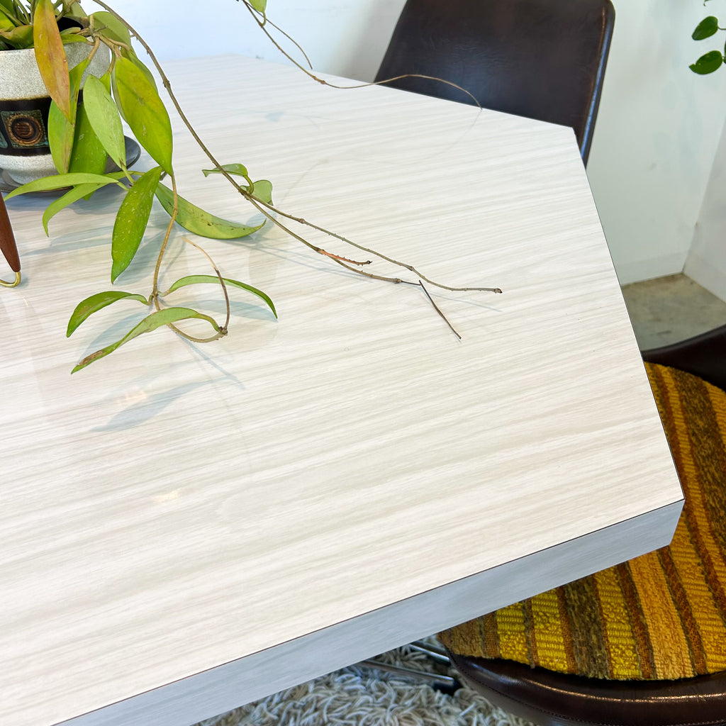 The table is in great condition, except for one corner where there are two (repaired) chips to the laminate veneer. The brown vinyl is excellent, however the fabric of the seat pads has perished a little, particularly at the front, where it's a little hard. All the chrome is in excellent condition. See pics for details.