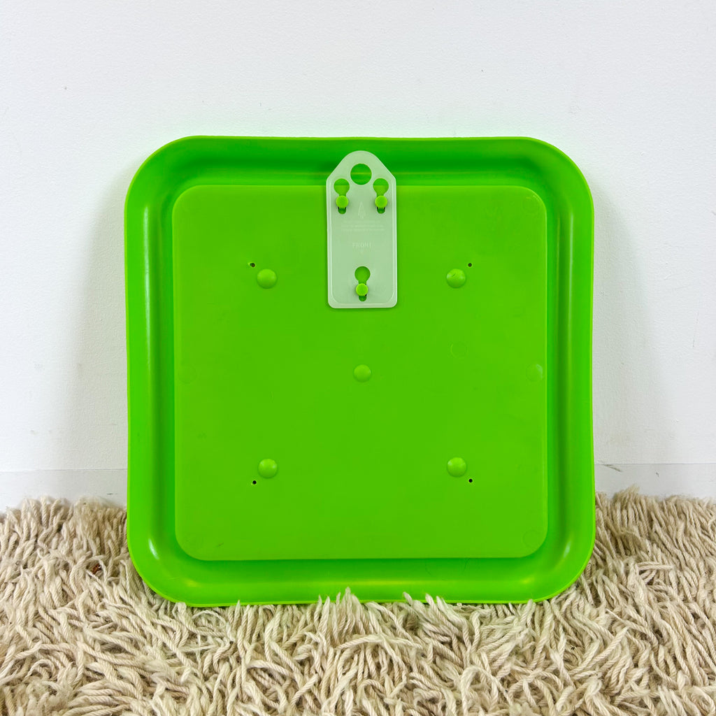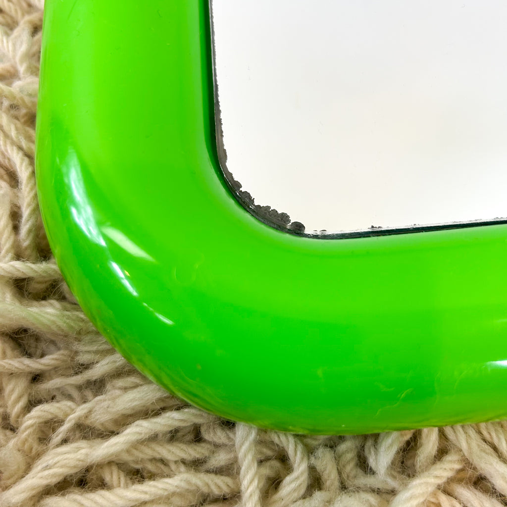 Vintage square wall mirror in bulbous lime green plastic frame. With hook on the back for hanging.