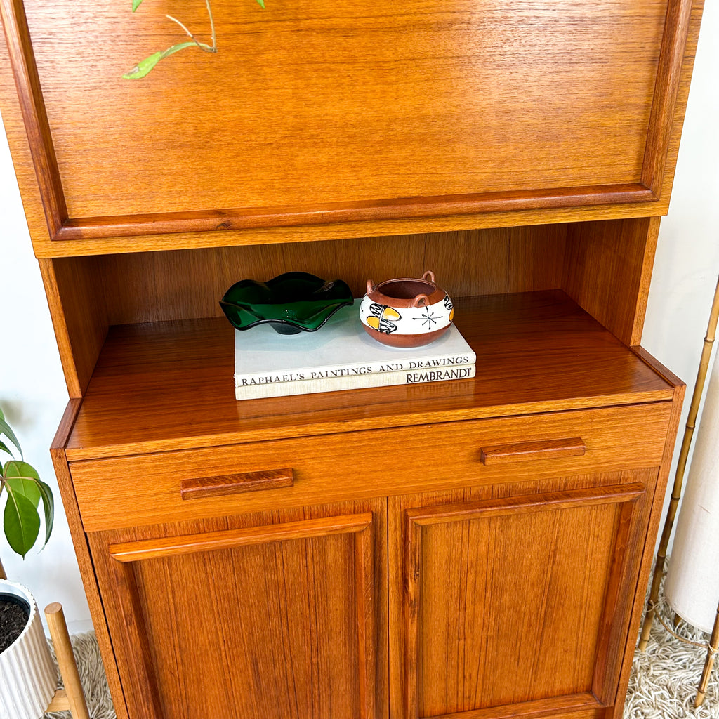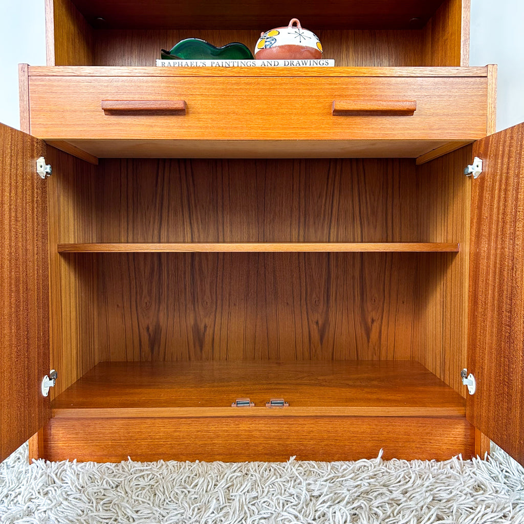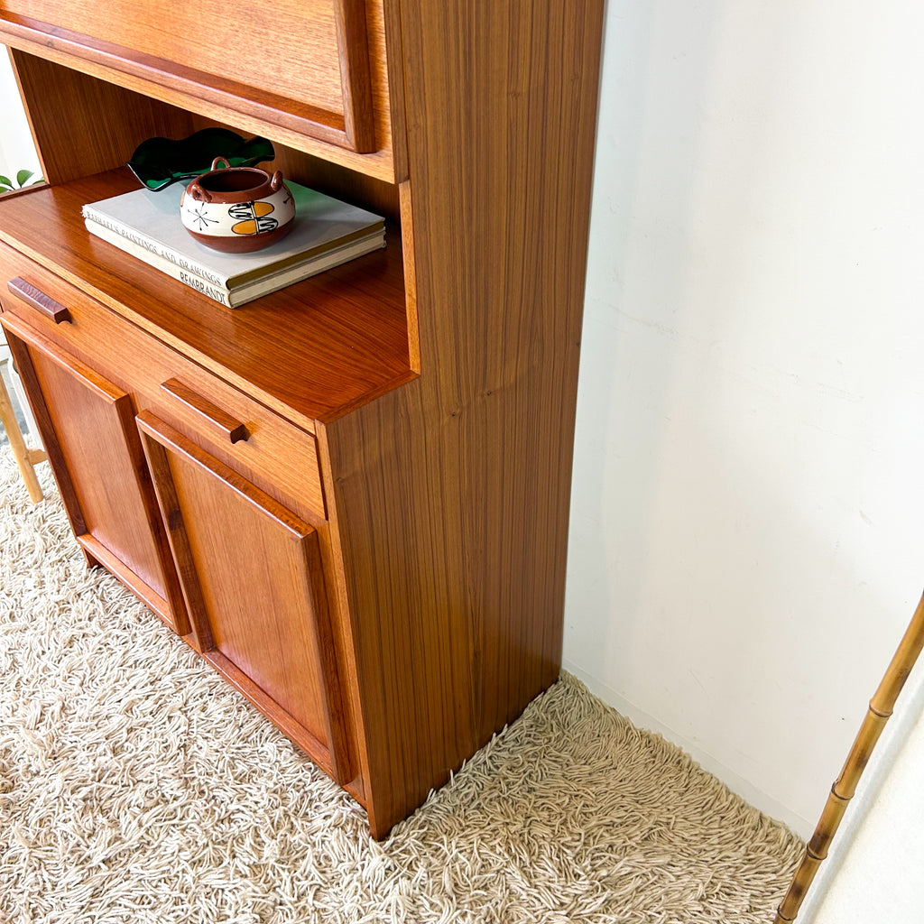 Lovely mid century wall unit/buffet made in Adelaide by Macrob Furniture. Featuring two open shelves, fold-down bar with slim wooden shelf. Wide single drawer and cabinet space with fixed shelf at the bottom. Nice solid timber details with hidden pulls. Beautiful classic design.