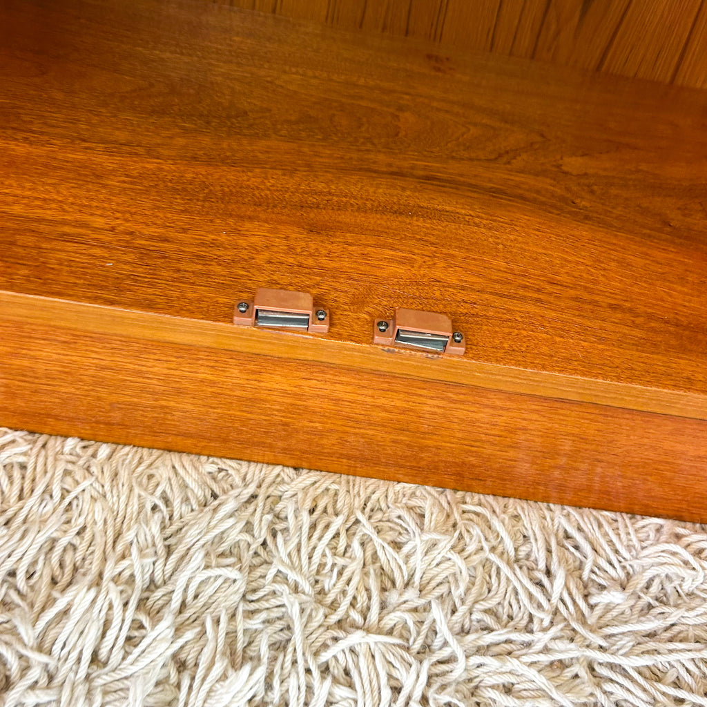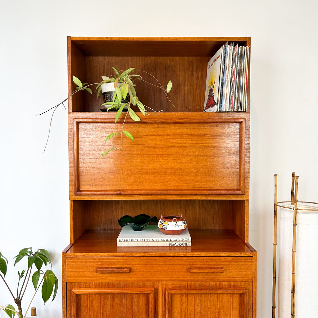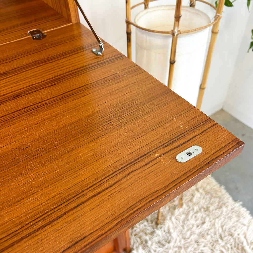 Lovely mid century wall unit/buffet made in Adelaide by Macrob Furniture. Featuring two open shelves, fold-down bar with slim wooden shelf. Wide single drawer and cabinet space with fixed shelf at the bottom. Nice solid timber details with hidden pulls. Beautiful classic design.
