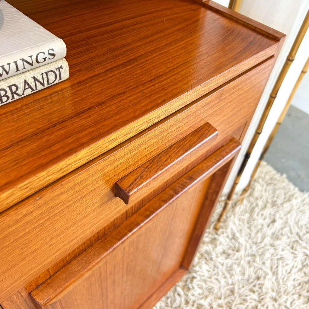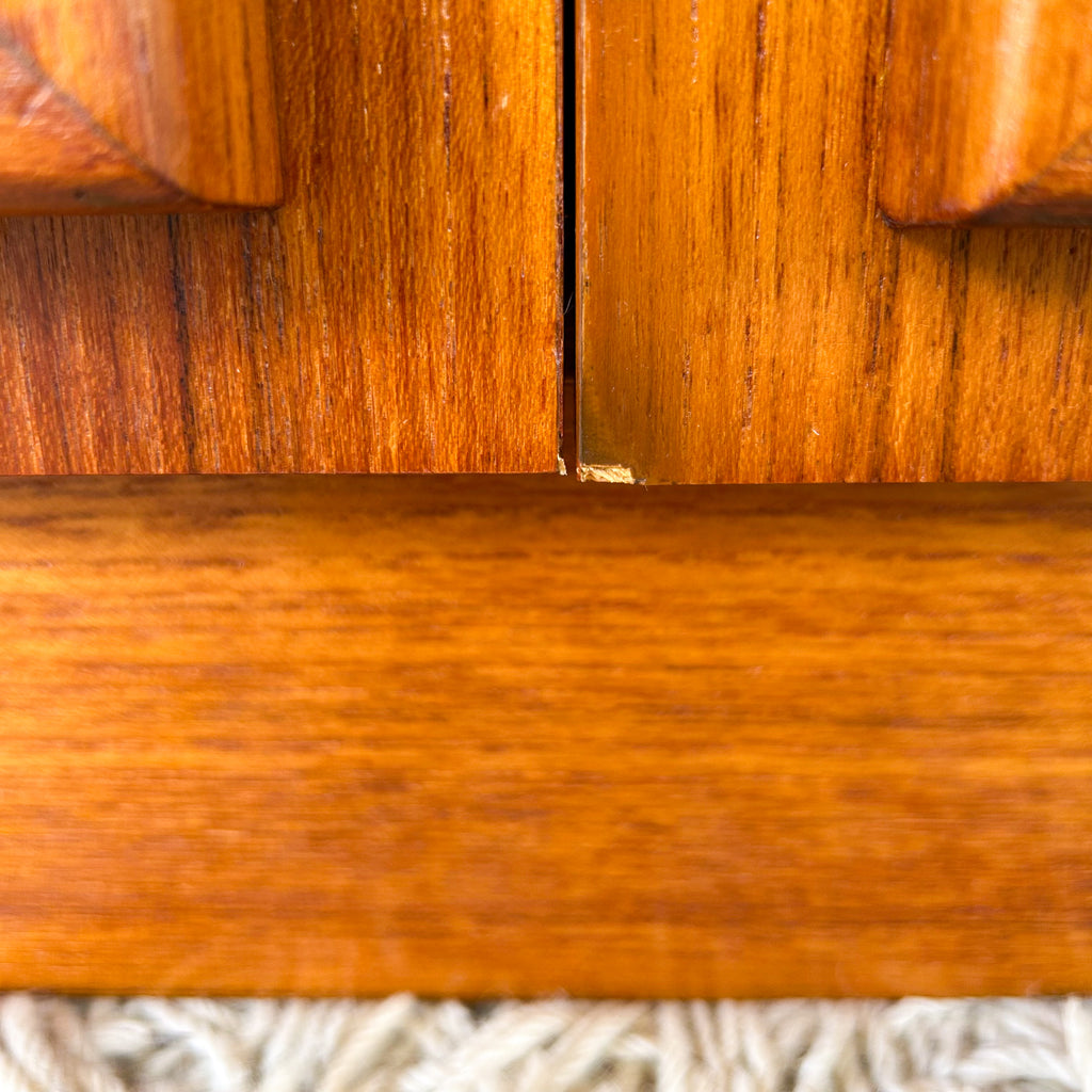 In very good condition. The two upper corners of the fold-down door have a little damage. There's some scuffs inside the door too. Tiny veneer chip on the bottom of one of the cabinet doors. Also worth nothing, the drawer & the cabinet doors don't sit entirely flush, but it doesn't affect use and isn't overly noticeable.