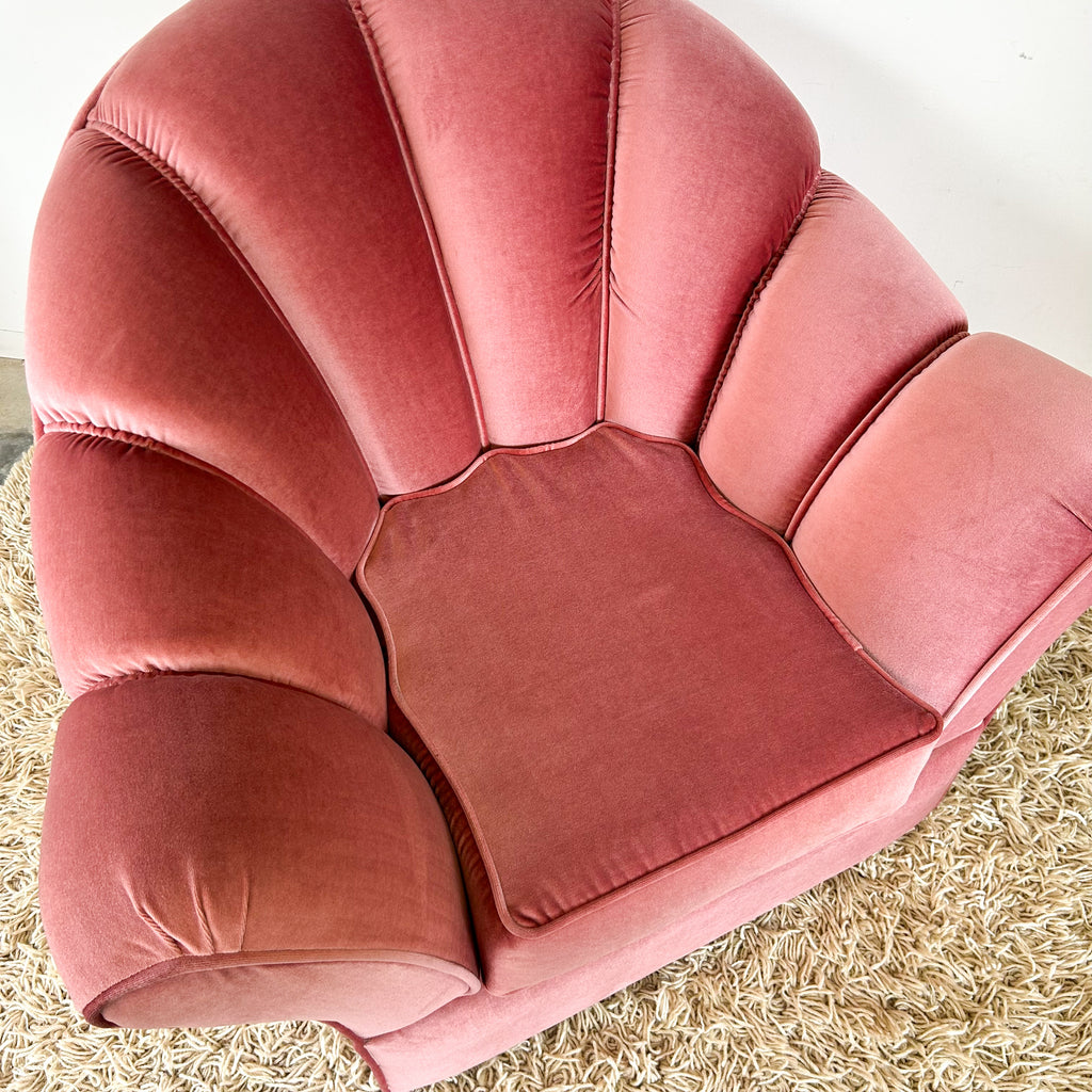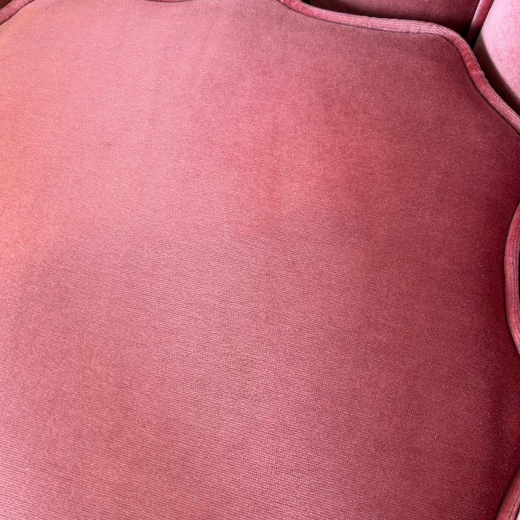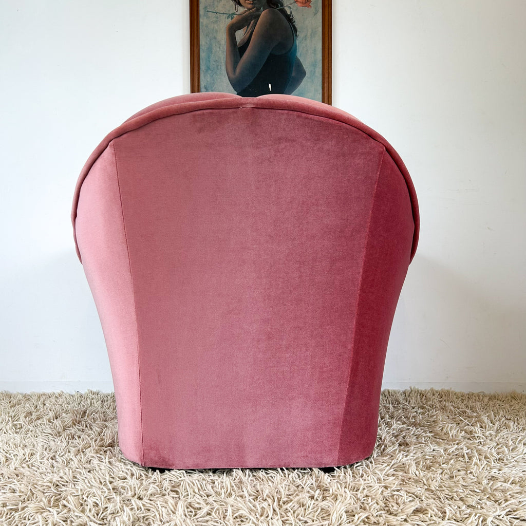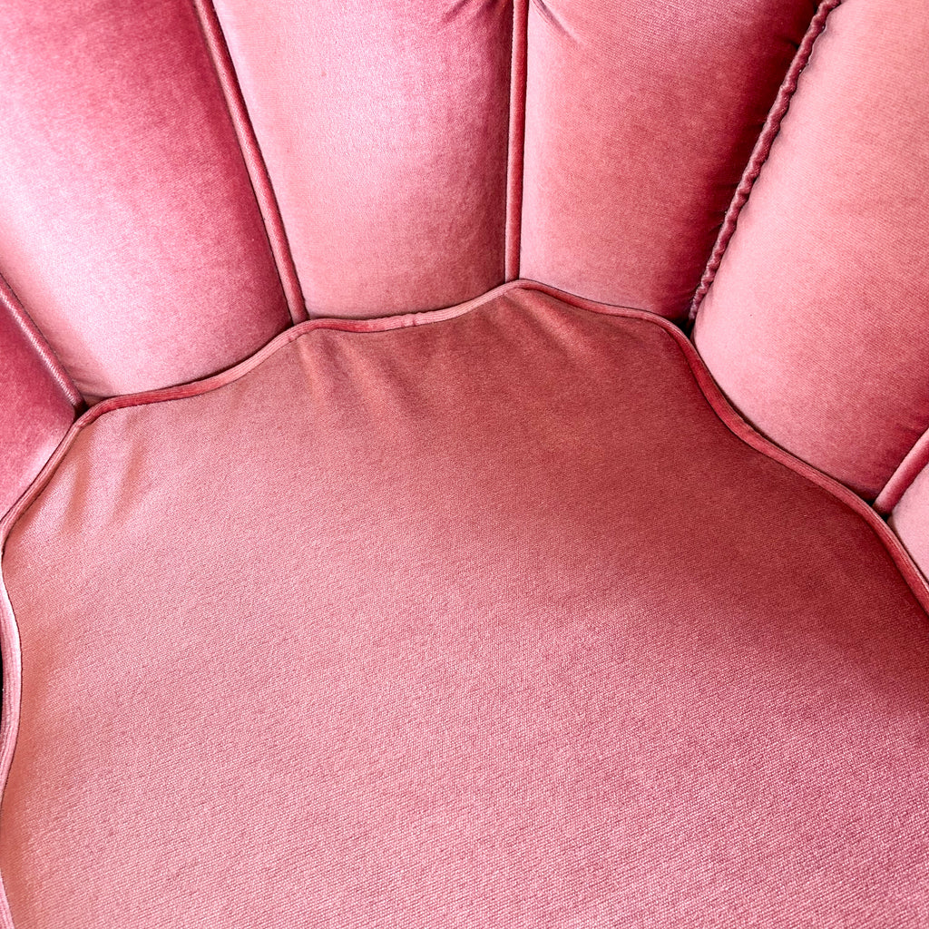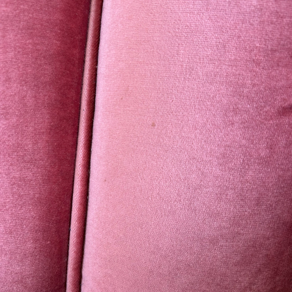 Unbelievably fabulous vintage pink velour armchair. Gorgeous fan shaped back and even the seat cushion is shaped to fit. Bubblegum pink colour - there's a lot of variance in colour in the photos, simply from how the upholstery catches the light at different angles, there's no fading!!