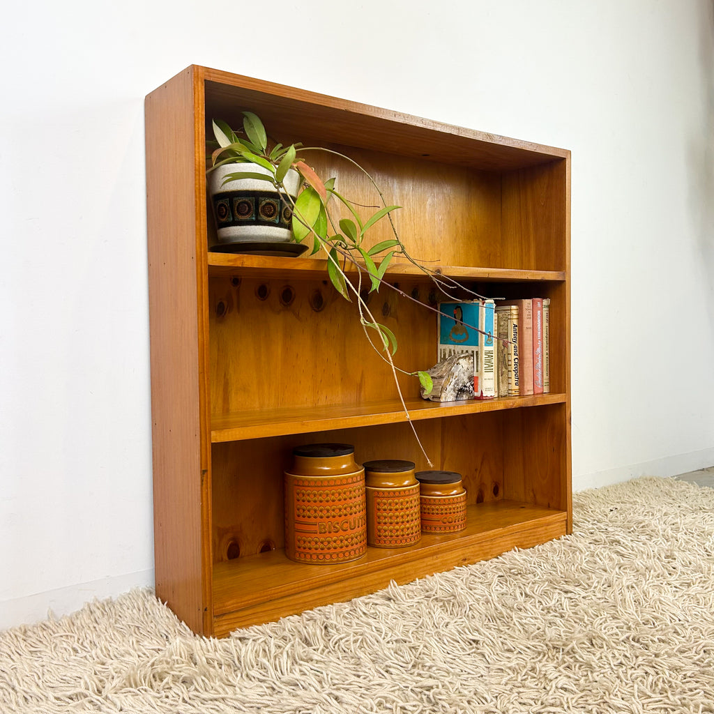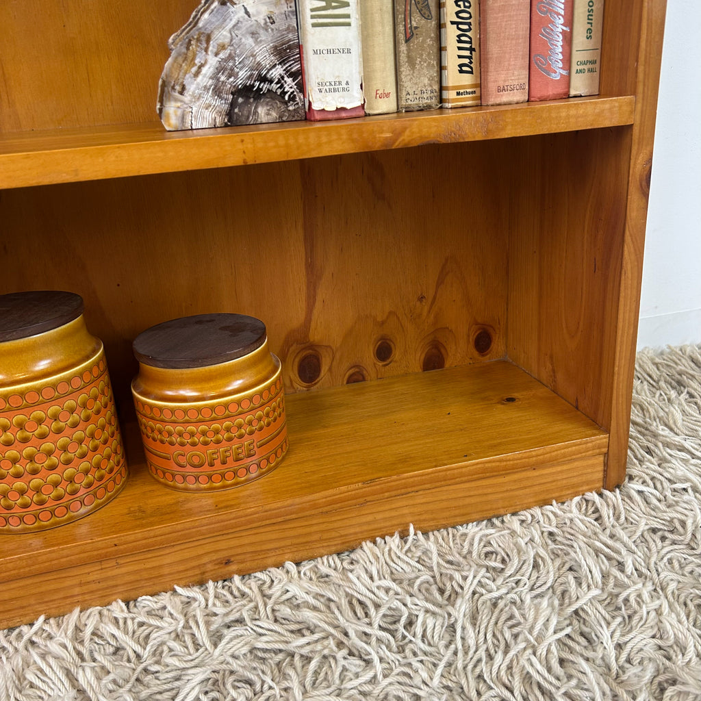 Vintage bookcase, solid pine construction with ply backing. The natural wood tone is rich and warm. A nice, classic piece that holds loads!