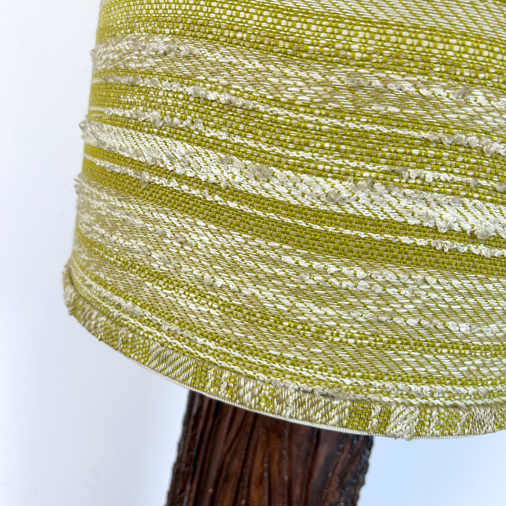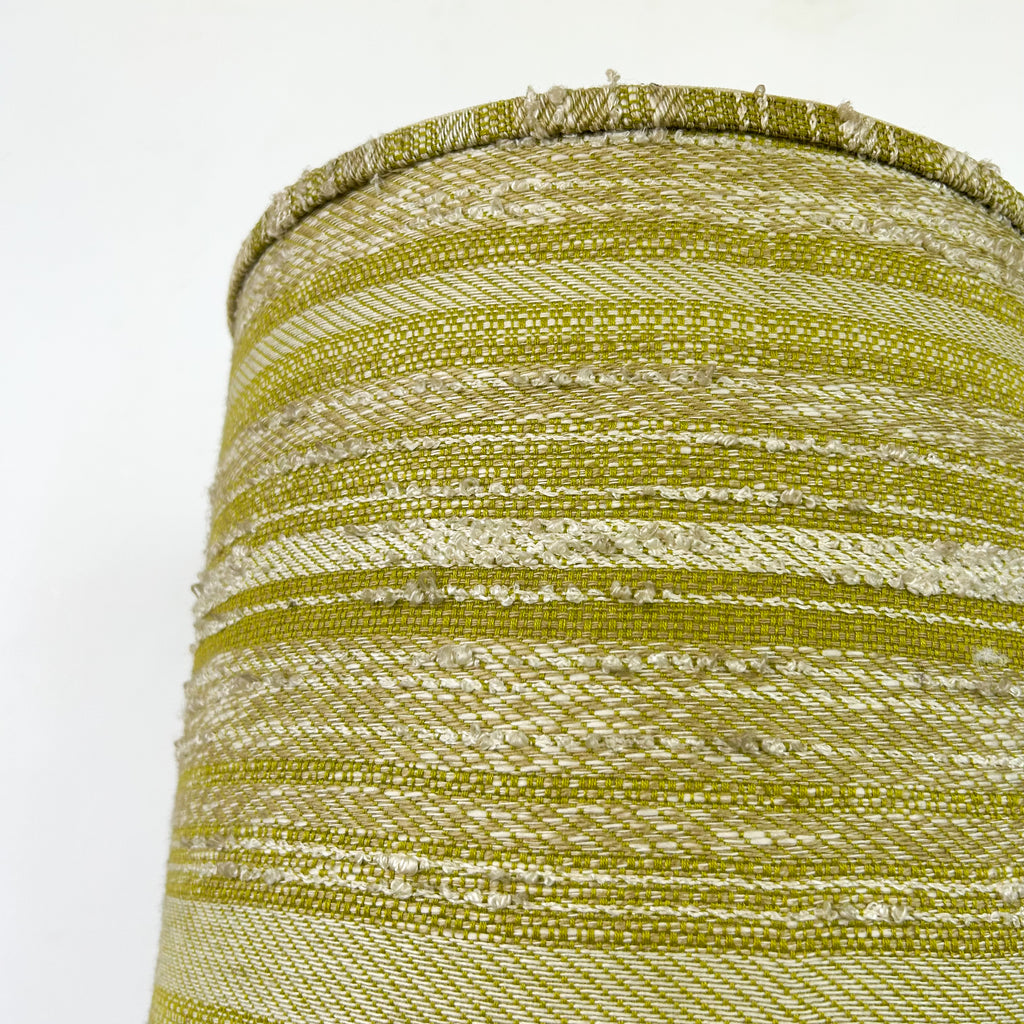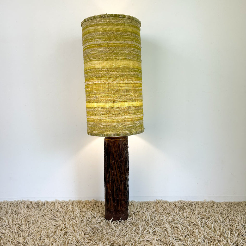 Vintage lamp, heavy cylindrical pottery base with textured green patterned shade. Be sure to check measurements - it's HUGE! (See cat for size reference.)