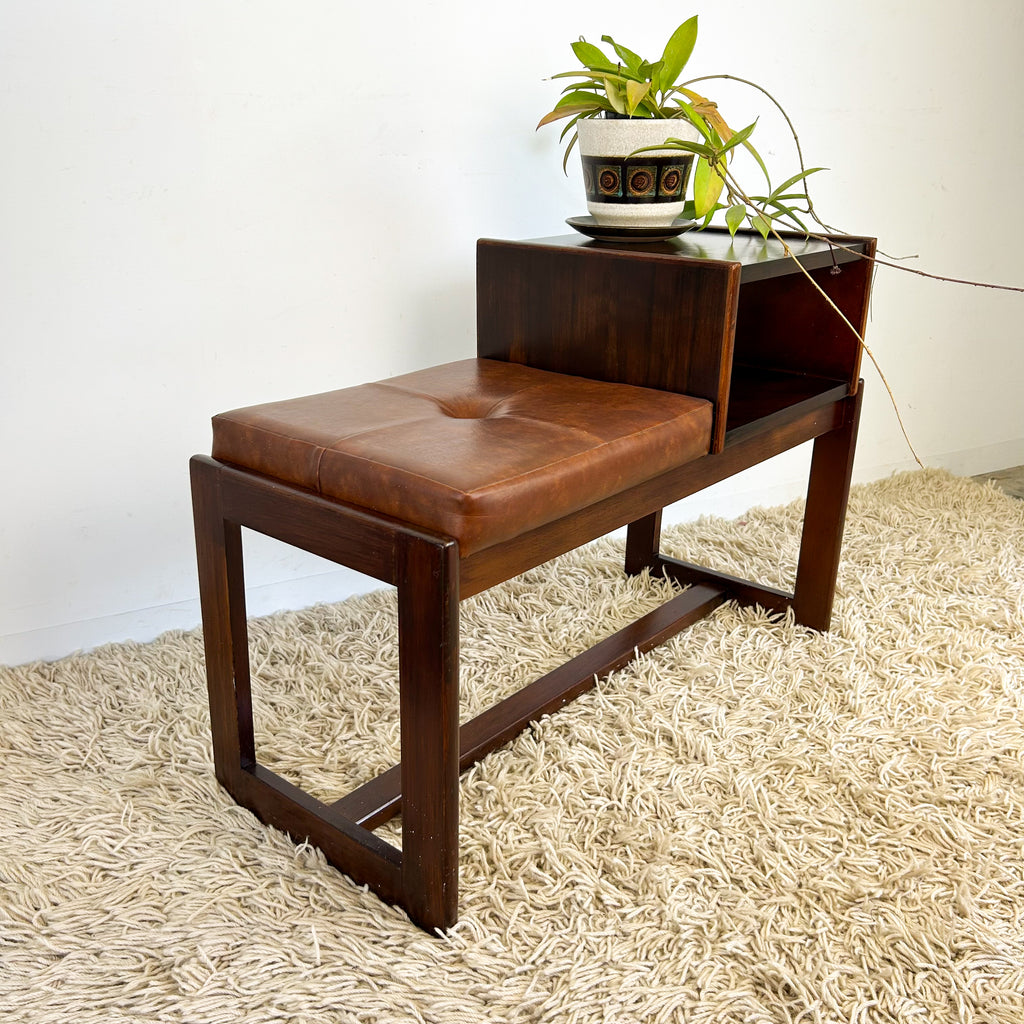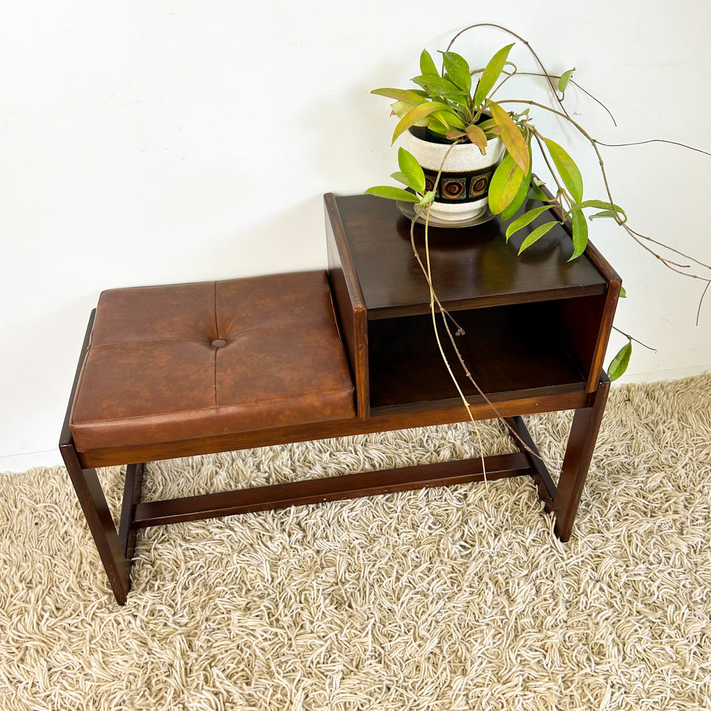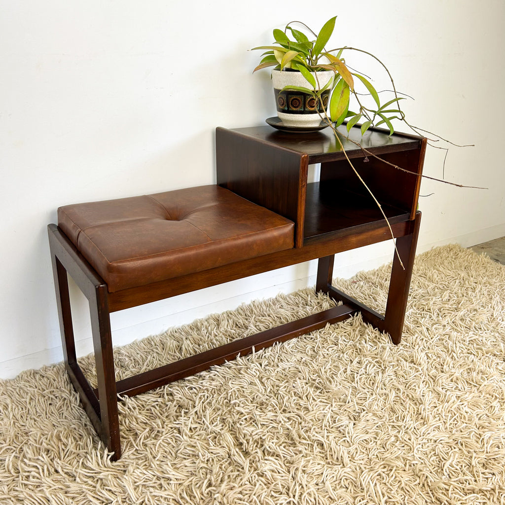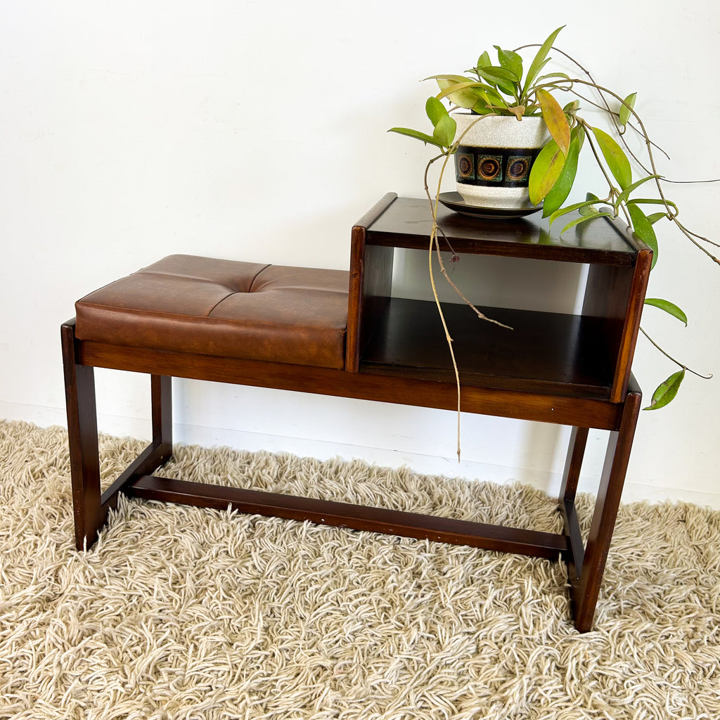 Vintage phone table. Timber sleigh base legs with brown vinyl seat. Great for a hallway/entryway, perfect to stop and take your shoes off/dump your keys etc.