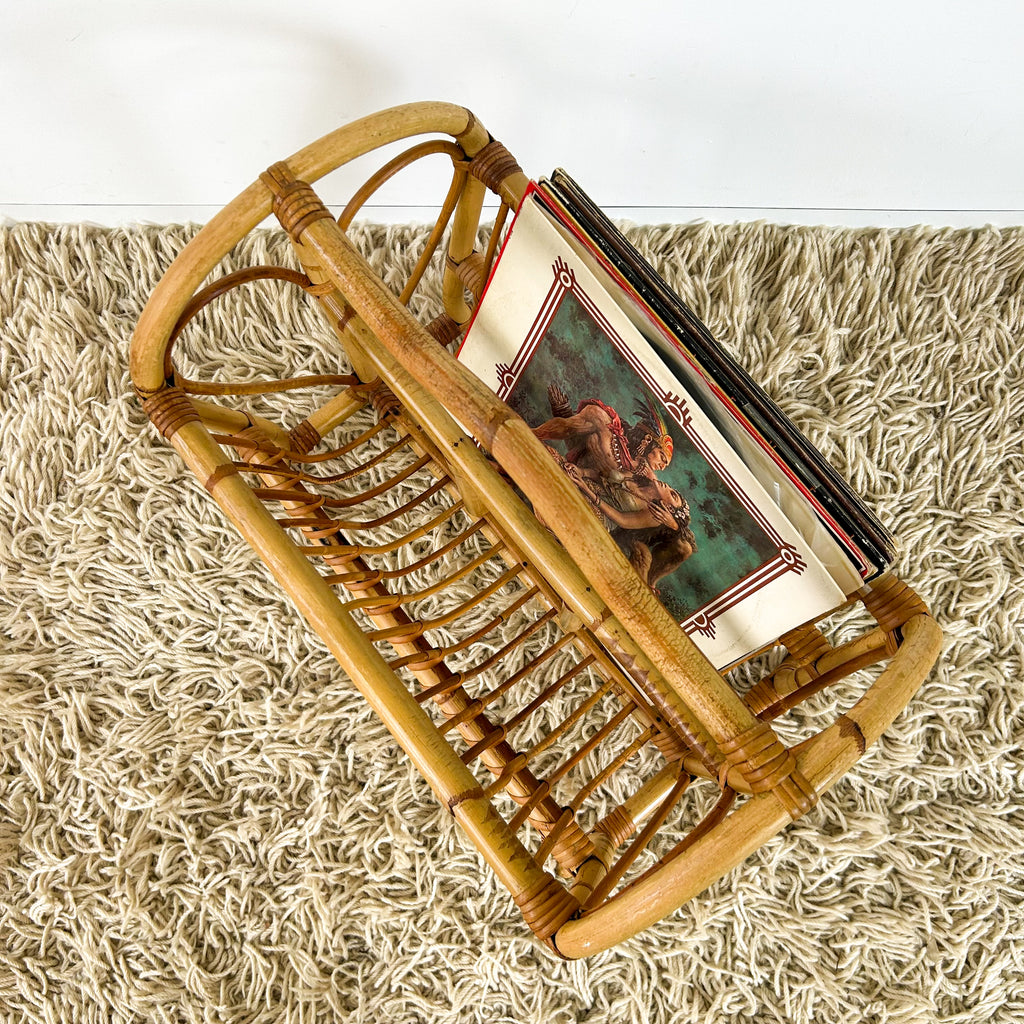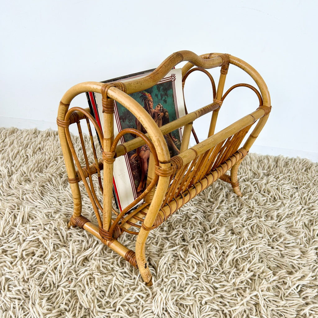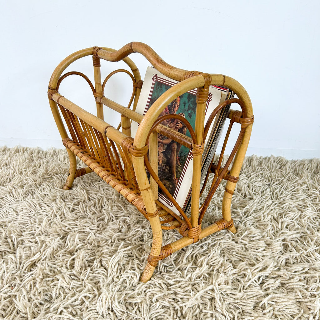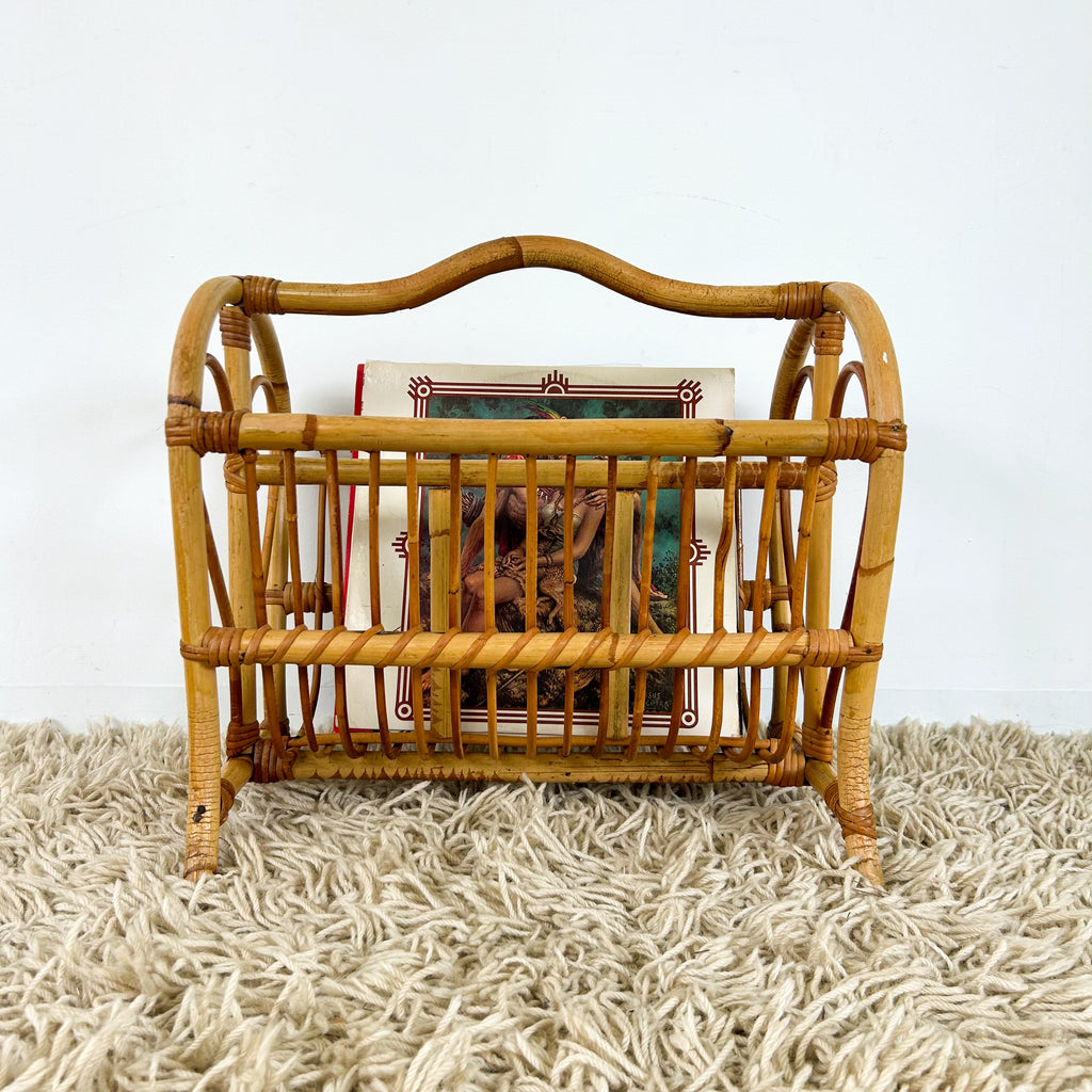 Vintage cane magazine rack with sweet love heart detail. Large enough to fit vinyl too. Great for storing books in a kids room.