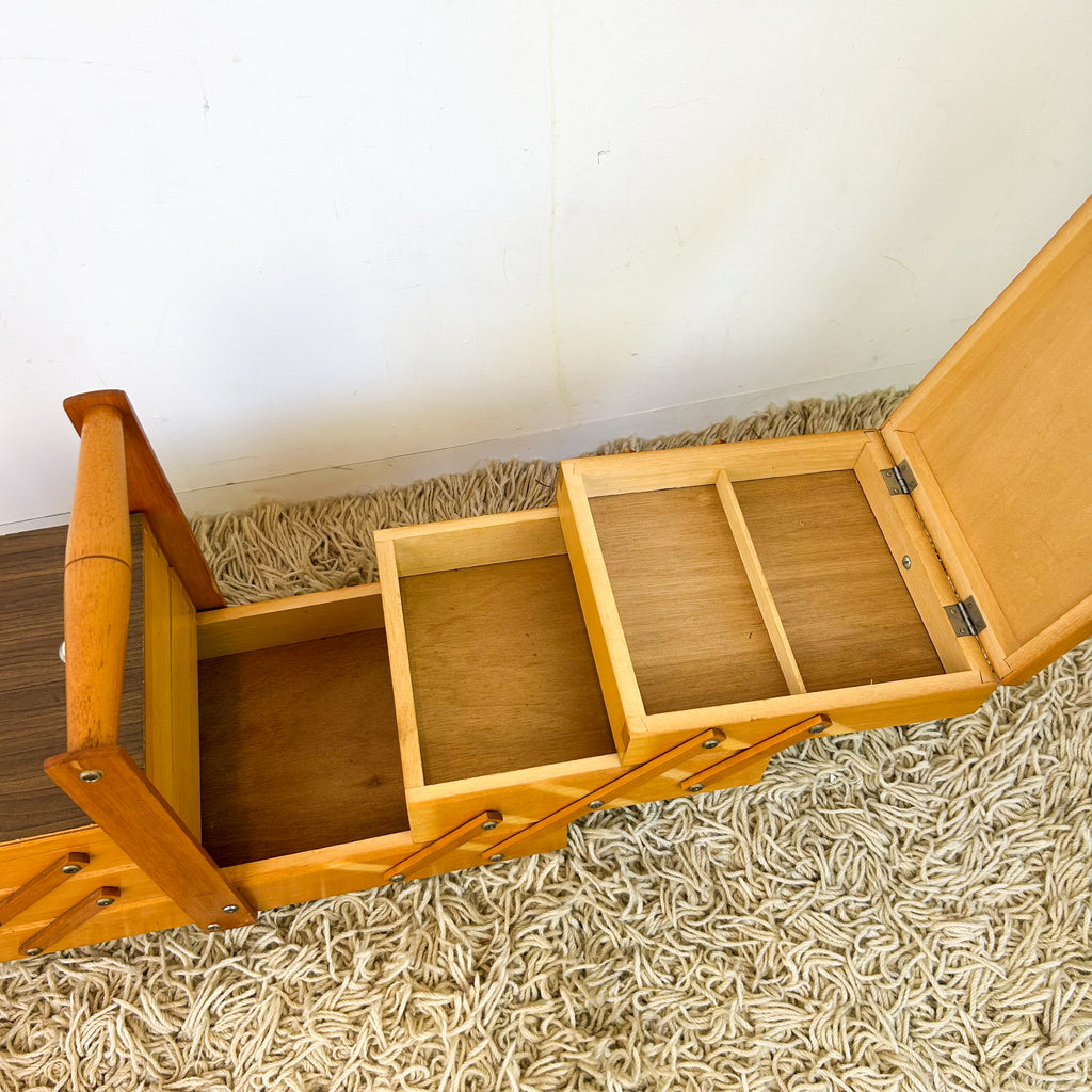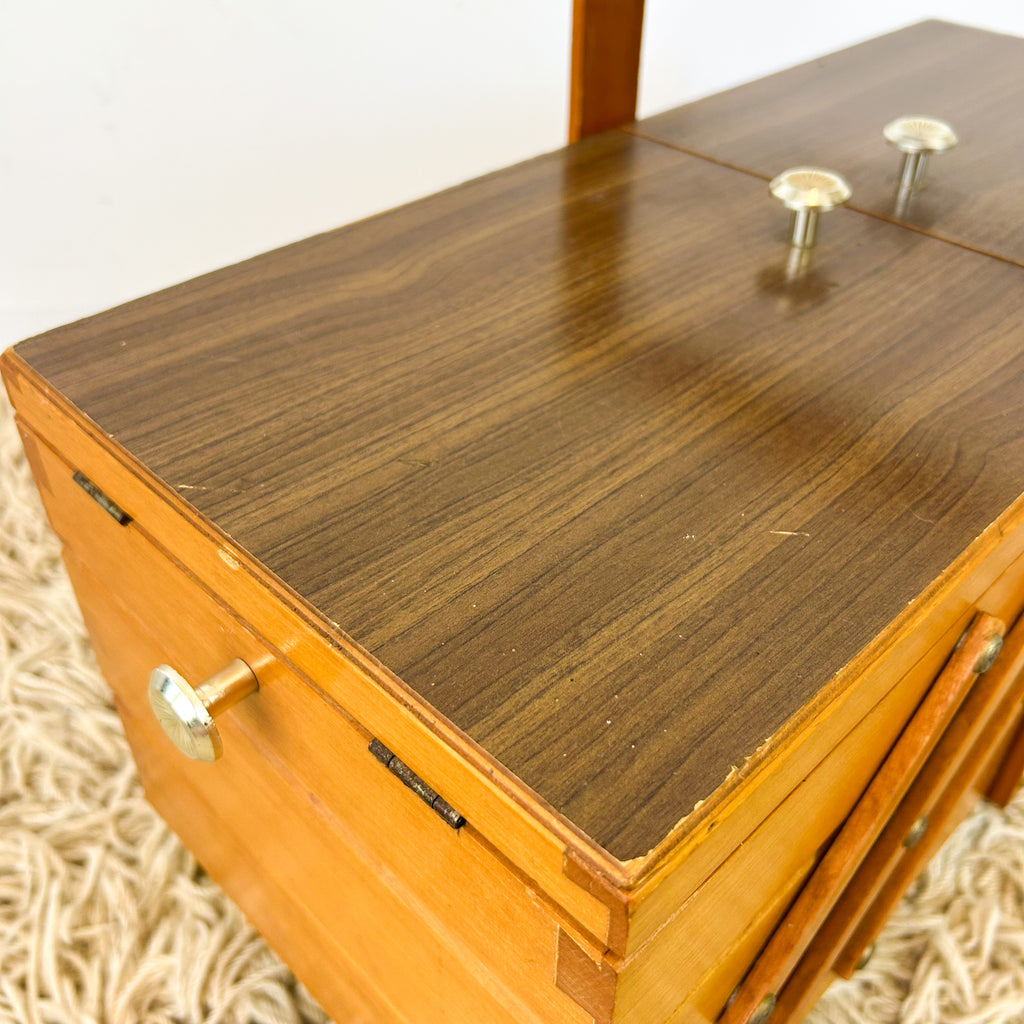Vintage wooden sewing box. Three tier storage with cantilever opening, cute little feet & handle and faux metal knobs. Tops of the lids are laminate. Also great for storing little odds and ends, tools or collections of small items.