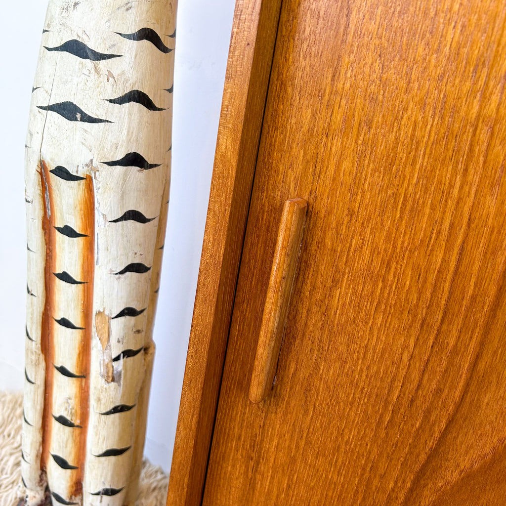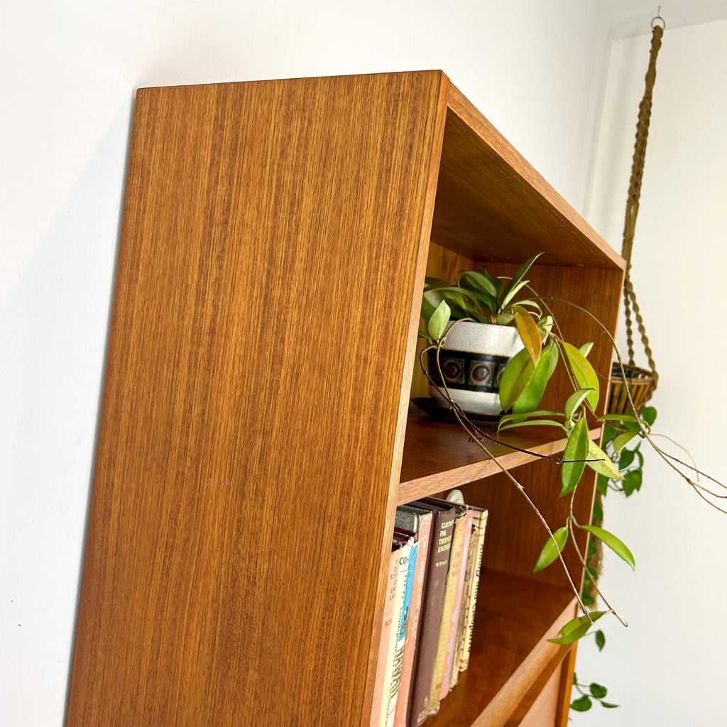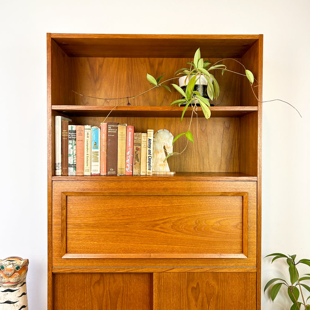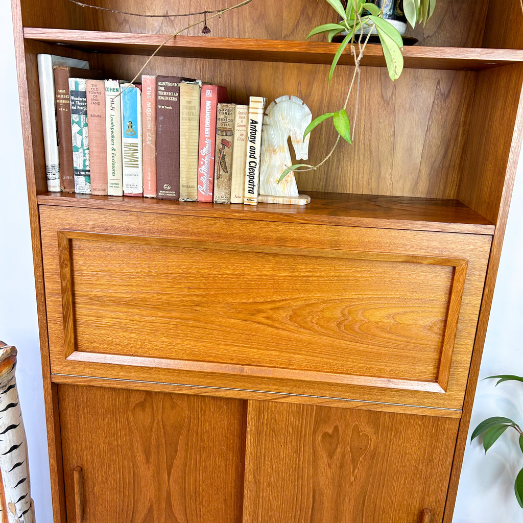 Lovely mid century wall unit/buffet made in Adelaide by Macrob Furniture. Featuring two open shelves, fold-down bar with slim wooden shelf and cabinet space with fixed shelf at the bottom. Nice solid timber details. Beautiful classic design.