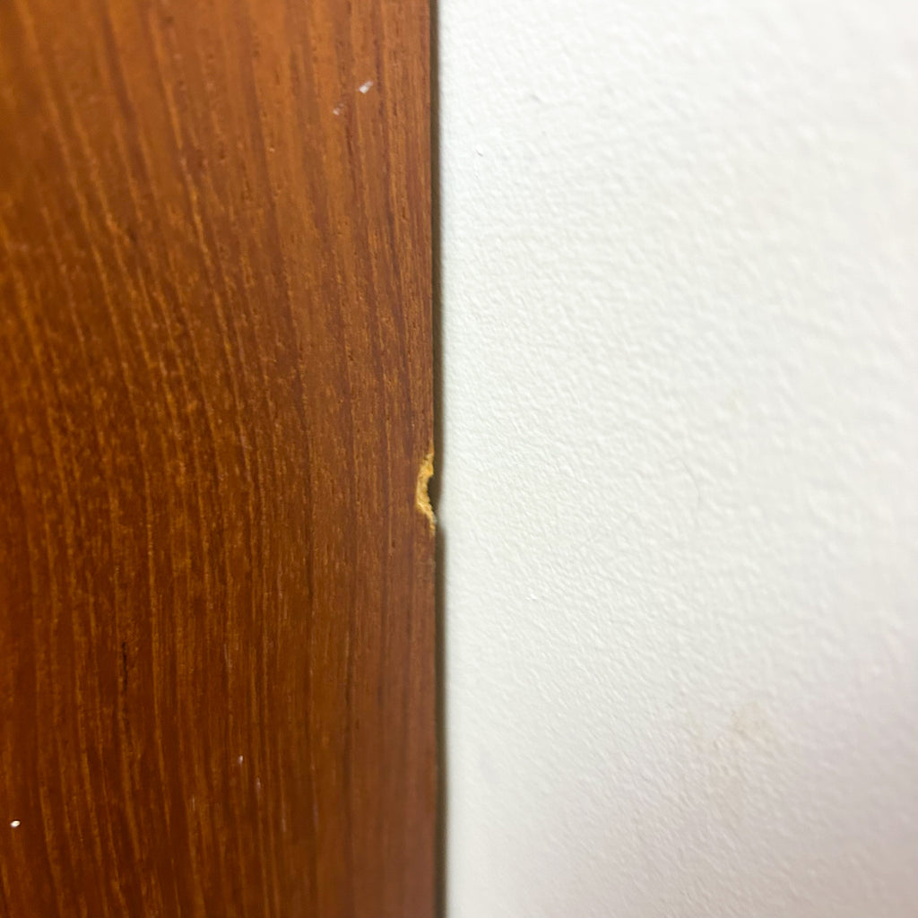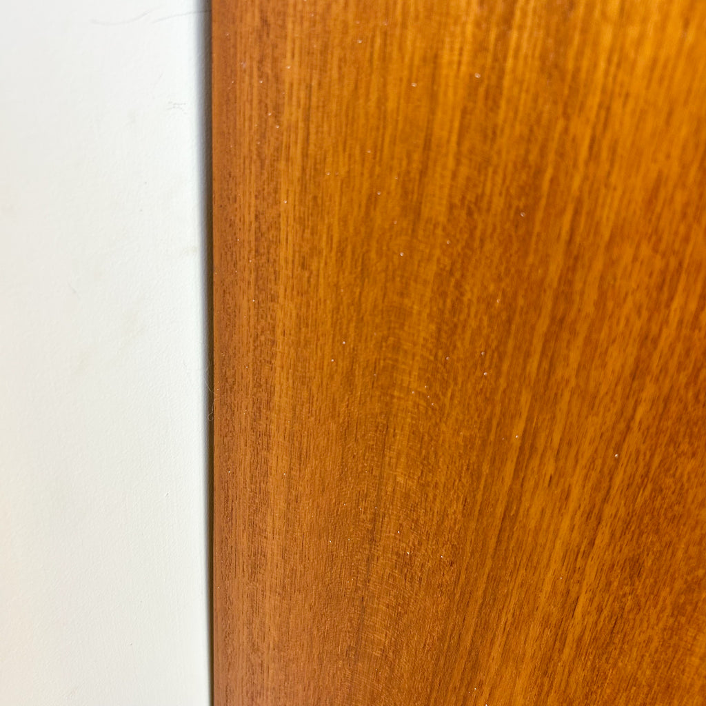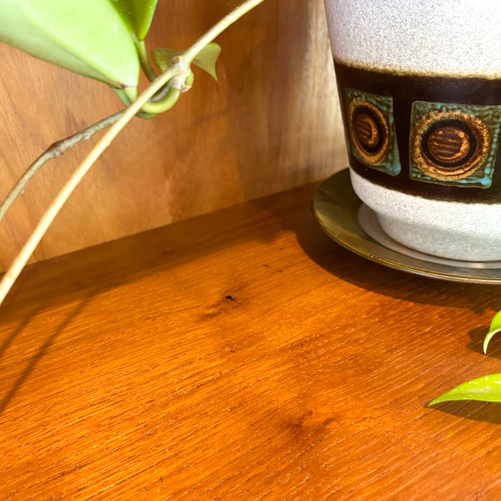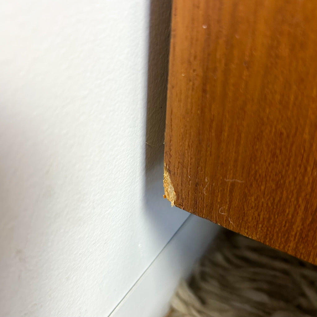 In very good condition. Only two very tiny chips to the veneer on the sides at the back. A few light scuffs & marks. One small mark on one of the upper shelves. And the handle on the left sliding door has been re-glued previously - it's solid, but a tiny bit messy. See pics for details.