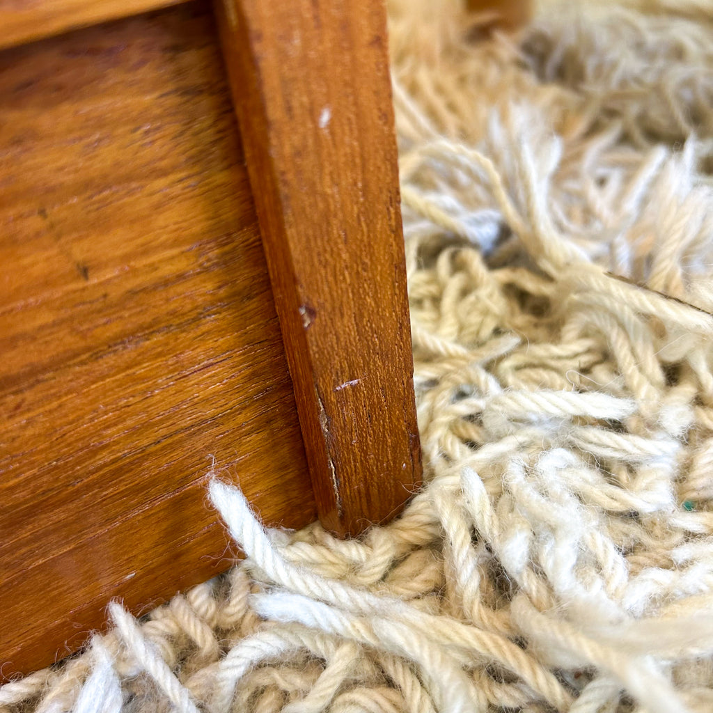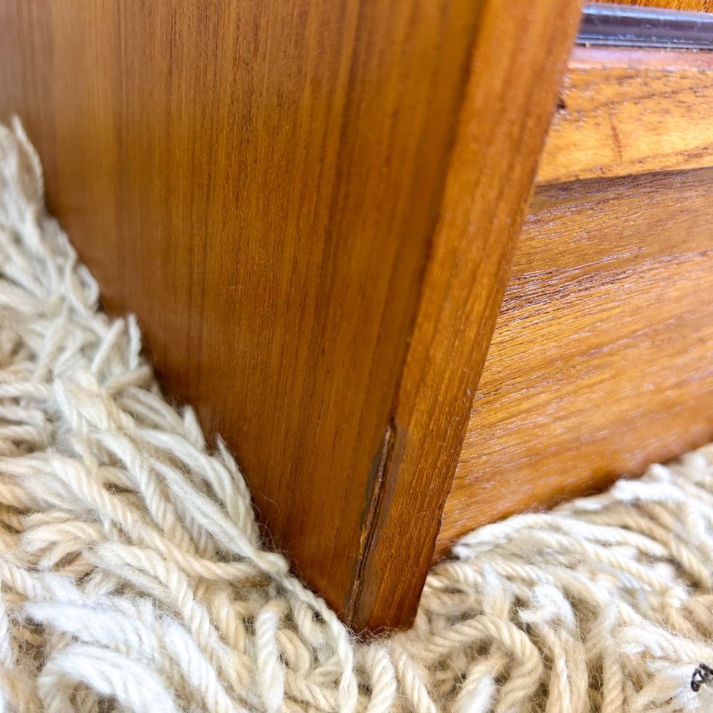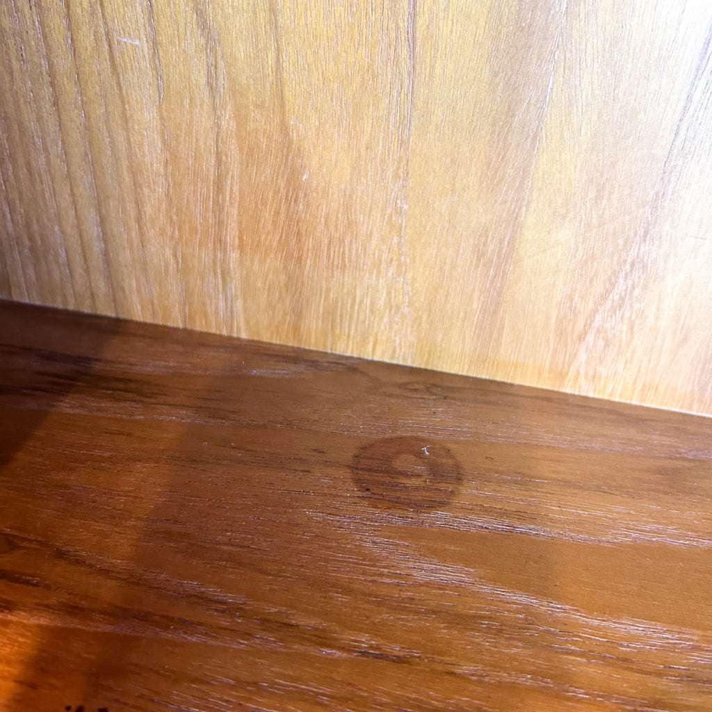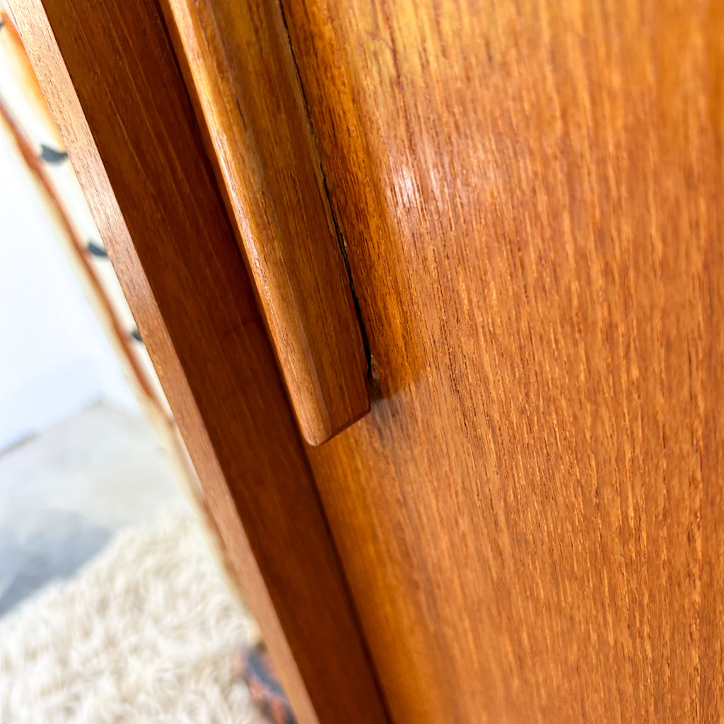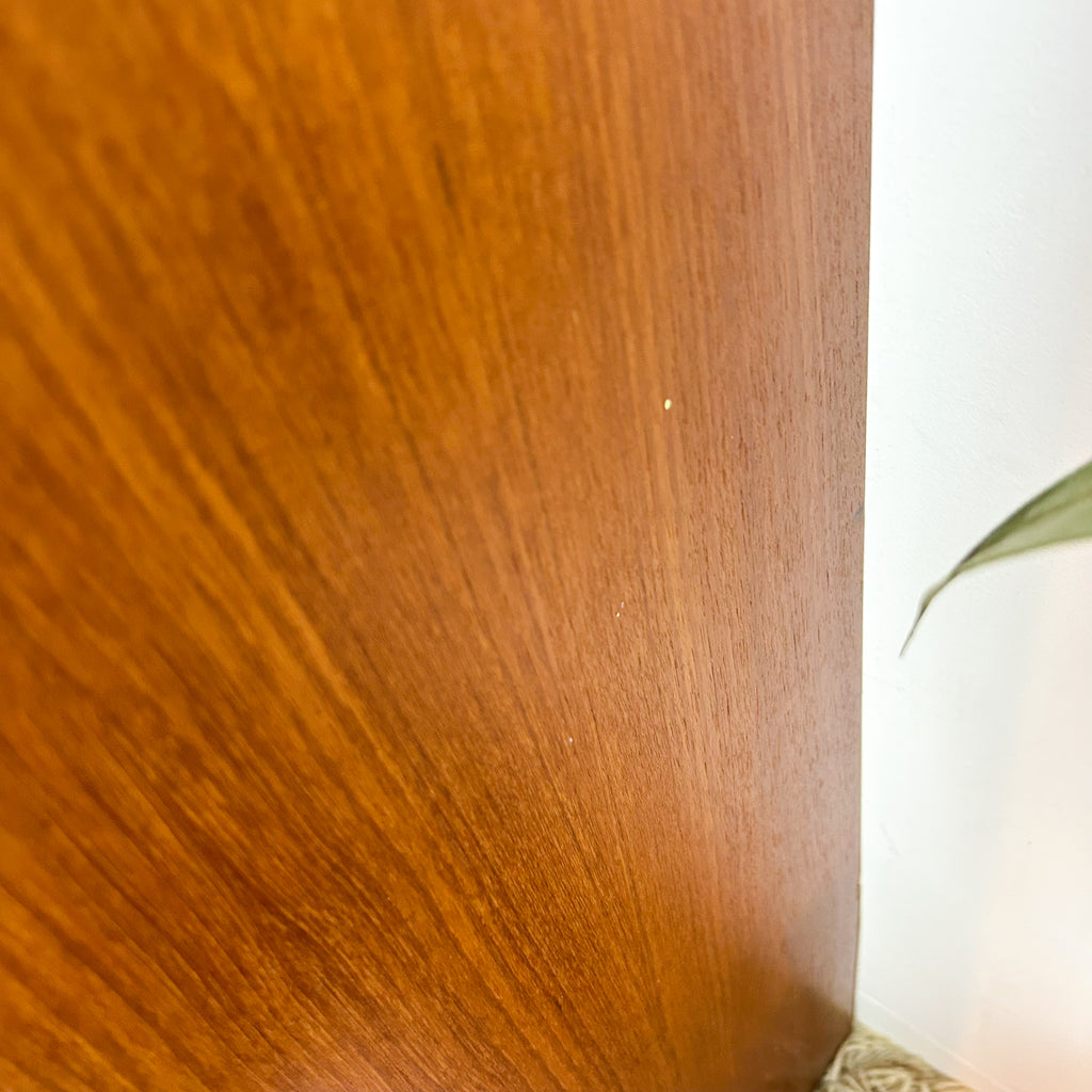 In very good condition. Only two very tiny chips to the veneer on the sides at the back. A few light scuffs & marks. One small mark on one of the upper shelves. And the handle on the left sliding door has been re-glued previously - it's solid, but a tiny bit messy. See pics for details.