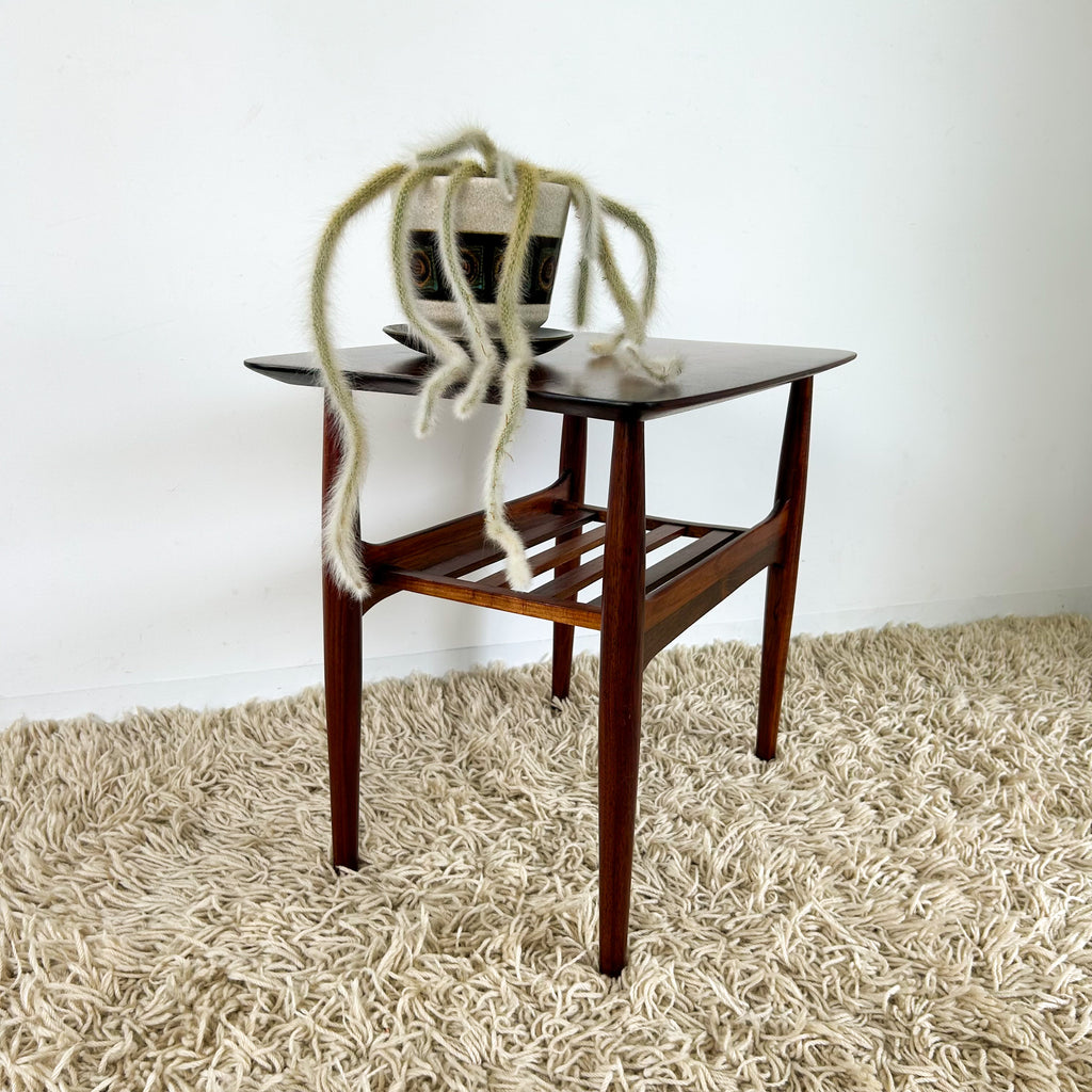 Vintage coffee table with lovely tall cigar legs and slatted magazine rack. Solid timber. A beautiful classic design.