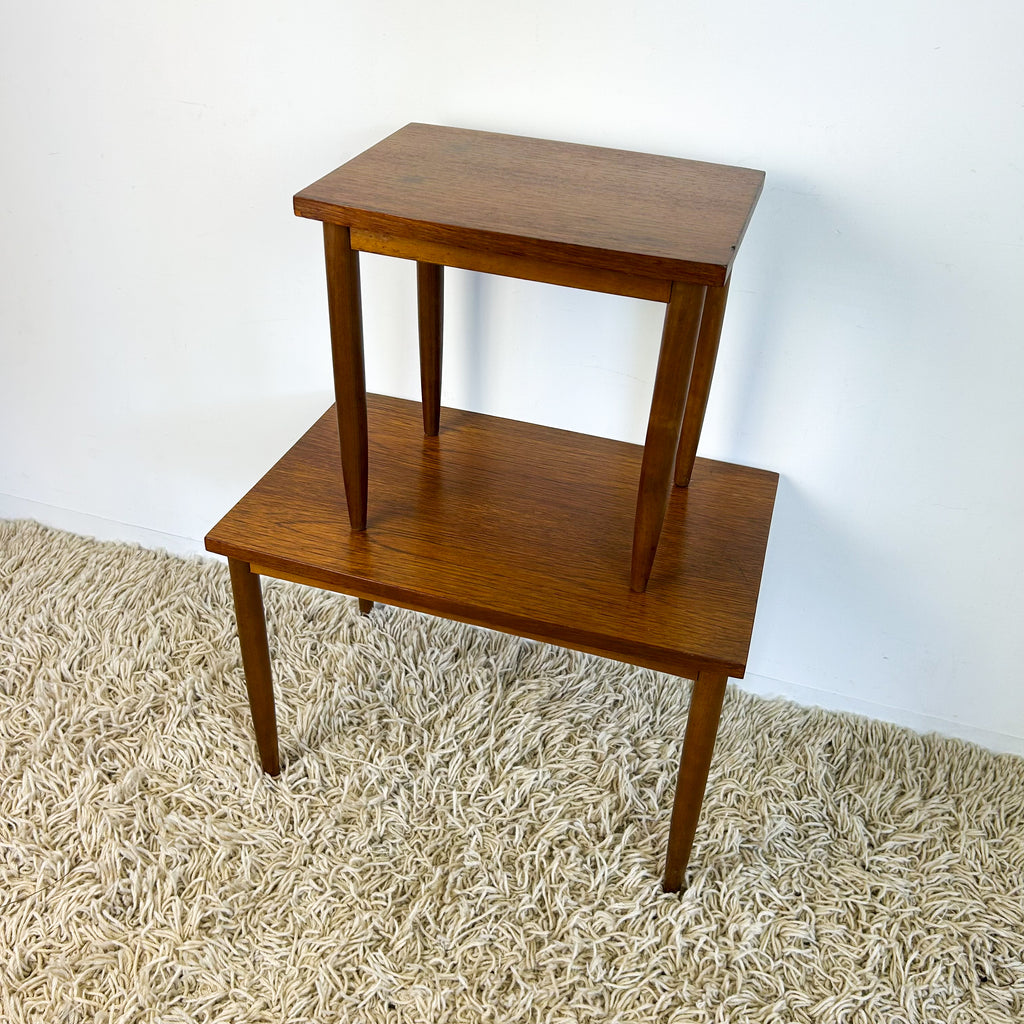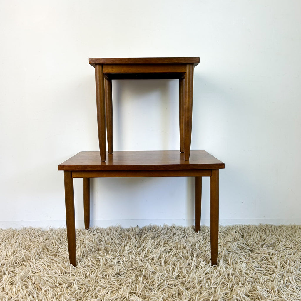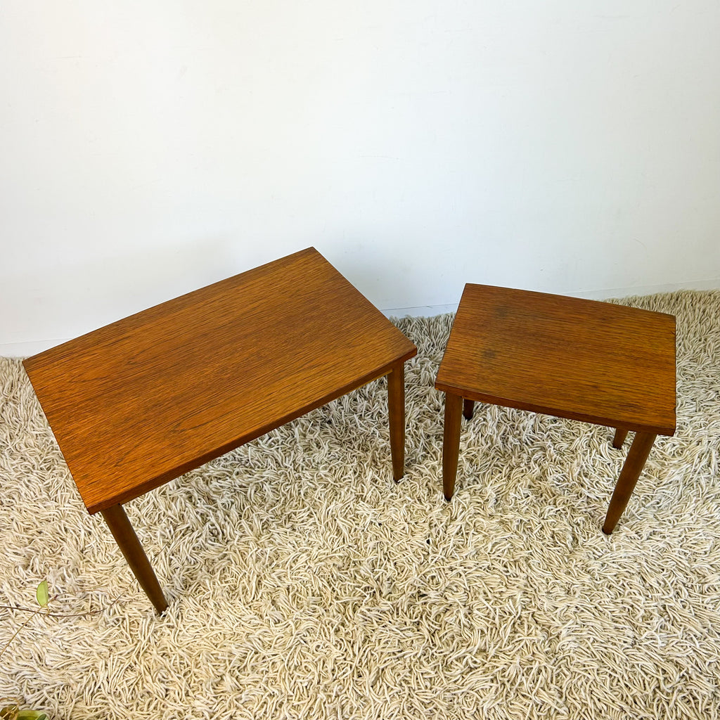 Vintage coffee table set. Two teak veneer tables with tapered legs.