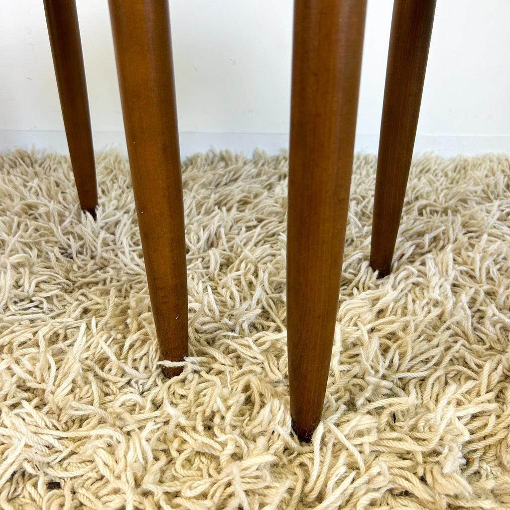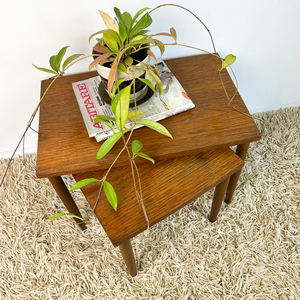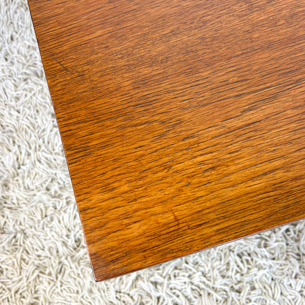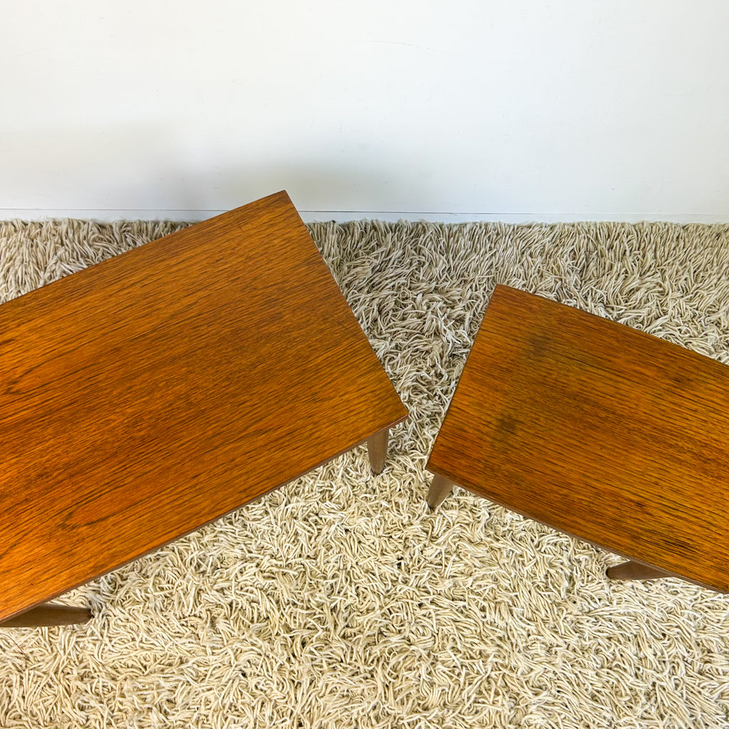 Vintage coffee table set. Two teak veneer tables with tapered legs.