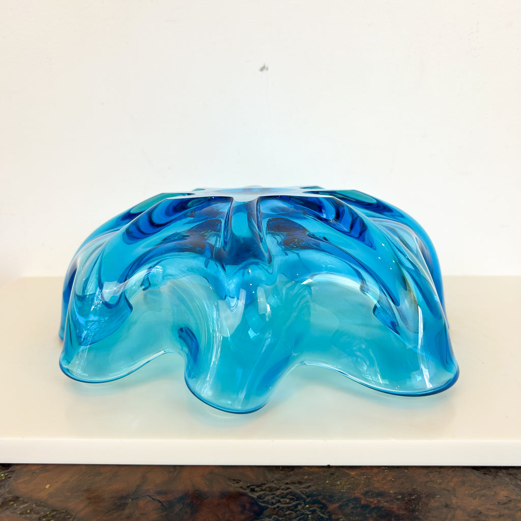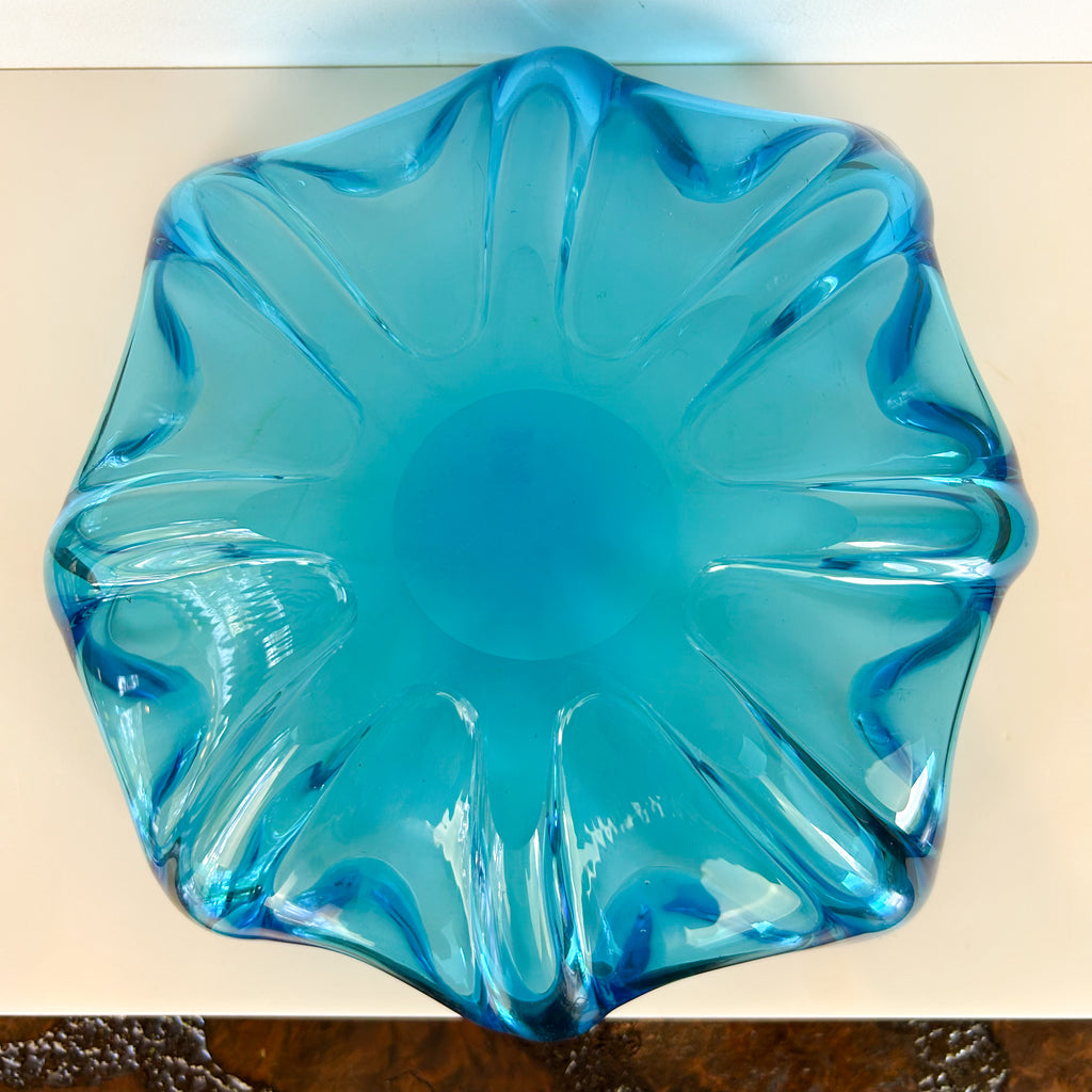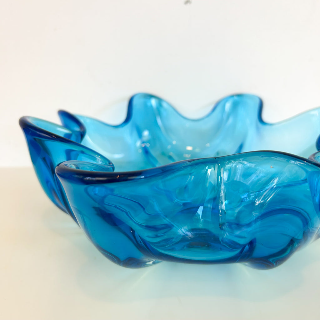 Vintage handblown glass bowl/centrepiece in beautiful blue. Pretty fluted shape and the glass absolutely glistens. Unsure of its origins, but very much in the style of Japanese glass.