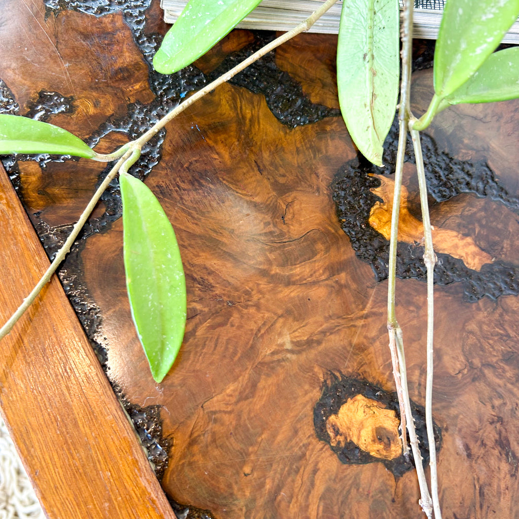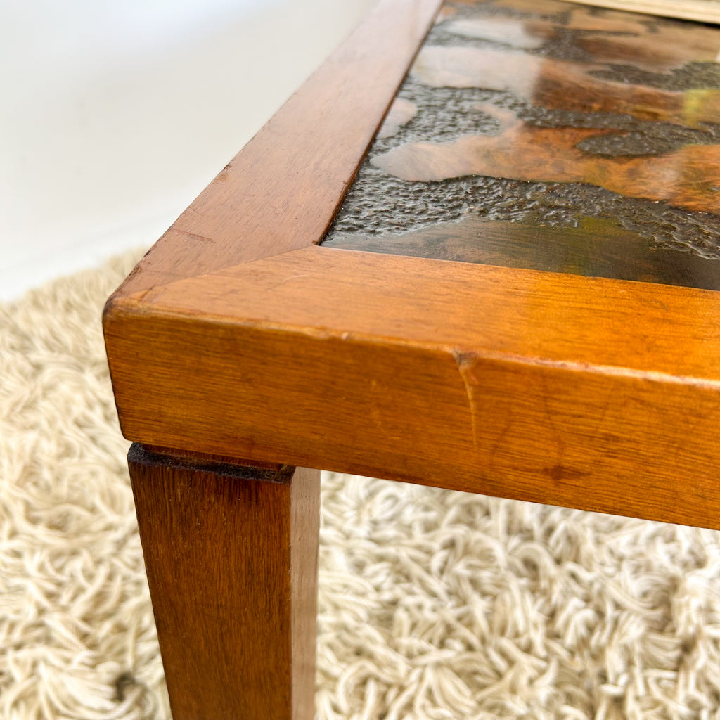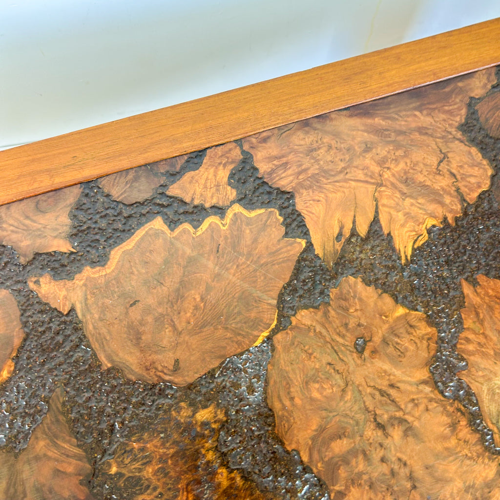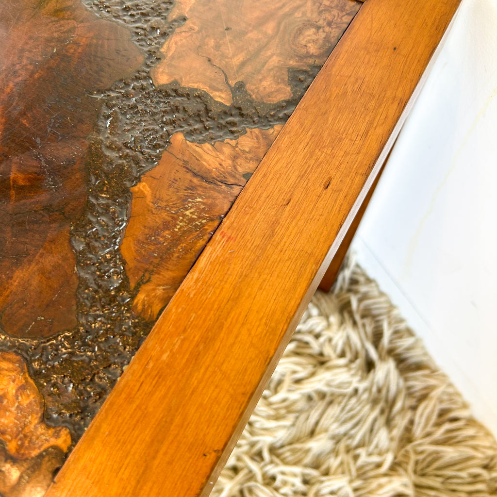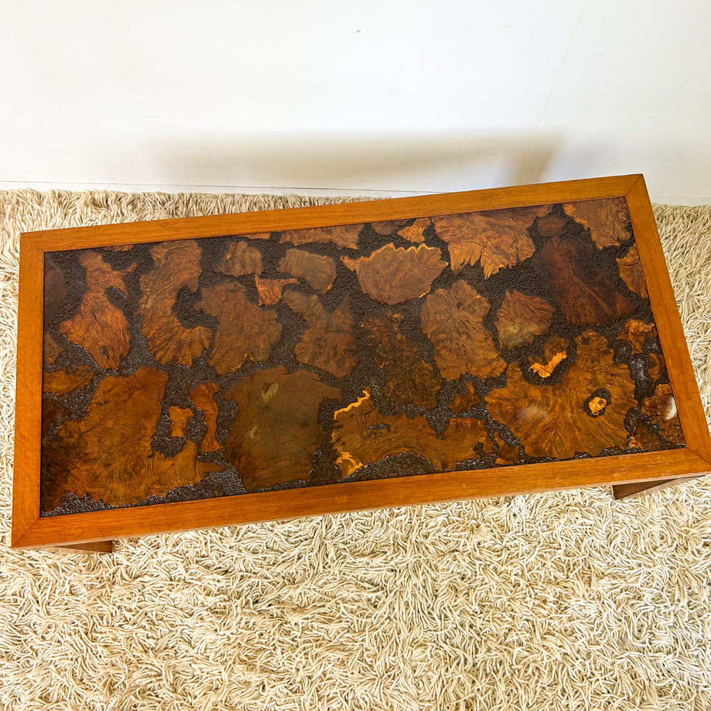 1970s vintage coffee table with burl wood tabletop and solid frame. The pattern of the wood is really beautiful.