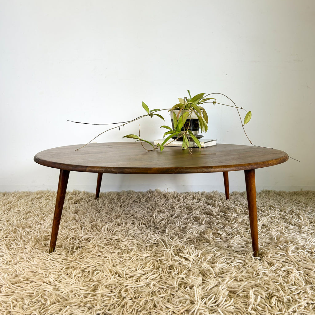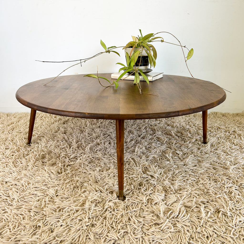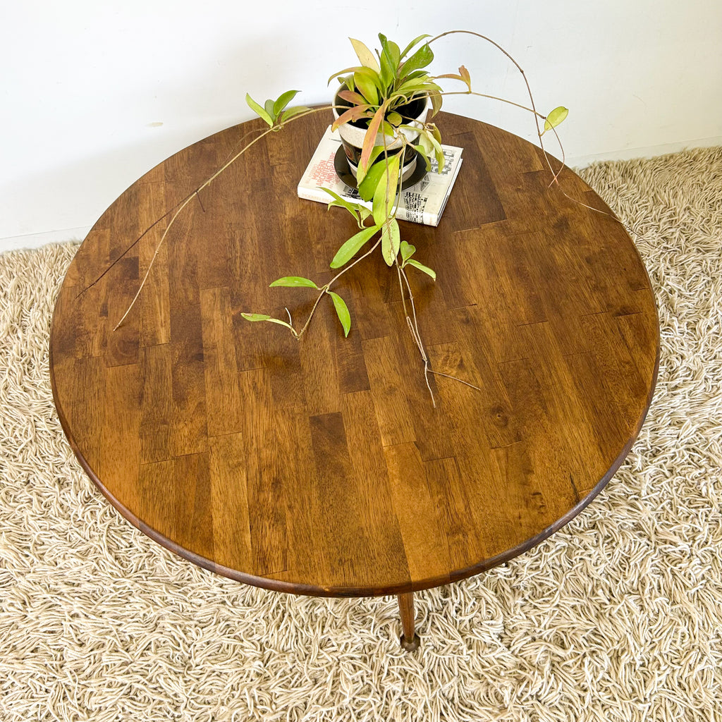 Large round vintage coffee table. Solid timber with slim tapered legs with metal capped feet.