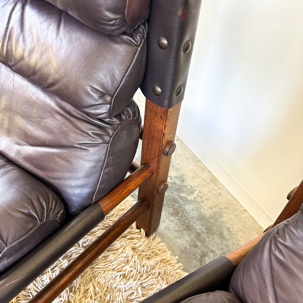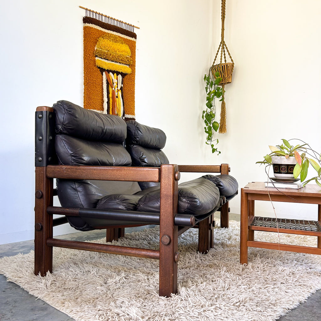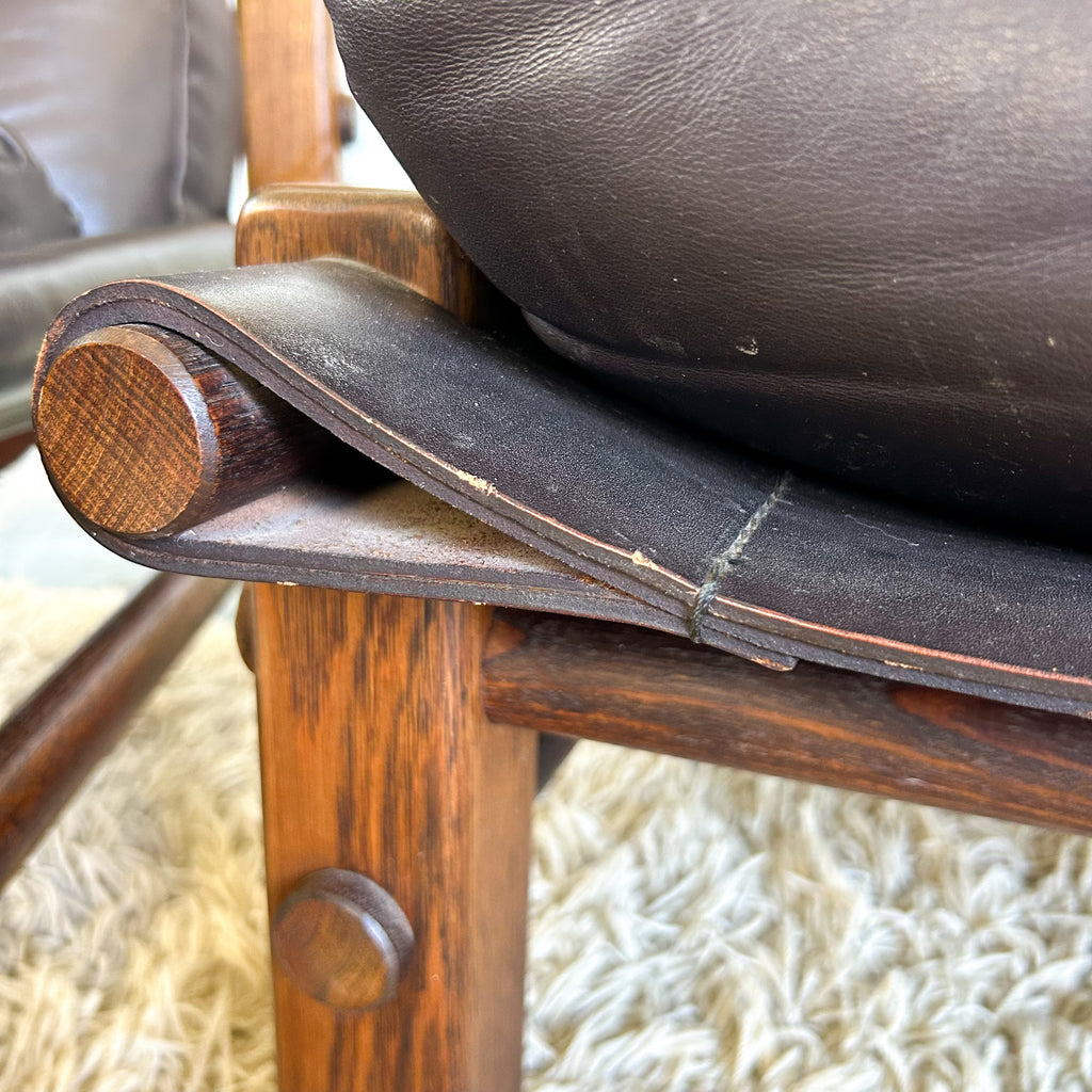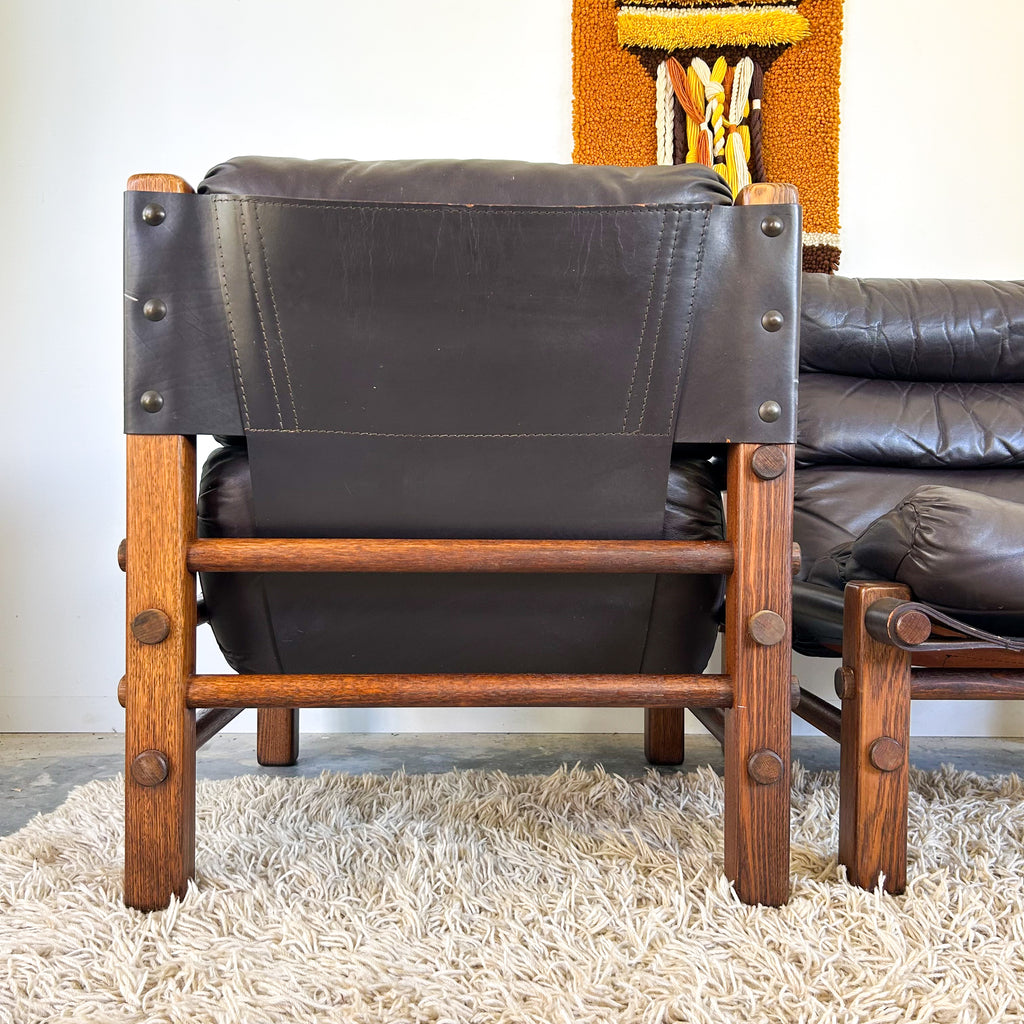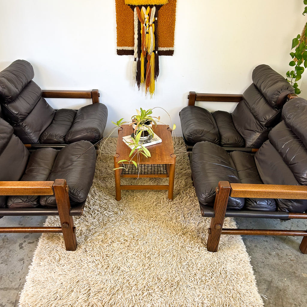 Vintage NORE modular sofas, designed in 1973 by Norman Archibald and manufactured in Melbourne. Each sofa comprises of two modules, each with one arm. They can be used as a two seater couch, or separated to enjoy as armchairs. Frames are constructed from Eucalyptus and feature thick hide leather slings with dark brown full grain leather cushions. Each cushion is held in place with 3 strong zips, and can be removed for cleaning. These are exceptional quality sofas, displaying beautiful joinery and are an important piece of historical Australian design. NGV hold pieces from the NORE range in their collection. Incredibly comfortable!!