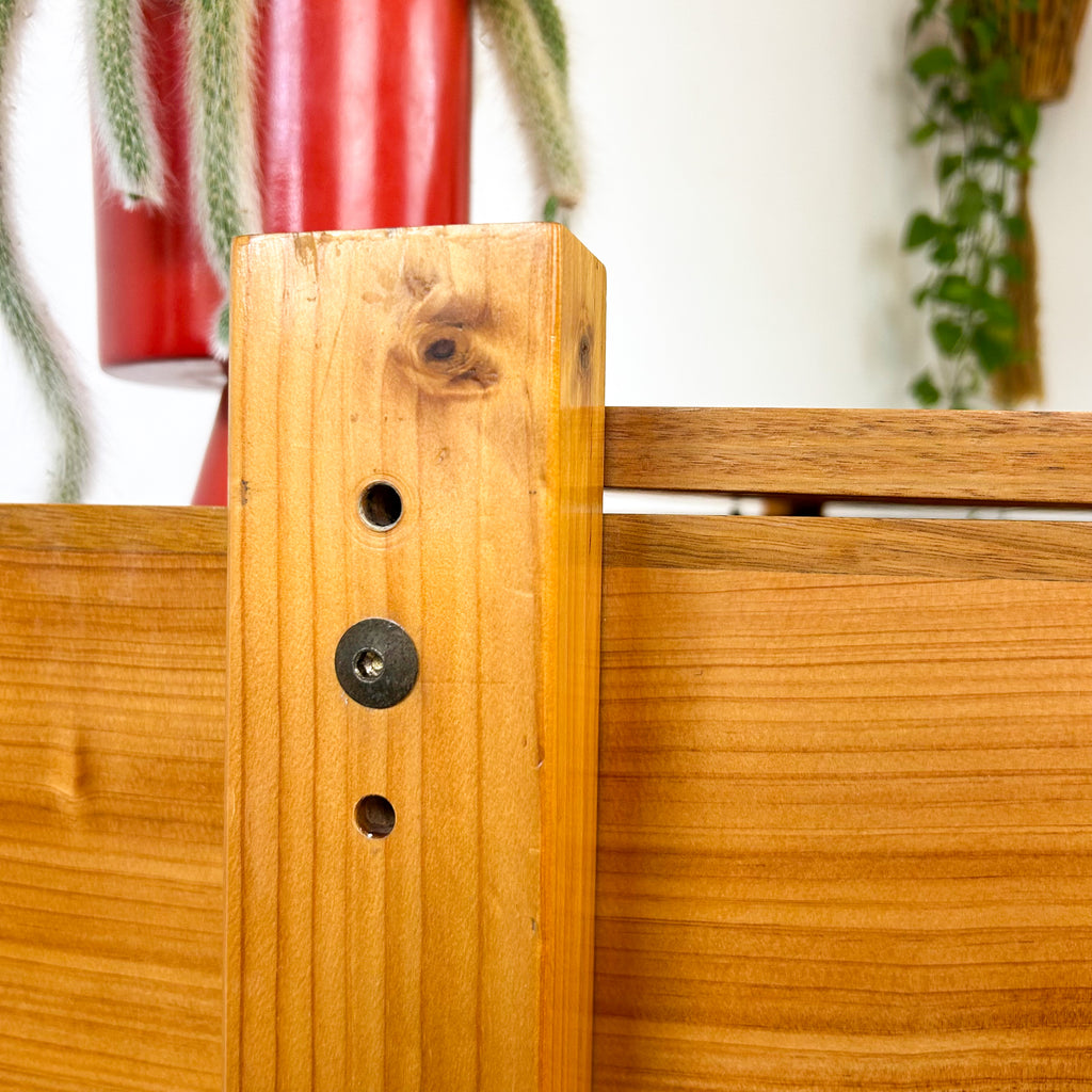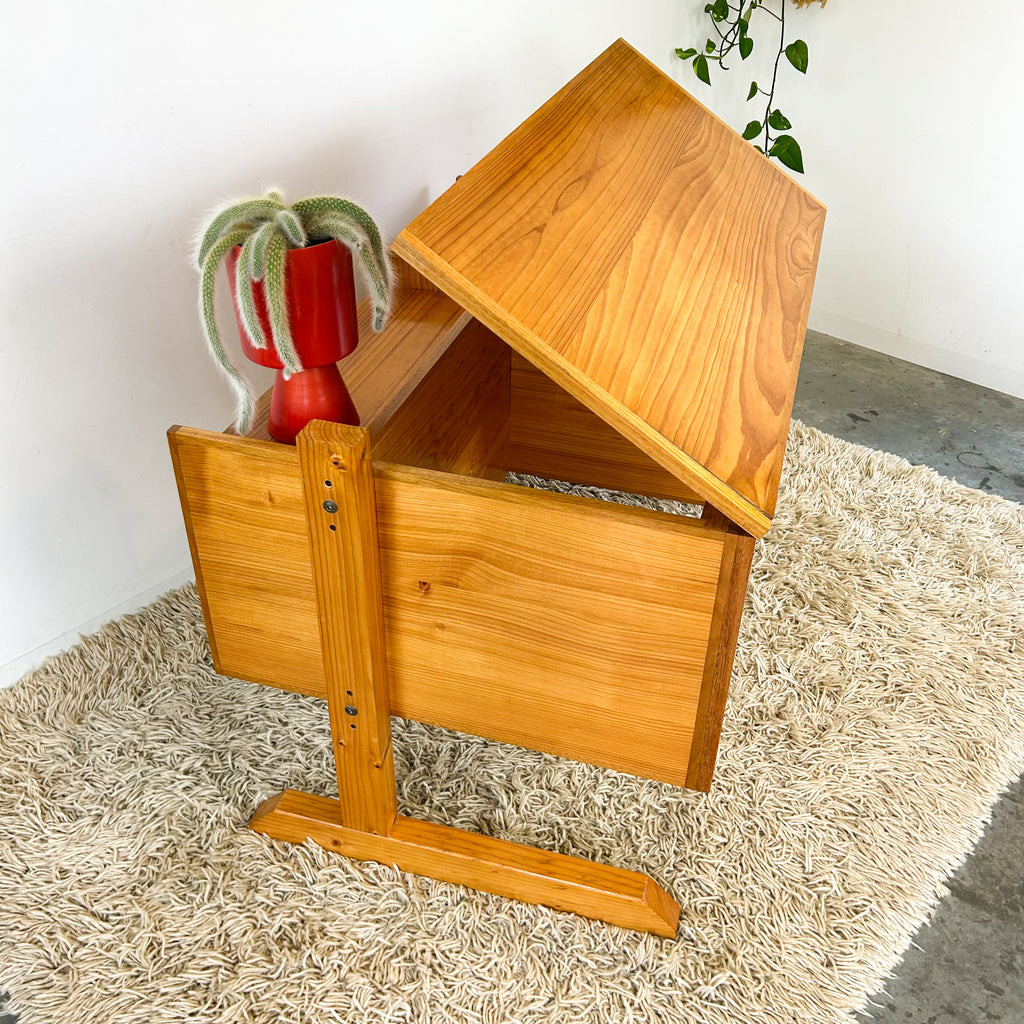 Vintage solid pine desk on pedestal base with so much to offer. The height can be adjusted to 3 different levels as required. It transforms into a drafting table, by tilting the tabletop surface and locking in place as desired. There's two drawers on the right - a slim drawer up top and a nice deep one below. AND on the front, it has more open storage again! Meaning you can actually use this in the middle of a room and fill it with books, folders, stationery etc.