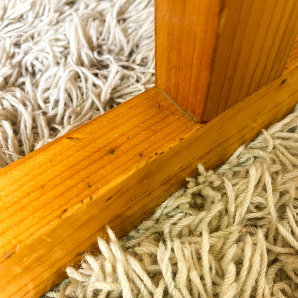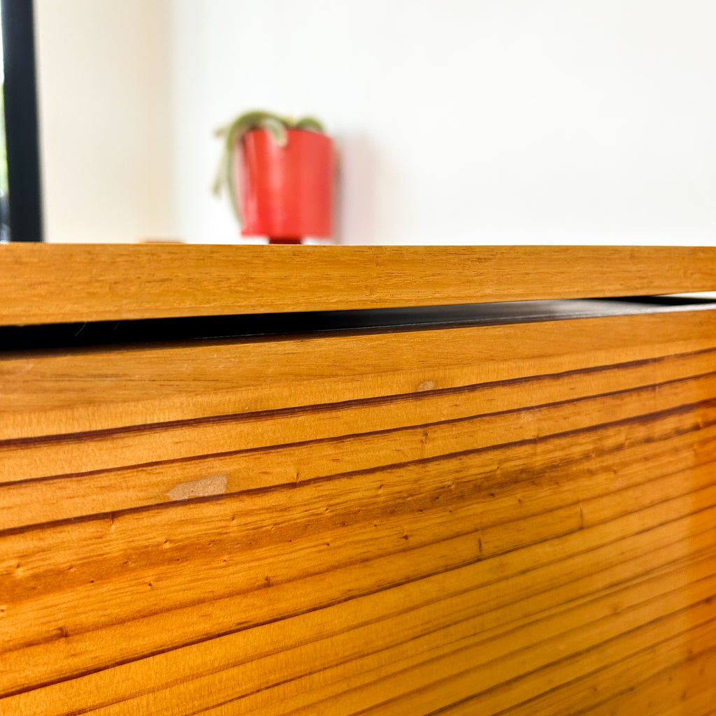 Excellent condition. Some light scuffs, dings, marks, but it's a fantastic piece! The bottom larger drawer is rather heavy & a bit sticky, it doesn't glide as smoothly as the top one.